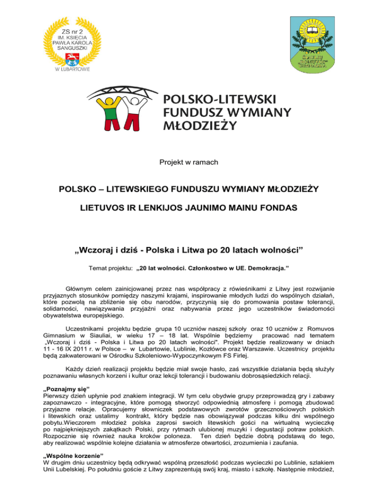 Projekt w ramach POLSKO – LITEWSKIEGO FUNDUSZU WYMIANY MŁODZIEŻY LIETUVOS IR LENKIJOS JAUNIMO MAINU FONDAS „Wczoraj i dziś - Polska i Litwa po 20 latach wolności” Temat projektu: „20 lat wolności. Członkostwo w UE. Demokracja.” Głównym celem zainicjowanej przez nas współpracy z rówieśnikami z Litwy jest rozwijanie przyjaznych stosunków pomiędzy naszymi krajami, inspirowanie młodych ludzi do wspólnych działań, które pozwolą na zbliżenie się obu narodów, przyczynią się do promowania postaw tolerancji, solidarności, nawiązywania przyjaźni oraz nabywania przez jego uczestników świadomości obywatelstwa europejskiego. Uczestnikami projektu będzie grupa 10 uczniów naszej szkoły oraz 10 uczniów z Romuvos Gimnasium w Siauliai, w wieku 17 – 18 lat. Wspólnie będziemy pracować nad tematem „Wczoraj i dziś - Polska i Litwa po 20 latach wolności". Projekt będzie realizowany w dniach 11 - 16 IX 2011 r. w Polsce – w Lubartowie, Lublinie, Kozłówce oraz Warszawie. Uczestnicy projektu będą zakwaterowani w Ośrodku Szkoleniowo-Wypoczynkowym FS Firlej. Każdy dzień realizacji projektu będzie miał swoje hasło, zaś wszystkie działania będą służyły poznawaniu własnych korzeni i kultur oraz lekcji tolerancji i budowaniu dobrosąsiedzkich relacji. „Poznajmy się” Pierwszy dzień upłynie pod znakiem integracji. W tym celu obydwie grupy przeprowadzą gry i zabawy zapoznawczo - integracyjne, które pomogą stworzyć odpowiednią atmosferę i pomogą zbudować przyjazne relacje. Opracujemy słowniczek podstawowych zwrotów grzecznościowych polskich i litewskich oraz ustalimy kontrakt, który będzie nas obowiązywał podczas kilku dni wspólnego pobytu.Wieczorem młodzież polska zaprosi swoich litewskich gości na wirtualną wycieczkę po najpiękniejszych zakątkach Polski, przy rytmach ulubionej muzyki i degustacji potraw polskich. Rozpocznie się również nauka kroków poloneza. Ten dzień będzie dobrą podstawą do tego, aby realizować wspólnie kolejne działania w atmosferze otwartości, zrozumienia i zaufania. „Wspólne korzenie” W drugim dniu uczestnicy będą odkrywać wspólną przeszłość podczas wycieczki po Lublinie, szlakiem Unii Lubelskiej. Po południu goście z Litwy zaprezentują swój kraj, miasto i szkołę. Następnie młodzież, pracując w grupach międzynarodowych, stworzy drzewo genealogiczne patrona naszej szkoły, z uwzględnieniem jego litewskich korzeni. Po całodziennych przygodach historycznych młodzi ludzie odpoczną podczas wieczoru litewskiego. Rozpocznie się także nauka kroków narodowego tańca litewskiego. „Drogi do niepodległości” Na ten dzień zaplanowaliśmy wycieczkę do Galerii Socrealizmu w Kozłówce. Po zapoznaniu się z realiami życia w socjalistycznym państwie i obejrzeniu prezentacji multimedialnych pt. „ Drogi do wolności” młodzież przystąpi do wykonania plakatów. Przedstawi w nim ludzi i wydarzenia, dzięki którym Europa Środkowo- Wschodnia odzyskała niepodległość. Na zakończenie dnia zorganizowany zostanie wieczór międzynarodowy, a w nim dyskoteka, karaoke i niekończące się rozmowy o życiu, nauce i dniu codziennym w poszczególnych krajach i wspólnej Europie. „My w wolnej Europie” Ten dzień spędzimy pod znakiem Unii Europejskiej. Młodzież będzie uczestniczyć w quizie o Unii Europejskiej. Następnie grupa polska wcieli się w rolę przewodników po Lubartowie. Pokażemy kolegom z Litwy zabytki Lubartowa , a także to, co zmieniło się w naszym mieście w ciągu 20 lat wolności. Zadaniem gości będzie, na podstawie starych fotografii Lubartowa, rozpoznać te miejsca i je sfotografować. Zdjęcia te zostaną wykorzystane do przygotowania wystawy „Lubartów i Siauliai - dawniej i dziś”. Wieczorem odbędzie się ognisko oraz gry i zabawy sportowe. „Z demokracją na Ty” Ten dzień spędzimy w Warszawie. Pokażemy piękno naszej stolicy i jej zabytki. Podczas wizyty w Sejmie RP planujemy spotkanie z posłem p. Marianem Starownikiem. Wieczorem podzielimy się wrażeniami – Warszawa i Polska widziana oczyma uczestników wycieczki. „Czas rozstania” Ostatniego dnia w murach szkoły odbędzie się seminarium podsumowujące. Młodzież zaprezentuje społeczności szkolnej oraz zaproszonym gościom, to wszystko co wypracowała. Cały projekt będzie utrwalany kamerą. Uczestnicy przygotują film - kronikę, który pokażą na tym spotkaniu. Posłuży on także do upowszechniania efektów wymiany młodzieży w Polsce i na Litwie. Działania realizowane będą z wykorzystaniem takich metod, jak: warsztaty tematyczne, praca w grupach międzynarodowych, wizyty studyjne, gry dydaktyczne, wycieczki a także rozmowy nieformalne, zabawy, wspólne śpiewanie, tańce oraz zajęcia sportowe. Metody te pozwolą uczestnikom projektu odkrywać wspólną przeszłość, stworzą możliwość zaprezentowania kultury własnego miasta i państwa. Będą także pomocne w budowaniu przyjaznych relacji, stworzeniu dogodnej przestrzeni dla formowania się nowych przyjaźni i kształtowaniu postawy poszanowania norm i wartości innych osób. W wyniku działań zrealizowanych w ramach projektu uczniowie zdobędą wiedzę na temat historii i kultury obu państw oraz zasad funkcjonowania przed i po wstąpieniu do Unii Europejskiej. Udział w projekcie pozwoli zdobyć interkulturową świadomość oraz wgląd w sposób życia i myślenia innej narodowości. Pomoże to kształcić tolerancję i zrozumienie dla innej kultury oraz zachęci do upowszechniania postaw inspirujących współpracę oraz promujących wspólne dziedzictwo. Działania pozwolą także zrozumieć, jak ogromny wpływ na przyszłość narodu oraz pozytywne stosunki między państwami mają młodzi ludzie. Efekty realizacji projektu będą pokazane na szkolnych tablicach ogłoszeń, a także zostaną wykonane gazetki promujące wspólne działania polskiej i litewskiej młodzieży tak, żeby w