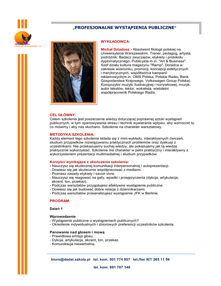 „PROFESJONALNE L DA WYSTĄPIENIA PUBLICZNE” WYKŁADOWCA: DE Centr um Szkoleniowe s.c. Michał Dziadosz - Absolwent filologii polskiej na Uniwersytecie Warszawskim. Trener, pedagog, artysta, podróżnik. Badacz zwyczajów, etykiety i protokołu dyplomatycznego. Publicysta m.in. "Art & Business". Szef działu kultura magazynu "Ramp". Doradca w zakresie wizerunku, promocji, koncepcji estetycznych i merytorycznych, współtwórca kampanii reklamowych(m.in. OMS Polska, Polskie Radio, Bank Gospodarstwa Krajowego, Volkswagen Group Polska). Kompozytor muzyki ilustracyjnej i rozrywkowej, muzyk, autor tekstów, lektor, wokalista, wieloletni współpracownik Polskiego Radia. CEL GŁÓWNY: Celem szkolenia jest poszerzenie wiedzy dotyczącej poprawnej sztuki wystąpień publicznych, w tym opanowywania stresu i technik wywierania wpływu, aby wzmocnić to co mówimy i aby nas słuchano. Szkolenie na charakter warsztatowy. METODYKA SZKOLENIA: Każdy element tego szkolenia składa się z mini-wykładu, interaktywnych ćwiczeń, studium przypadków rozwiązywaniu praktycznych problemów oraz dyskusji z uczestnikami. Nie przekazujemy suchej wiedzy, ale pokazujemy jak tą wiedzę praktycznie wykorzystać. Szkolenie ma charakter w pełni praktyczny i interaktywny z wykorzystaniem prezentacji multimedialnej i studium przypadków. Korzyści wynikające z ukończenia szkolenia: - Nauczysz się skutecznej komunikacji interpersonalnej i autoprezentacji. - Dowiesz się jak skutecznie współpracować z mediami. - Poznasz zasady etykiety i savoir vivre. - Nauczysz się reagować na gafy, wpadki i przejęzyczenia (dykcja, artykulacja, akcent, ton, przekaz). - Podczas warsztatów przygotujesz efektywne wystąpienie publiczne. - Dowiesz się jak budować dobre relacje z dziennikarzami. - Podczas warsztatów przeanalizujesz wystąpienie JFK w Berlinie. PROGRAM: Dzień 1 Wprowadzenie - Wystąpienie publiczne o wystąpieniach publicznych? - Określenie indywidualnych i zbiorowych preferencji uczestników szkolenia. Panowanie nad głosem i mową - Prawidłowa emisja głosu. - Dykcja, artykulacja, akcent, ton, przekaz. - Komunikacja niewerbalna. [email protected] tel. kom. 501 774 957 tel./fax /67/ 265 11 56 tel. kom. 691 707 140 L DA DE Centrum Szkoleniowe s.c. Jak zaplanować i zrealizować przekonujące wystąpienie? - Przygotowanie. - Analiza audytorium. - Aspekty mentalne i techniczne. - Pięć sposobów na dobre rozpoczęcie prezentacji. - Wzór wystąpienia doskonałego. - Różne warianty konstrukcyjne. - Różne warianty finałów. - Skupianie uwagi. - Motywowanie słuchaczy. - Multimedia. Jak zapanować nad tremą? - Zdefiniowanie zjawiska - Różne sposoby na pokonanie tremy - Techniki relaksacyjne Skuteczna współpraca z mediami - Media jako narzędzie do budowania wizerunku - Dekalog współpracy z dziennikarzami - Specyfika kontaktów z prasą, radiem i telewizją - Jak budować dobre relacje z dziennikarzami? - Wykorzystanie Internetu i nowoczesnych technologii w komunikacji i budowie wizerunku - Reagowanie na niepochlebne lub niespodziewane komentarze i opinie Dzień 2 Prezencja, czyli jakim cię widzą... - Dress code. - Elementy etykiety biznesowej. Inspirujące i porywające wystąpienia publiczne - Wzór wystąpienia doskonałego. - Analiza wystąpienia JFK w Berlinie. - Odpowiadanie na pytania. Zajęcia praktyczne - Profesjonalna praca z mikrofonem. - Praca z kamerą i mikrofonem. CZAS TRWANIA: 16 godzin dydaktycznych. CENA: Do indywidualnego uzgodnienia, uzależniona od wielkości grupy. Zapraszamy do kontaktu z Centrum Szkoleniowym „DEDAL” s.c. [email protected] tel. kom. 501 774 957 tel./fax /67/ 265 11 56 tel. kom. 691 707 140