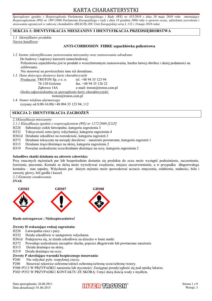 KARTA CHARAKTERYSTKI Sporządzono zgodnie z Rozporządzenie Parlamentu Europejskiego i Rady (WE) nr 453/2010 z dnia 20 maja 2010 roku zmieniający Rozporządzeniem (WE) nr 1907/2006 Parlamentu Europejskiego i rady z dnia 18 grudnia 2006 roku w sprawie oceny, udzielania zezwolenia i stosowania ograniczeń w zakresie chemikaliów (REACH) (DU Unii Europejskiej seria L 133 z 31maja 2010 roku) SEKCJA 1: IDENTYFIKACJA MIESZANINY I IDENTYFIKACJA PRZEDSIĘBIORSTWA 1.1 Identyfikator produktu Nazwa handlowa: ANTI-CORROSION FIBRE szpachlówka poliestrowa 1.2 Istotne zidentyfikowane zastosowania mieszaniny oraz zastosowania odradzane Do budowy i naprawy karoserii samochodowej. Poliestrowa szpachlówka jest to produkt o wszechstronnym zastosowaniu, bardzo łatwej obróbce i dużej podatności na szlifowanie. Nie stosować na powierzchnie inne niż doradzane. 1.3 Dane dotyczące dostawcy karty charakterystyki Producent: TROTON Sp. z o. o. tel. +48 94 35 123 94 78-120 Gościno fax. +48 94 35 126 22 Ząbrowo 14A e-mail: [email protected] Osoba odpowiedzialna za sporządzenie karty charakterystyki: [email protected] 1.4 Numer telefonu alarmowego (czynny od 8:00-16:00)+48 094 35 123 94; 112 SEKCJA 2: IDENTYFIKACJA ZAGROŻEŃ 2.1Klasyfikacja mieszaniny 2.1.1 Klasyfikacja zgodnie z rozporządzeniem (WE) nr 1272/2008 [CLP] H226 Substancje ciekłe łatwopalne, kategoria zagrożenia 3 H332 Toksyczność ostra (przy wdychaniu), kategoria zagrożenia 4 H361d Działanie szkodliwe na rozrodczość, kategoria zagrożeń 2 H372 Działanie toksyczne na narządy docelowe – narażenie powtarzane, kategoria zagrożeń 1 H315 Działanie żrące/drażniące na skórę, kategoria zagrożenia 2 H319 Poważne uszkodzenie oczu/działanie drażniące na oczy, kategoria zagrożenia 2 Szkodliwe skutki działania na zdrowie człowieka: Przy znacznych stężeniach par lub bezpośrednim dostaniu się produktu do oczu może wystąpić podrażnienie, zaczernienie, łzawienie, pieczenie. Kontakt ze skórą może wywoływać swędzenie, miejsce zaczerwienienie, a w przypadku długotrwałego kontaktu – stan zapalny. Wdychanie par dużym stężeniu może spowodować uczucie zmęczenia, osłabienie, nudności, bóle i zawroty głowy, ból gardła i kaszel. 2.2 Elementy oznakowania ZNAK GHS02 GHS07 GHS08 Hasło ostrzegawcze : Niebezpieczeństwo! Zwroty H wskazujące rodzaj zagrożenia: H226 Łatwopalna ciecz i pary. H332 Działa szkodliwie w następstwie wdychania. H361d Podejrzewa się, że działa szkodliwie na dziecko w łonie matki H372 Powoduje uszkodzenie narządów słuchu, poprzez długotrwałe lub powtarzane narażenie H315 Działa drażniąco na skórę. H319 Działa drażniąco na oczy. Zwroty P określające warunki bezpiecznego stosowania: P260 Nie wdychać pyłu rozpylonej cieczy. P280 Stosować rękawice ochronne/odzież ochronną/ochronę oczu/ochronę twarzy. P308+P313 W PRZYPADKU narażenia lub styczności: Zasięgnąć porady/zgłosić się pod opiekę lekarza. P302+P352 W PRZYPADKU KONTAKTU ZE SKÓRĄ: Umyć dużą ilością wody z mydłem. Data sporządzenia: 26.06.2011 Data aktualizacji: 01.06.2015 Strona 1 z 9 Wersja: 3 P305+P351+P338 W PRZYPADKU DOSTANIA SIĘ DO OCZU: Ostrożnie płukać wodą przez kilka minut. Wyjąć soczewki kontaktowe, jeżeli są i można je łatwo usunąć. Nadal płukać. P304+P340 W PRZYPADKU DOSTANIA SIĘ DO DRÓG ODDECHOWYCH: wyprowadzić lub wynieść poszkodowanego na świeże powietrze i zapewnić warunki do odpoczynku w pozycji umożliwiającej swobodne oddychanie P501Zawartość/pojemnik usuwać zgodnie z miejscowymi/ regionalnymi/ krajowymi/międzynarodowymi przepis Zawiera: styren 2.3 Inne zagrożenia Składniki mieszaniny nie są zaliczone do kategorii vPvB ani do PBT zgodnie z załącznikiem XIII. Produkt w postaci wysoce-lepiej cieczy. Mieszanina cięższa od wody i nierozpuszczalna w wodzie. Wydziela toksyczne gazy w przypadku pożaru. SEKCJA 3: SKŁAD/INFORMACJE O SKŁADNIKACH 3.2Mieszaniny Skład/informacje o składnikach: Nazwa substancji: Styren Numer rejestracji REACH: 01-2119457861-32-XXXX nr indeksowy 601-026-00-0 nr CAS 100-42-5 nr WE 202-851-5 Ułamek masowy w% 10-15 Klasyfikacja zgodna z Rozporządzeniem (WE)nr 1272/2008* Klasy Kody zwrotów zagrożenie i wskazujących kody rodzaj kategorii zagrożenia Flam. Liq. 3 Repr. 2 Acute Tox. 4 STOT RE 1 Skin Irrit. 2 Eye Irrit. 2 H226 H361d H332 H372 (narząd słuchu) H315 H319 Pełne brzmienie użytych zwrotów i symboli w sekcji 16 karty. *Rozporządzenie Parlamentu Europejskiego i Rady (WE) nr 1272/2008 z dnia 16 grudnia 2008r. w sprawie klasyfikacji, oznakowania i pakowania substancji i mieszanin, zmieniające i uchylające dyrektywy 67/548/EWG i 1999/45/WE oraz zmieniające rozporządzenie (WE) nr 1907/2006 (Dz. Urz. UE L 353 z 31 grudnia 2008r.z póz. zmianami). SEKCJA 4: ŚRODKI PIERWSZEJ POMOCY 4.1 Opis środków pierwszej pomocy Natychmiastowa pomoc lekarska nie jest konieczna. Wyprowadzić poszkodowanego na świeże powietrze. Zalecania ogólne: Powinny być przestrzegane środki ostrożności jak przy pracy z chemikaliami. Jeżeli wystąpią jakiekolwiek niepokojące objawy, wezwać pomoc medyczną. Symptomy zatrucia mogą wystąpić dopiero po kilku godzinach, dlatego kontrola lekarska jest niezbędna, co najmniej przez 48 godzin od wypadku. Po narażeniu inhalacyjnym: Wyprowadzić poszkodowanego na świeże powietrze, zapewnić spokój, okryć kocem. Jeżeli objawy nie ustępują, wezwać pomoc medyczną. W przypadku, gdy osoba poszkodowana jest nieprzytomna, ułożyć ją w pozycji bezpiecznej (np. pozycji bocznej ustalonej), niezwłocznie wezwać pomoc medyczną Po połknięciu: Wypłukać usta dużą ilością wody. Jeżeli nastąpi połknięcie, nie powodować wymiotów, ponieważ istnieje ryzyko zachłyśnięcia się i przedostania się substancji do płuc W przypadku połknięcia - zapewnić natychmiastową pomoc medyczną, pokazać kartę charakterystyki lub etykietę. W wyniku kontaktu z oczami: Wyją