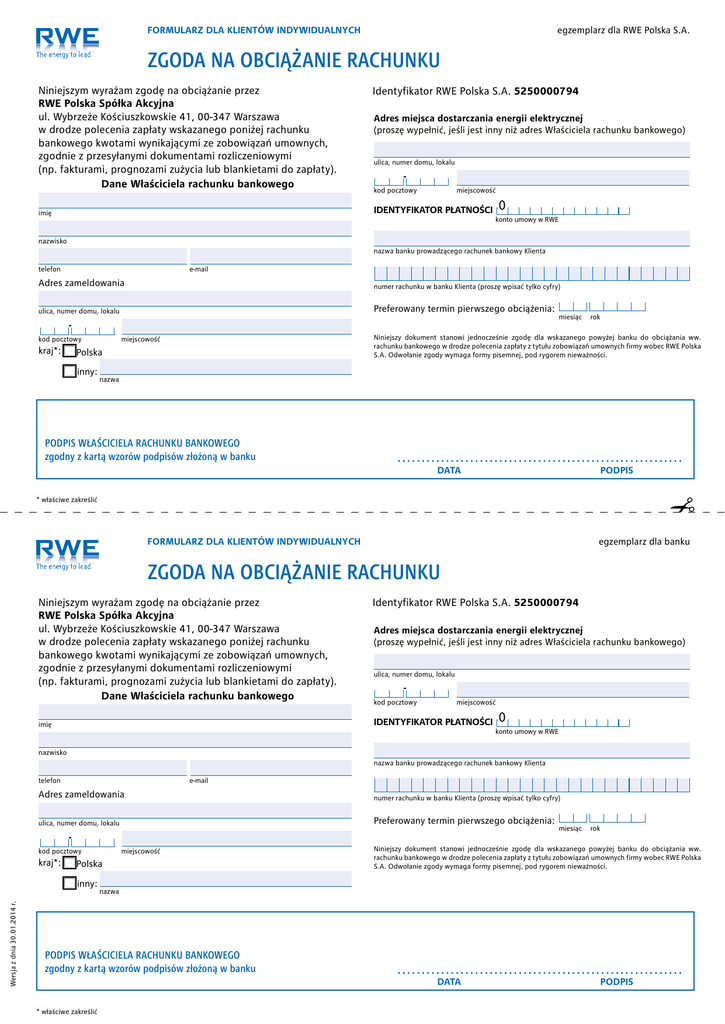 FORMULARZ DLA Klientów Indywidualnych egzemplarz dla RWE Polska S.A. ZGODA NA OBCIĄŻANIE RACHUNKU Niniejszym wyrażam zgodę na obciążanie przez RWE Polska Spółka Akcyjna ul. Wybrzeże Kościuszkowskie 41, 00-347 Warszawa w drodze polecenia zapłaty wskazanego poniżej rachunku bankowego kwotami wynikającymi ze zobowiązań umownych, zgodnie z przesyłanymi dokumentami rozliczeniowymi (np. fakturami, prognozami zużycia lub blankietami do zapłaty). Dane Właściciela rachunku bankowego Identyfikator RWE Polska S.A. 5250000794 Adres miejsca dostarczania energii elektrycznej (proszę wypełnić, jeśli jest inny niż adres Właściciela rachunku bankowego) ulica, numer domu, lokalu kod pocztowy miejscowość IDENTYFIKATOR PŁATNOŚCI imię 0 konto umowy w RWE nazwisko nazwa banku prowadzącego rachunek bankowy Klienta telefon e-mail Adres zameldowania numer rachunku w banku Klienta (proszę wpisać tylko cyfry) ulica, numer domu, lokalu Preferowany termin pierwszego obciążenia: kod pocztowy kraj*: Polska inny: miesiącrok Niniejszy dokument stanowi jednocześnie zgodę dla wskazanego powyżej banku do obciążania ww. rachunku bankowego w drodze polecenia zapłaty z tytułu zobowiązań umownych firmy wobec RWE Polska S.A. Odwołanie zgody wymaga formy pisemnej, pod rygorem nieważności. miejscowość nazwa PODPIS WŁAŚCICIELA RACHUNKU BANKOWEGO zgodny z kartą wzorów podpisów złożoną w banku ........................................................... DATA PODPIS * właściwe zakreślić egzemplarz dla banku FORMULARZ DLA Klientów Indywidualnych ZGODA NA OBCIĄŻANIE RACHUNKU Niniejszym wyrażam zgodę na obciążanie przez RWE Polska Spółka Akcyjna ul. Wybrzeże Kościuszkowskie 41, 00-347 Warszawa w drodze polecenia zapłaty wskazanego poniżej rachunku bankowego kwotami wynikającymi ze zobowiązań umownych, zgodnie z przesyłanymi dokumentami rozliczeniowymi (np. fakturami, prognozami zużycia lub blankietami do zapłaty). Dane Właściciela rachunku bankowego Identyfikator RWE Polska S.A. 5250000794 Adres miejsca dostarczania energii elektrycznej (proszę wypełnić, jeśli jest inny niż adres Właściciela rachunku bankowego) ulica, numer domu, lokalu kod pocztowy miejscowość IDENTYFIKATOR PŁATNOŚCI imię 0 konto umowy w RWE nazwisko nazwa banku prowadzącego rachunek bankowy Klienta telefon e-mail Adres zameldowania numer rachunku w banku Klienta (proszę wpisać tylko cyfry) ulica, numer domu, lokalu Preferowany termin pierwszego obciążenia: kod pocztowy kraj*: Polska inny: miejscowość miesiącrok Niniejszy dokument stanowi jednocześnie zgodę dla wskazanego powyżej banku do obciążania ww. rachunku bankowego w drodze polecenia zapłaty z tytułu zobowiązań umownych firmy wobec RWE Polska S.A. Odwołanie zgody wymaga formy pisemnej, pod rygorem nieważności. Wersja z dnia 30.01.2014 r. nazwa PODPIS WŁAŚCICIELA RACHUNKU BANKOWEGO zgodny z kartą wzorów podpisów złożoną w banku * właściwe zakreślić ........................................................... DATA PODPIS