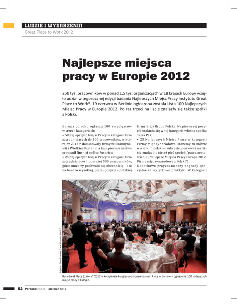 LUDZIE I WYDARZENIA Great Place to Work 2012 Najlepsze miejsca pracy w Europie 2012 250 tys. pracowników w ponad 1,5 tys. organizacjach w 18 krajach Europy wzięło udział w tegorocznej edycji badania Najlepszych Miejsc Pracy Instytutu Great Place to Work®. 19 czerwca w Berlinie ogłoszona została Lista 100 Najlepszych Miejsc Pracy w Europie 2012. Po raz trzeci na liscie znalazły się także spółki z Polski. firmy Elica Group Polska. Na pierwszej pozycji znalazła się w tej kategorii włoska spółka Tetra Pak; • 25 Najlepszych Miejsc Pracy w kategorii Firmy Międzynarodowe. Możemy tu mówić o wielkim polskim sukcesie, ponieważ na liście znalazało się aż pięć spółek (patrz zestawienie „Najlepsze Miejsca Pracy Europa 2012. Firmy międzynarodowe z Polski”). Dodatkowo przy znano trzy nagrody specjalne za wyjątkowe praktyki. W kategorii Zdjęcie: Gero Breloer, Great Place to Work® Europa co rok u ogłasza 100 z w ycięzców w trzech kategoriach: • 50 Najlepszych Miejsc Pracy w kategorii firm zatrudniających do 500 pracowników, w której w 2012 r. dominowały firmy ze Skandynawii i Wielkiej Brytanii, a laur pierwszeństwa przypadł fińskiej spółce Futurice; • 25 Najlepszych Miejsc Pracy w kategorii firm zatrudniajacych powyżej 500 pracowników, gdzie możemy pochwalić się obecnością – i to na bardzo wysokiej, piątej pozycji – polskiej Gala Great Place to Work® 2012 w kompleksie kongresowo-konerencyjnym Axica w Berlinie – ogłoszenie 100 najlepszych miejsc pracy w Europie. 52 Personelplus | sierpień2012 Kultura oparta na zaufaniu Tradycją już jest, że każdego roku Gale Europejskie odbywają się w innej stolicy, najczęściej siedzibie oddziału Instytutu GPtW®. Tegoroczna, wieczorna uroczystość odbyła się w przepięknym, zaprojektowanym przez Franka O. Gehry kompleksie kongresowo-konferencyjnym Axica w sąsiedztwie Bramy Branderburskiej i ogromnej strefy kibica zorganizowanej na obrzeżach tzw. Tiergarten (Zwierzyniec), czyli Dużego Parku w dawnym Centrum Berlina Zachodniego. Zaproszeni przedstawiciele wyróżnionych firm oraz ich opiekunowie ► Najlepsze Miejsca Pracy Europa 2012. Firmy międzynarodowe z Polski Pozycja Nazwa Branża Zdjęcie: Gero Breloer, Great Place to Work® „Zaangażowanie pracowników” otrzymała ją Merck Sharp & Dohme, farmaceutyczna firma z Irlandii. Nagrodę specjalną w kategorii „Inspiracja, duma” otrzymała Reitengruppen z Norwegii, firma z branży sprzedaży detalicznej, hurtowej i franchisy. Natomiast nagroda specjalna w kategorii „Transparentna Komunikacja” trafiła do firmy Futurice z Finladii działającej w branży konsultingu IT i oprogramowania. W poprzednich edycjach na listach europejskich znalazły się: w 2010 r. Grupa IKEA oraz Bristol-Myers Squibb, natomiast w 2011 r. aż siedem firm: Microsoft, S.C. Johnson, Novartis, Amgen, Hilti, EMC oraz Baxter. Obecność polskich spółek na europejskich listach świadczy o tym, że polityka personalna, która często jest implementowana według wzorców firm-matek, nie tylko elastycznie dopasowuje się do naszych specyficznych potrzeb, ale także koresponduje z polskimi warunkami. To oznacza, że nie musimy już mieć kompleksów wobec Europy i świata. Od lewej: Frank Abbenhuijs – Snr. Dyrektor HR Western Europe & Ireland w Microsoft odbiera statuetkę dla najlepszego miejsca pracy w Europie w kategorii firmy międzynarodowej z rąk Jannika Krohla Falcka – CEO GPtW®, Norwegia. W drugim planie Frank Hauser – CEO GPtW® Niemcy. z lokalnych biur GPtW® licznie przybyli, aby celebrować tę wyjątkową dla nich okazję. • Wszystkie firmy uhonorowane obecnością na Europejskiej Liście Najlepszych Miejsc Pracy Instytutu Great Place to Work® zbudowały kulturę organizacyjną opartą na zaufaniu. To jest standardem nie tylko w Europie, ale na całym świecie – powiedział José Tolovi Jr, Prezes Zarządu Great Place to Work®. I dodał: „Kraj, branża czy wielkość firmy nie mają znaczenia. Te wspaniałe firmy – czy to w warunkach wzrostu, czy też napięcia gospodarczego – dostrzegają wagę kultury pracy opartej na zaufaniu, dumie i koleżeństwie oraz pozytywny wpływ, jaki ta kultura może mieć na wyniki biznesowe”. Na ogłoszenie czeka jeszcze Światowa Lista Najlepszych Miejsc Pracy 2012. To jednak nastąpi jesienią.■ Pełną „Listę Najlepszych Miejsc Pracy Europa 2012” można znaleźć: www.gratplacetowork. net/best-companies/europe. 1 Microsoft IT/Software 3 SAS Institute IT 5 Elica Group Polska Produkcyjna (AGD) 11 Medtronic Polska Sprzęt medyczny 16 S.C. Johnson FMCG/Chemiczna Z Instytutem Great Place to Work® 25 Novo Nordisk Pharma Biotechnologiczna i farmaceutyczna związana od 2008 r. Sylwia Bryzek-Kotowska starszy konsultant oraz audytor w zespole Culture Audit®. sierpień2012 | Personelplus 53
