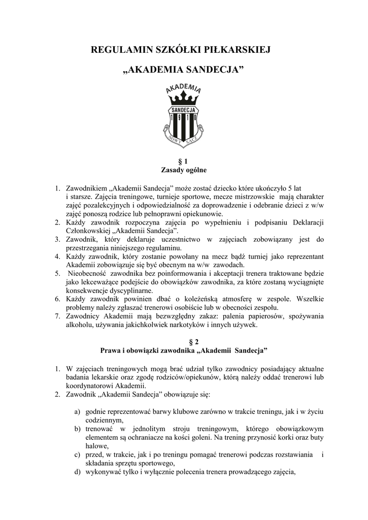 REGULAMIN SZKÓŁKI PIŁKARSKIEJ „AKADEMIA SANDECJA”