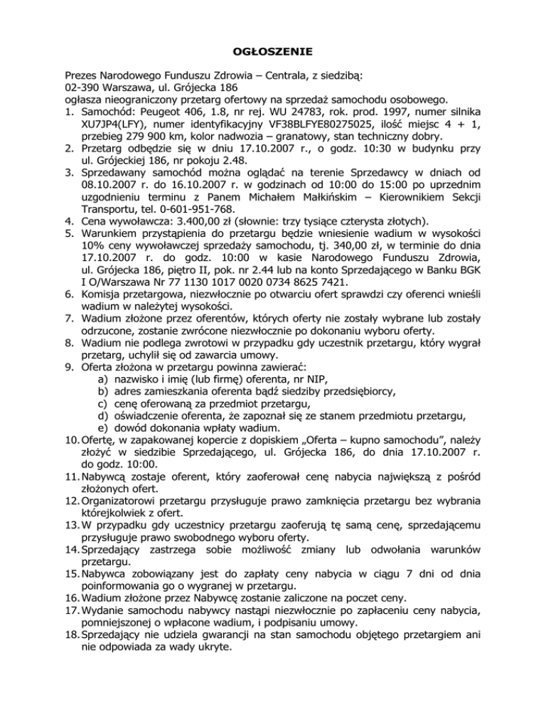 OGŁOSZENIE Prezes Narodowego Funduszu Zdrowia – Centrala, z siedzibą: 02-390 Warszawa, ul. Grójecka 186 ogłasza nieograniczony przetarg ofertowy na sprzedaż samochodu osobowego. 1. Samochód: Peugeot 406, 1.8, nr rej. WU 24783, rok. prod. 1997, numer silnika XU7JP4(LFY), numer identyfikacyjny VF38BLFYE80275025, ilość miejsc 4 + 1, przebieg 279 900 km, kolor nadwozia – granatowy, stan techniczny dobry. 2. Przetarg odbędzie się w dniu 17.10.2007 r., o godz. 10:30 w budynku przy ul. Grójeckiej 186, nr pokoju 2.48. 3. Sprzedawany samochód można oglądać na terenie Sprzedawcy w dniach od 08.10.2007 r. do 16.10.2007 r. w godzinach od 10:00 do 15:00 po uprzednim uzgodnieniu terminu z Panem Michałem Małkińskim – Kierownikiem Sekcji Transportu, tel. 0-601-951-768. 4. Cena wywoławcza: 3.400,00 zł (słownie: trzy tysiące czterysta złotych). 5. Warunkiem przystąpienia do przetargu będzie wniesienie wadium w wysokości 10% ceny wywoławczej sprzedaży samochodu, tj. 340,00 zł, w terminie do dnia 17.10.2007 r. do godz. 10:00 w kasie Narodowego Funduszu Zdrowia, ul. Grójecka 186, piętro II, pok. nr 2.44 lub na konto Sprzedającego w Banku BGK I O/Warszawa Nr 77 1130 1017 0020 0734 8625 7421. 6. Komisja przetargowa, niezwłocznie po otwarciu ofert sprawdzi czy oferenci wnieśli wadium w należytej wysokości. 7. Wadium złożone przez oferentów, których oferty nie zostały wybrane lub zostały odrzucone, zostanie zwrócone niezwłocznie po dokonaniu wyboru oferty. 8. Wadium nie podlega zwrotowi w przypadku gdy uczestnik przetargu, który wygrał przetarg, uchylił się od zawarcia umowy. 9. Oferta złożona w przetargu powinna zawierać: a) nazwisko i imię (lub firmę) oferenta, nr NIP, b) adres zamieszkania oferenta bądź siedziby przedsiębiorcy, c) cenę oferowaną za przedmiot przetargu, d) oświadczenie oferenta, że zapoznał się ze stanem przedmiotu przetargu, e) dowód dokonania wpłaty wadium. 10. Ofertę, w zapakowanej kopercie z dopiskiem „Oferta – kupno samochodu”, należy złożyć w siedzibie Sprzedającego, ul. Grójecka 186, do dnia 17.10.2007 r. do godz. 10:00. 11. Nabywcą zostaje oferent, który zaoferował cenę nabycia największą z pośród złożonych ofert. 12. Organizatorowi przetargu przysługuje prawo zamknięcia przetargu bez wybrania którejkolwiek z ofert. 13. W przypadku gdy uczestnicy przetargu zaoferują tę samą cenę, sprzedającemu przysługuje prawo swobodnego wyboru oferty. 14. Sprzedający zastrzega sobie możliwość zmiany lub odwołania warunków przetargu. 15. Nabywca zobowiązany jest do zapłaty ceny nabycia w ciągu 7 dni od dnia poinformowania go o wygranej w przetargu. 16. Wadium złożone przez Nabywcę zostanie zaliczone na poczet ceny. 17. Wydanie samochodu nabywcy nastąpi niezwłocznie po zapłaceniu ceny nabycia, pomniejszonej o wpłacone wadium, i podpisaniu umowy. 18. Sprzedający nie udziela gwarancji na stan samochodu objętego przetargiem ani nie odpowiada za wady ukryte. …………………………………… /imię i nazwisko/ …………………………………… /adres/ …………………………………… …………………………………… /nr NIP/ …………………………………… /telefon kontaktowy/ …………………………, dnia ………………… OŚWIADCZENIE Ja niżej podpisany oświadczam, że zapoznałem się z warunkami postępowania przetargowego określonymi w ogłoszeniu o przetargu na sprzedaż samochodu oraz z treścią wzoru umowy. Akceptuję warunki udziału w postępowaniu oraz po zapoznaniu się ze stanem technicznym pojazdu składam ofertę na zakup samochodu marki Peugeot 406 za kwotę …………………… zł (słownie: ………………………………………………………….. zł). W załączeniu dowód wpłaty kwoty wadium. Wyrażam zgodę aby w przypadku wyboru mojej oferty jako najkorzystniejszej pod względem oferowanej ceny, kwota wadium zaliczona została na poczet ceny. ……………………………………………………………. /podpis/ UMOWA SPRZEDAŻY Nr .................... zawarta w dniu ........................ w Warszawie, pomiędzy Narodowym Funduszem Zdrowia Centrala z siedzibą w Warszawie przy ul. Grójeckiej 186, NIP 107-00-01-057 zwanym dalej SPRZEDAJĄCYM, reprezentowanym przez: Pana Andrzeja Sośnierza – Prezesa Narodowego Funduszu Zdrowia a Panem(ią)…, legitymującym(ą) się dowodem osobistym seria …………….. nr ......................, wydanym dnia ......................... przez ..............................................................., zamieszkałym(ą) przy ul. ..................................., ......................, zwanym(ą) dalej „Kupującym”, o następującej treści: §1 1. Zgodnie z wynikiem przeprowadzonego przetargu nieograniczonego ofertowego na sprzedaż samochodu marki Peugeot 406, Sprzedawca będący właścicielem pojazdu oświadcza, że sprzedaje, a Kupujący nabywa samochód marki Peugeot 406 o numerze rejestracyjnym WU 24783, numerze silnika XU7JP4(LFY) oraz numerze identyfikacyjnym VF38BLFYE80275025, rok produkcji 1997 wraz z wyposażeniem wg protokołu przekazania będącego załącznikiem nr 1 do niniejszej umowy. 2. Samochód jest wolny od wad prawnych, nie jest obciążony prawami na rzecz osób trzecich oraz nie toczy się żadne postępowanie, którego przedmiotem jest ten pojazd ani nie stanowi on również przedmiotu zabezpieczenia. §2 Cenę sprzedaży samochodu zgodnie ze złożoną przez Kupującego ofertą ustala się na kwotę ............................... zł, słownie:............................................................................ §3 1. Na poczet ceny zaliczona zostaje kwota wadium w wysokości ............. zł. 2. Do zapłaty pozostaje kwota ................. zł brutto, którą Kupujący ureguluje przelewem na konto Sprzedawcy w ………….……, w terminie do dnia ............................ 3. Zapła