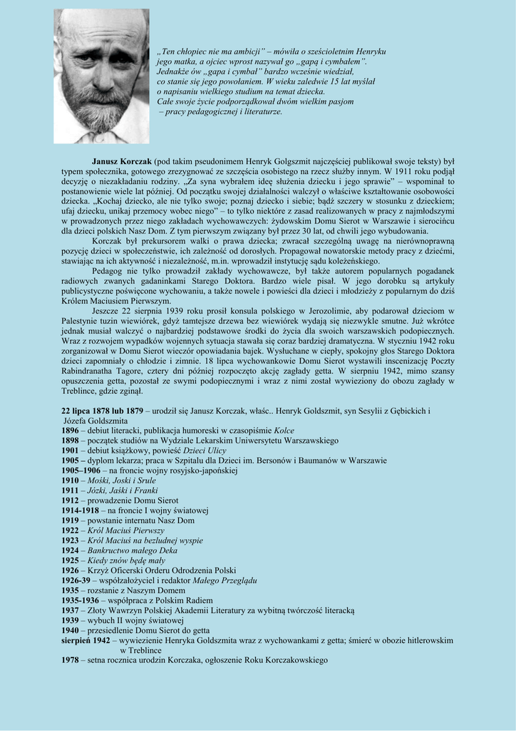 „Ten chłopiec nie ma ambicji” – mówiła o sześcioletnim Henryku jego matka, a ojciec wprost nazywał go „gapą i cymbałem”. Jednakże ów „gapa i cymbał” bardzo wcześnie wiedział, co stanie się jego powołaniem. W wieku zaledwie 15 lat myślał o napisaniu wielkiego studium na temat dziecka. Całe swoje życie podporządkował dwóm wielkim pasjom – pracy pedagogicznej i literaturze. Janusz Korczak (pod takim pseudonimem Henryk Golgszmit najczęściej publikował swoje teksty) był typem społecznika, gotowego zrezygnować ze szczęścia osobistego na rzecz służby innym. W 1911 roku podjął decyzję o niezakładaniu rodziny. „Za syna wybrałem ideę służenia dziecku i jego sprawie” – wspominał to postanowienie wiele lat później. Od początku swojej działalności walczył o właściwe kształtowanie osobowości dziecka. „Kochaj dziecko, ale nie tylko swoje; poznaj dziecko i siebie; bądź szczery w stosunku z dzieckiem; ufaj dziecku, unikaj przemocy wobec niego” – to tylko niektóre z zasad realizowanych w pracy z najmłodszymi w prowadzonych przez niego zakładach wychowawczych: żydowskim Domu Sierot w Warszawie i sierocińcu dla dzieci polskich Nasz Dom. Z tym pierwszym związany był przez 30 lat, od chwili jego wybudowania. Korczak był prekursorem walki o prawa dziecka; zwracał szczególną uwagę na nierównoprawną pozycję dzieci w społeczeństwie, ich zależność od dorosłych. Propagował nowatorskie metody pracy z dziećmi, stawiając na ich aktywność i niezależność, m.in. wprowadził instytucję sądu koleżeńskiego. Pedagog nie tylko prowadził zakłady wychowawcze, był także autorem popularnych pogadanek radiowych zwanych gadaninkami Starego Doktora. Bardzo wiele pisał. W jego dorobku są artykuły publicystyczne poświęcone wychowaniu, a także nowele i powieści dla dzieci i młodzieży z popularnym do dziś Królem Maciusiem Pierwszym. Jeszcze 22 sierpnia 1939 roku prosił konsula polskiego w Jerozolimie, aby podarował dzieciom w Palestynie tuzin wiewiórek, gdyż tamtejsze drzewa bez wiewiórek wydają się niezwykle smutne. Już wkrótce jednak musiał walczyć o najbardziej podstawowe środki do życia dla swoich warszawskich podopiecznych. Wraz z rozwojem wypadków wojennych sytuacja stawała się coraz bardziej dramatyczna. W styczniu 1942 roku zorganizował w Domu Sierot wieczór opowiadania bajek. Wysłuchane w ciepły, spokojny głos Starego Doktora dzieci zapomniały o chłodzie i zimnie. 18 lipca wychowankowie Domu Sierot wystawili inscenizację Poczty Rabindranatha Tagore, cztery dni później rozpoczęto akcję zagłady getta. W sierpniu 1942, mimo szansy opuszczenia getta, pozostał ze swymi podopiecznymi i wraz z nimi został wywieziony do obozu zagłady w Treblince, gdzie zginął. 22 lipca 1878 lub 1879 – urodził się Janusz Korczak, właśc.. Henryk Goldszmit, syn Sesylii z Gębickich i Józefa Goldszmita 1896 – debiut literacki, publikacja humoreski w czasopiśmie Kolce 1898 – początek studiów na Wydziale Lekarskim Uniwersytetu Warszawskiego 1901 – debiut książkowy, powieść Dzieci Ulicy 1905 – dyplom lekarza; praca w Szpitalu dla Dzieci im. Bersonów i Baumanów w Warszawie 1905–1906 – na froncie wojny rosyjsko-japońskiej 1910 – Mośki, Joski i Srule 1911 – Józki, Jaśki i Franki 1912 – prowadzenie Domu Sierot 1914-1918 – na froncie I wojny światowej 1919 – powstanie internatu Nasz Dom 1922 – Król Maciuś Pierwszy 1923 – Król Maciuś na bezludnej wyspie 1924 – Bankructwo małego Deka 1925 – Kiedy znów będę mały 1926 – Krzyż Oficerski Orderu Odrodzenia Polski 1926-39 – współzałożyciel i redaktor Małego Przeglądu 1935 – rozstanie z Naszym Domem 1935-1936 – współpraca z Polskim Radiem 1937 – Złoty Wawrzyn Polskiej Akademii Literatury za wybitną twórczość literacką 1939 – wybuch II wojny światowej 1940 – przesiedlenie Domu Sierot do getta sierpień 1942 – wywiezienie Henryka Goldszmita wraz z wychowankami z getta; śmierć w obozie hitlerowskim w Treblince 1978 – setna rocznica urodzin Korczaka, ogłoszenie Roku Korczakowskiego