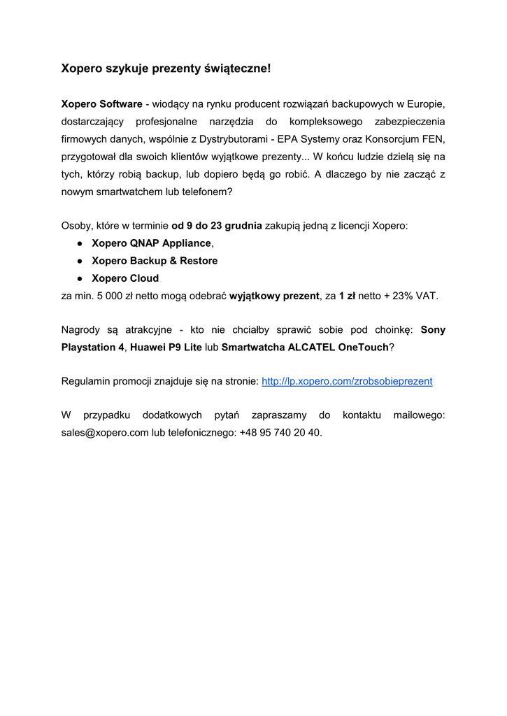 Xopero szykuje prezenty świąteczne! Xopero Software - wiodący na rynku producent rozwiązań backupowych w Europie, dostarczający profesjonalne narzędzia do kompleksowego zabezpieczenia firmowych danych, wspólnie z Dystrybutorami - EPA Systemy oraz Konsorcjum FEN, przygotował dla swoich klientów wyjątkowe prezenty... W końcu ludzie dzielą się na tych, którzy robią backup, lub dopiero będą go robić. A dlaczego by nie zacząć z nowym smartwatchem lub telefonem? Osoby, które w terminie od 9 do 23 grudnia zakupią jedną z licencji Xopero: ● Xopero QNAP Appliance, ● Xopero Backup & Restore ● Xopero Cloud za min. 5 000 zł netto mogą odebrać wyjątkowy prezent, za 1 zł netto + 23% VAT. Nagrody są atrakcyjne - kto nie chciałby sprawić sobie pod choinkę: Sony Playstation 4, Huawei P9 Lite lub Smartwatcha ALCATEL OneTouch? Regulamin promocji znajduje się na stronie: http://lp.xopero.com/zrobsobieprezent W przypadku dodatkowych pytań zapraszamy do [email protected] lub telefonicznego: +48 95 740 20 40. kontaktu mailowego: