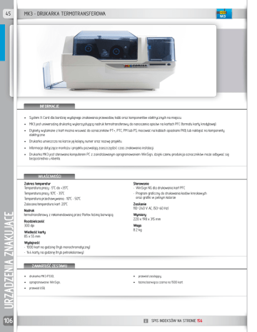 45 MK3 - DRUKARKA TERMOTRANSFEROWA INFORMACJE ++ System X-Card dla bardziej wydajnego znakowania przewodów, kabli oraz komponentów elektrycznych na miejscu. ++ MK3 jest uniwersalną drukarką wykorzystującą nadruk termotransferowy do nanoszenia opisów na kartach PFC (formatu karty kredytowej). ++ Etykiety wyłamane z kart można wsuwać do oznaczników PT+, PTC, PM lub PS, mocować na kablach opaskami PKB, lub naklejać na komponenty elektryczne. ++ Drukarka umieszcza na karcie jej kolejny numer oraz nazwę projektu. ++ Informacje dotyczące montażu i projektu pozwalają zaoszczędzić czas znakowania instalacji. ++ Drukarka MK3 jest sterowana komputerem PC z zainstalowanym oprogramowaniem WinSign, dzięki czemu produkcja oznaczników może odbywać się bezpośrednio u klienta. WŁAŚCIWOŚCI Zakres temperatur Temperatura pracy: -5°C do +35°C Sterowanie - WinSign NG dla drukowania kart PFC Temperatura pracy: 10°C - 35°C - Program graficzny do drukowania kodów kreskowych oraz grafiki w pełnym kolorze Temperatura przechowywania: -10°C - 50°C URZĄDZENIA ZNAKUJĄCE Zalecana temperatura kart: 20°C 106 Nadruk termotransferowy z rekomendowaną przez Partex taśmą barwiącą Rozdzielczość 300 dpi Wielkość karty 85 x 55 mm Zasilanie 110~240 V AC, (50~60 Hz) Wymiary 220 x 198 x 315 mm Waga 8.2 kg Wydajność - 1000 kart na godzinę (tryb monochromatyczny) - 144 karty na godzinę (tryb pełnokolorowy) ZAWARTOŚĆ ZESTAWU ++ drukarka MK3-P330, ++ przewód zasilający, ++ oprogramowanie WinSign, ++ taśma barwiąca czarna na 1500 kart, ++ przewód USB, SPIS INDEKSÓW NA STRONIE 156 SPECYFIKACJA ++ Karty ładowane są do specjalnego pojemnika-magazynku znajdującego się po prawej stronie urządzenia. ++ MK3 sterowana oprogramowaniem graficznym pozwala na drukowanie dowolnych znaków, kodów kreskowych oraz grafiki w pełnym kolorze. ++ Karta zostaje szybko zadrukowana a następnie umieszczona w pojemniku wyjściowym po lewej stronie drukarki. ++ Doskonale sprawdza się przy drukowaniu identfikatorów osobowych i dużych oznaczników kablowych. ++ Karta PFC z wyłamanymi elementami bocznymi może stanowić narzędzie montażowe przy aplikowaniu jej zadrukowanych elementów do przezroczystych uchwytów (PT+, PTC, PTZ, PM, PTM i PS). ++ Opcjonalnie może być wyposażona w programator paska magnetycznego. Nadruk przy użyciu MK3 jest szybki, czysty, czytelny i bardzo trwały opcjonalnie każda karta może zostać pokryta bezbarwną warstwą ochronną. ++ Elementy te mogą być montowane zarówno przed jak i po podłączeniu przewodów. ++ Oprogramowanie WinSign umożliwia także drukowanie tekstu oznaczników w różnym kolorze (np. cyfry w Międzynarodowym Kodzie Kolorów). SPIS INDEKSÓW NA STRONIE 156 TYP OPIS MK3-RB-BLACK taśma barwiąca do MK3 na 1500 kart czarna MK3-RB-YMCKO taśma barwiąca do MK3 na 200 kart YMCKO MK3-RB-YMCKO-CHIP taśma barwiąca do MK3 na 330 kart YMCKO z chip’em MK3-CC karty czyszczące do MK3 (10 szt.) MK3-CLEAN zestaw czyszczący 2 karty + patyczek MK3-CR rolka czyszcząca do MK3 MK3-PRG programator paska magnetycznego MK3-SOFT program graficzny do tworzenia kart plastikowych WSG-NC-INCL oprogramowanie WinSign URZĄDZENIA ZNAKUJĄCE AKCESORIA 107 MATERIAŁY DRUKOWANE PRZEZ MK3 KARTY PFC Z ETYKIETAMI TYP DŁUGOŚĆ [mm] SZEROKOŚĆ [mm] MATERIAŁ 12 15 18 21 30 33 4.5 4.5 4.5 4.5 4.5 7.5 ABS ABS ABS ABS ABS ABS PFC042 PFC07533 ILOŚĆ ETYKIET NA KARCIE 21 / kartę 21 / kartę 21 / kartę 21 / kartę 14 / kartę 9 / kartę DO STOSOWANIA Z OPAKOWANIE 25 kart 25 kart 25 kart 25 kart 25 kart 25 kart PT+, PTC, PM-10, PTM10, PTZ+ PTZ+ PFC09518 18 9.5 ABS 20 / kartę PM-20, PTM20, PM-24,PS-20 PFC09540 PFC09580 40 80 9.5 9.5 poliamid poliamid 8 / kartę 4 / kartę 2 opaski PKB 2 opaski PKB 25 kart 25 kart 25 kart PFC PATRZ STRONA 61 STANDARDOWY KOLOR: żółty, biały. KARTY PFC Z SAMOPRZYLEPNYMI ETYKIETAMI TYP DŁUGOŚĆ [mm] SZEROKOŚĆ [mm] MATERIAŁ ILOŚĆ ETYKIET NA KARCIE OPAKOWANIE PFC07014 14 7 poliester 25 / kartę 25 kart PFC12726 12.7 25.4 poliester 9 / kartę 25 kart PFC45080 45 80 poliester 1 / kartę 25 kart STANDARDOWY KOLOR: biały. KARTY PFC Z ETYKIETAMI TYP DŁUGOŚĆ [mm] SZEROKOŚĆ [mm] MATERIAŁ OPAKOWANIE PFC85055 85 55 PVC 100 kart PFCA85055 85 55 samoprzylepne PVC 100 kart STANDARDOWY KOLOR: biały, srebrny. Inne na życzenie. PEŁNE KARTY PFC URZĄDZENIA ZNAKUJĄCE PRODUKTY POWIĄZANE 108 PT+ PATRZ STRONA 18 PTC PATRZ STRONA 20 PM PATRZ STRONA 32 PTM PS PATRZ STRONA 34 PATRZ STRONA 58 PKB PATRZ STRONA 72 SPIS INDEKSÓW NA STRONIE 141