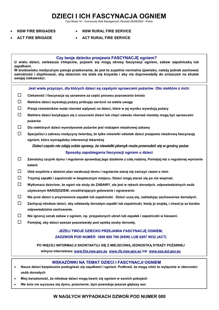 DZIECI I ICH FASCYNACJA OGNIEM Fact Sheet 15 – Community Risk Management. Revised 28/09/2004 - Polish • NSW FIRE BRIGADES • NSW RURAL FIRE SERVICE • ACT FIRE BRIGADE • ACT RURAL FIRE SERVICE Czy twoje dziecko przejawia FASCYNACJĘ ogniem? U wielu dzieci, zwłaszcza chłopców, pojawić się mogą okresy fascynacji ogniem, zabaw zapalniczką lub zapałkami. W środowisku medycznym panuje przekonanie, że jest to zupełnie normalne zjawisko, należy jednak zachować ostrożność i dopilnować, aby dzieciom nie stała się krzywda i aby nie doprowadziły do zniszczeń na skutek swojej ciekawości. Jest wiele przyczyn, dla których dzieci są częstymi sprawcami pożarów. Oto niektóre z nich: ! ! ! ! Ciekawość i fascynacja są uznawane za część procesu poznawania świata Niektóre dzieci wywołują pożary próbując zwrócić na siebie uwagę Presja rówieśników może również wpływać na dzieci, które w jej wyniku wywołują pożary Niektóre dzieci borykające się z uczuciami złości lub chęci odwetu również niestety mogą być sprawcami pożarów ! ! Dla niektórych dzieci wywoływanie pożarów jest rodzajem niezdrowej zabawy Specjaliści z zakresu medycyny twierdzą, że tylko niewielki odsetek dzieci przejawia niezdrową fascynację ogniem, która wymagałaby interwencji lekarskiej Dzieci często nie zdają sobie sprawy, że niewielki płomyk może przerodzić się w groźny pożar. Sposoby zapobiegania fascynacji ogniem u dzieci ! Zainstaluj czujnik dymu i regularnie sprawdzaj jego działanie z całą rodziną. Pamiętaj też o regularnej wymianie baterii. ! ! ! Ułóż wspólnie z dziećmi plan ewakuacji domu i regularnie staraj się ćwiczyć razem z nimi. Trzymaj zapałki i zapalniczki w bezpiecznym miejscu. Dzieci mogą starać się po nie wspinać. Wytłumacz dzieciom, że ogień nie służy do ZABAWY, ale jest w rękach dorosłych, odpowiedzialnych osób użytecznym NARZĘDZIEM, umożliwiającym gotowanie i ogrzewanie. ! ! Nie proś dzieci o przyniesienie zapałek lub zapalniczki. Dzieci uczą się, naśladując zachowaniae dorosłych. Zachęcaj młodsze dzieci, aby oddawały dorosłym zapałki lub zapalniczki, kiedy je znajdą, i chwal je za bardzo odpowiedzialne zachowanie. ! ! Nie ignoruj oznak zabaw z ogniem, np. przypalonych ubrań lub zapałek i zapalniczki w kieszeni. Pamiętaj, aby dzieci zawsze pozostawały pod opieką osoby dorosłej. JEŻELI TWOJE DZIECKO PRZEJAWIA FASCYNACJĘ OGNIEM, ZADZWOŃ POD NUMER: 1800 600 700 (NSW) LUB 6207 9032 (ACT) PO WIĘCEJ INFORMACJI SKONTAKTUJ SIĘ Z MIEJSCOWĄ JEDNOSTKĄ STRAŻY POŻARNEJ witryna internetowa: www.fire.nsw.gov.au www.rfs.nsw.gov.au lub www.esa.act.gov.au • WSKAZÓWKI NA TEMAT DZIECI I FASCYNACJI OGNIEM Naucz dzieci bezpiecznie posługiwać się zapałkami i ogniem. Podkreśl, że mogą robić to wyłącznie w obecności osób dorosłych • Miej świadomość, że młodsze dzieci mogą bawić się ogniem w swoich pokojach • We śnie nie wyczuwa się dymu, przeciwnie, dym powoduje jeszcze głębszy sen W NAGŁYCH WYPADKACH DZWOŃ POD NUMER 000