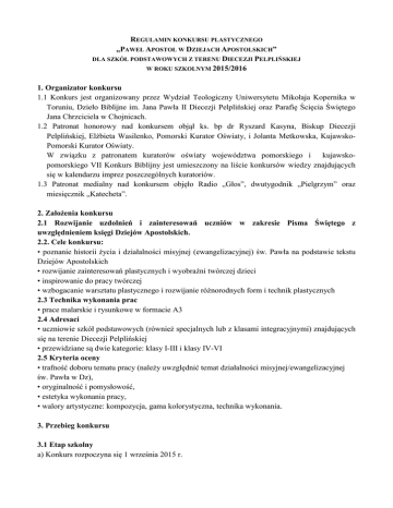 REGULAMIN KONKURSU PLASTYCZNEGO „PAWEŁ APOSTOŁ W DZIEJACH APOSTOLSKICH” DLA SZKÓŁ PODSTAWOWYCH Z TERENU DIECEZJI PELPLIŃSKIEJ W ROKU SZKOLNYM 2015/2016 1. Organizator konkursu 1.1 Konkurs jest organizowany przez Wydział Teologiczny Uniwersytetu Mikołaja Kopernika w Toruniu, Dzieło Biblijne im. Jana Pawła II Diecezji Pelplińskiej oraz Parafię Ścięcia Świętego Jana Chrzciciela w Chojnicach. 1.2 Patronat honorowy nad konkursem objął ks. bp dr Ryszard Kasyna, Biskup Diecezji Pelplińskiej, Elżbieta Wasilenko, Pomorski Kurator Oświaty, i Jolanta Metkowska, KujawskoPomorski Kurator Oświaty. W związku z patronatem kuratorów oświaty województwa pomorskiego i kujawskopomorskiego VII Konkurs Biblijny jest umieszczony na liście konkursów wiedzy znajdujących się w kalendarzu imprez poszczególnych kuratoriów. 1.3 Patronat medialny nad konkursem objęło Radio „Głos”, dwutygodnik „Pielgrzym” oraz miesięcznik „Katecheta”. 2. Założenia konkursu 2.1 Rozwijanie uzdolnień i zainteresowań uczniów w zakresie Pisma Świętego z uwzględnieniem księgi Dziejów Apostolskich. 2.2. Cele konkursu: • poznanie historii życia i działalności misyjnej (ewangelizacyjnej) św. Pawła na podstawie tekstu Dziejów Apostolskich • rozwijanie zainteresowań plastycznych i wyobraźni twórczej dzieci • inspirowanie do pracy twórczej • wzbogacanie warsztatu plastycznego i rozwijanie różnorodnych form i technik plastycznych 2.3 Technika wykonania prac • prace malarskie i rysunkowe w formacie A3 2.4 Adresaci • uczniowie szkół podstawowych (również specjalnych lub z klasami integracyjnymi) znajdujących się na terenie Diecezji Pelplińskiej • przewidziane są dwie kategorie: klasy I-III i klasy IV-VI 2.5 Kryteria oceny • trafność doboru tematu pracy (należy uwzględnić temat działalności misyjnej/ewangelizacyjnej św. Pawła w Dz), • oryginalność i pomysłowość, • estetyka wykonania pracy, • walory artystyczne: kompozycja, gama kolorystyczna, technika wykonania. 3. Przebieg konkursu 3.1 Etap szkolny a) Konkurs rozpoczyna się 1 września 2015 r. b) Do 31 października 2015 r. należy przesłać zgłoszenie szkoły do konkursu do ks. prał. Józefa Picka na adres mailowy: [email protected] (formularz zgłoszeniowy na końcu regulaminu). c) Finał etapu szkolnego konkursu przewiduje się nie później niż 15.01.2016. Termin ustala sam nauczyciel. Etap szkolny służy wyłonieniu najlepszych prac (po trzy w danej kategorii wiekowej), które zostaną przesłane na etap finalny (diecezjalny) konkursu. 3.2 Etap diecezjalny (finał) a) Etap diecezjalny rozpoczyna się 1 lutego 2015 r. b) Termin nadsyłania prac (po trzy w każdej kategorii wiekowej z danej szkoły): do 31.01. 2016 r. c) Prace powinny zawierać czytelną informację naklejoną na niewidocznej stronie pracy z następującymi danymi: • imię i nazwisko autora • wiek i klasa • nauczyciel prowadzący • nazwa i adres szkoły • adres mailowy nauczyciela prowadzącego d) Prace należy dostarczyć (pocztą lub osobiście) na adres: ks. prał. Józef Pick ul. bp. Dominika 8 83-200 Starogard Gd. e) Oceny prac dokona jury powołane przez organizatorów konkursu. e) Prace oceniane będą w następujących kategoriach: • uczniowie klas I-III szkół podstawowych • uczniowie klas IV-VI szkół podstawowych f) O wynikach laureaci zostaną powiadomieni drogą mailową nie później niż 31 marca 2016 r. 4. Uroczyste zakończenie konkursu a) Wybrane prace zostaną zaprezentowane na wystawie w parafii Ścięcia Jana Chrzciciela w Chojnicach 14 kwietnia 2016 r. b) Wręczenie nagród autorom nagrodzonych prac (laureaci) nastąpi 14 kwietnia 2016 r. w Bazylice Ścięcia Jana Chrzciciela w Chojnicach o godz. 14.30 podczas finału VII Konkursu Biblijnego Dzieła Biblijnego Diecezji Pelplińskiej. c) Nadesłane prace nie podlegają zwrotowi i stają się własnością organizatora. 6. Informacji o plastycznym konkursie biblijnym udziela: ks. prał. Józef Pick e-mail: [email protected] tel. 58 562 22 07 Strona internetowa konkursu biblijnego: www.prorok.edu.pl (zakładka z lewej strony: „VII Konkurs biblijny”)