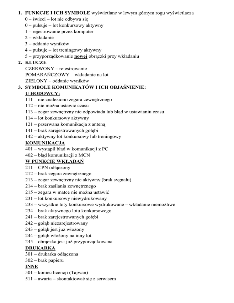 1. FUNKCJE I ICH SYMBOLE wyświetlane w lewym górnym rogu wyświetlacza 0 – świeci – lot nie odbywa się 0 – pulsuje – lot konkursowy aktywny 1 – rejestrowanie przez komputer 2 – wkładanie 3 – oddanie wyników 4 – pulsuje – lot treningowy aktywny 5 – przyporządkowanie nowej obrączki przy wkładaniu 2. KLUCZE CZERWONY – rejestrowanie POMARAŃCZOWY – wkładanie na lot ZIELONY – oddanie wyników 3. SYMBOLE KOMUNIKATÓW I ICH OBJAŚNIENIE: U HODOWCY: 111 – nie znaleziono zegara zewnętrznego 112 – nie moŜna ustawić czasu 113 – zegar zewnętrzny nie odpowiada lub błąd w ustawianiu czasu 114 – lot konkursowy aktywny 121 – przerwana komunikacja z anteną 141 – brak zarejestrowanych gołębi 142 – aktywny lot konkursowy lub treningowy KOMUNIKACJA 401 – wystąpił błąd w komunikacji z PC 402 – błąd komunikacji z MCN W PUNKCIE WKŁADAŃ 211 – CPN odłączony 212 – brak zegara zewnętrznego 213 – zegar zewnętrzny nie aktywny (brak sygnału) 214 – brak zasilania zewnętrznego 215 – zegara w matce nie moŜna ustawić 231 – lot konkursowy niewydrukowany 233 – wszystkie loty konkursowe wydrukowane – wkładanie niemoŜliwe 234 – brak aktywnego lotu konkursowego 241 – brak zarejestrowanych gołębi 242 – gołąb niezarejestrowany 243 – gołąb jest juŜ włoŜony 244 – gołąb włoŜony na inny lot 245 – obrączka jest juŜ przyporządkowana DRUKARKA 301 – drukarka odłączona 302 – brak papieru INNE 501 – koniec licencji (Tajwan) 511 – awaria – skontaktować się z serwisem 4. PRZED SEZONEM REJESTRACJA I PRZYPORZĄDKOWANIE OBRĄCZEK Rejestracji gołębi dokonuje się przy uŜyciu programu komputerowego AUTOKON (obsługa programu według instrukcji programu AUTOKON) Przyporządkowanie obrączek następuje poprzez program AUTOKON funkcja „Przyporządkuj atis” UWAGA!!! JeŜeli komisyjne przyporządkowanie nie moŜe odbyć się przy komputerze, moŜna dokonać wtórnego (nowego) komisyjnego przyporządkowania bez komputera, postępując w następujący sposób: - podłączyć Express do matki jak do wkładania na lot (Express juŜ z zarejestrowanymi gołębiami przez komputer) - autoryzacja pomarańczowym kluczem - wybrać strzałkami numer lotu i potwierdzić zielonym - 1 autoryzacja czerwonym kluczem - 2 strzałkami odszukać gołębia do przyporządkowania - 3 potwierdzić zielonym - 4 włoŜyć nową obrączkę do matki – obrączka zostanie automatycznie przyporządkowana wybranemu gołębiowi (gołąb zostaje jednocześnie włoŜony na lot) - dla przyporządkowania obrączki następnemu gołębiowi powtarzamy punkt 1-4 - po przyporządkowaniu obrączek wszystkim gołębiom następuje drukowanie protokołu rejestracji zielony 5 sekund (jednocześnie wydrukowana zostanie lista wkładań) Drukowanie listy zarejestrowanych gołębi: - podłączyć Express do CNN i CPN - trzymać czerwony i zielony jednocześnie - strzałkami wybrać funkcję 9.06 i potwierdzić zielonym - wyświetloną „1” potwierdzić zielonym – następuje wydruk listy Zarejestrowane gołębie (lista zawiera kody gołębi i kody obrączek elektronicznych) 5. PRZEBIEG LOTU 5.1 W PUNKCIE WKŁADAŃ KOMISYJNE USTAWIANIE CZASU W MATCE - podłączyć Express do matki - czerwony i zielony jednocześnie trzymać 5 sekund - strzałkami znaleźć 9.04 i potwierdzić zielonym. UWAGA! JeŜeli funkcji 9.04 nie moŜna otworzyć, oznacza to, Ŝe podłączono do matki aktywny zegar satelitarny, który automatycznie ustawiać będzie czas w podłączonych Expresach – moŜna, więc rozpocząć wkładanie. JeŜeli funkcja 9.04 zostaje otwarta to postępujemy jak poniŜej: - strzałkami znaleźć odpowiednią cyfrę i zatwierdzić zielonym (kolejno: rok, miesiąc, dzień, godzina: minuty: sekundy) UWAGA! Zatwierdzając ostatnią cyfrę (sekundy) uruchamiamy zegar w matce. Czas kaŜdego Expressa podłączonego do tej matki zostaje ustawiony według przeprowadzonego ustawienia. 5.2 WKŁADANIE GOŁĘBI NA LOT - podłączyć Express do matki - autoryzacja pomarańczowym kluczem (następuje automatyczne ustawienie czasu w Expressie przez zegar matki lub podłączony i aktywny zegar satelitarny) - wybrać strzałkami nr lotu i potwierdzić zielonym - wkładać gołębie – Expres wyświetla nr wkładanego gołębia oraz ilość włoŜonych gołębi - wydruk listy wkładań – zielony trzymać 5 sekund. 6. LOT U HODOWCY (0 pulsuje) Podłączyć Express do instalacji w gołębniku. UWAGA! Nie podłączać i nie odłączać anten pod napięciem. Gołębie powracające z lotu są konstatowane. 7. ODDANIE WYNIKÓW - podłączyć Express do matki - autoryzacja zielonym kluczem - wybrać strzałkami nr lotu i potwierdzić zielonym - drukowanie – zielony trzymać 5 sekund WYMAZANIE LOTU - wybrać strzałkami nr lotu i potwierdzić zielonym - czerwony trzymać 5 sekund - czerwony krótko – lot wymazany 8. PRZYPORZĄDKOWANIE NOWEJ OBRĄCZKI - podłączyć Express do matki jak do wkładania na lot - autoryzacja pomarańczowym kluczem - wybrać strzałkami numer lotu i potwierdzić zielonym - autoryzacja czerwonym kluczem - strzałkami odszukać gołębia do przyporządkowania - potwierdzić zielonym wyświetlony numer - włoŜyć nową obrączkę do matki – obrączka zostanie automatycznie przyporządkowana wybranemu gołębiowi (gołąb zostaje jednocześnie włoŜony na lot) - po włoŜeniu wszystkich gołębi wydrukować listę wkładań - zielony 5 sekund – automatycznie wydrukowana zostanie równieŜ lista Zarejestrowane gołębie z nowo przyporządkowaną obrączką. 9. LOT TRENINGOWY (4 pulsuje) - podłączyć Express do instalacji w gołębniku - zielony trzymać 5 sekund do krótkiego sygnału - zielony krótko potwierdzić - gołębie zarejestrowane w Expresie będą konstatowane WYMAZANIE LOTU TRENINGOWEGO - czerwony trzymać 5 sekund do krótkiego sygnału - czerwony krótko potwierdzić. 10. USTAWIANIE - trzymać 5 sekund czerwony i zielony jed