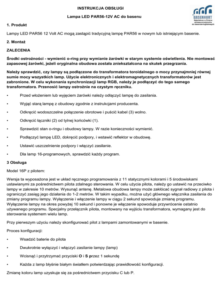 INSTRUKCJA OBSŁUGI Lampa LED PAR56-12V AC do basenu 1. Produkt Lampy LED PAR56 12 Volt AC mogą zastąpić tradycyjną lampę PAR56 w nowym lub istniejącym basenie. 2. MontaŜ ZALECENIA Środki ostroŜności - wymienić o-ring przy wymianie Ŝarówki w starym systemie oświetlenia. Nie montować zapasowej Ŝarówki, jeŜeli oryginalna obudowa została zniekształcona na skutek przegrzania. NaleŜy sprawdzić, czy lampy są podłączone do transformatora toroidalnego o mocy przynajmniej równej sumie mocy wszystkich lamp. UŜycie elektronicznych i elektromagnetycznych transformatorów jest zabronione. W celu wykonania synchronizacji lamp RGB, naleŜy je podłączyć do tego samego transformatora. Przenosić lampy ostroŜnie na czystym ręczniku. • Przed włoŜeniem lub wyjęciem Ŝarówki naleŜy odłączyć lampę do zasilania. • Wyjąć starą lampę z obudowy zgodnie z instrukcjami producenta. • Odkręcić wodoszczelne połączenie obrotowe i puścić kabel (3) wolno. • Odkręcić łączniki (2) od tylnej końcówki (1). • Sprawdzić stan o-ringu i obudowy lampy. W razie konieczności wymienić. • Podłączyć lampę LED, dokręcić podpory, i wstawić reflektor w obudowę. • Ustawić uszczelnienie podpory i włączyć zasilanie. • Dla lamp 16-programowych, sprawdzić kaŜdy program. 3 Obsługa Model 16P z pilotem: Wersja ta wyposaŜona jest w układ ręcznego programowania z 11 statycznymi kolorami i 5 środowiskami ustawianymi za pośrednictwem pilota zdalnego sterowania. W celu uŜycia pilota, naleŜy go ustawić na przeciwko lampy w zakresie 10 metrów. Wysunąć antenę. Metalowa obudowa lampy moŜe zakłócać sygnał radiowy z pilota i ograniczyć zasięg jego działania do 1-2 metrów. W takim wypadku, moŜna uŜyć głównego włącznika zasilania do zmiany programu lampy. Wyłączenie i włączenie lampy w ciągu 2 sekund spowoduje zmianę programu. Wyłączenie lampy na okres powyŜej 10 sekund i ponowne je włączenie spowoduje przywrócenie ostatnio uŜywanego programu. Specjalny przełącznik pilota, montowany na wyjściu transformatora, wymagany jest do sterowania systemem wielu lamp. Przy pierwszym uŜyciu naleŜy skonfigurować pilot z lampami zamontowanymi w basenie. Proces konfiguracji: • Wsadzić baterie do pilota • Dwukrotnie wyłączyć i włączyć zasilanie lampy (lamp) • Wcisnąć i przytrzymać przyciski O i S przez 1 sekundę • KaŜda z lamp błyśnie białym światłem potwierdzając prawidłowość konfiguracji. Zmianę koloru lamp uzyskuje się za pośrednictwem przycisku C lub P. 4. Gwarancja Lampa LED PAR56 jest objęta gwarancją przez 24 miesiące na defekty materiałowe i/lub produkcyjne (elementy elektroniczne) od daty dostawy. (Zachować fakturę/paragon zakupu) Lampa nie jest objęta gwarancją na problemy mające źródło w: wstrząsach zewnętrznych, zwarciach elektrycznych, lub nadmiernym dokręcaniu. Produkt nie jest objęty gwarancją w przypadku podłączenia go do nieprawidłowego zasilania elektrycznego. Warunkiem tej gwarancji jest ścisłe przestrzeganie instrukcji montaŜu i konserwacji. Zgodnie z warunkami gwarancji, producent lub dystrybutor jest zobowiązany do bezpłatnej wymiany lub naprawy produktu lub elementu wadliwego. Wszystkie pozostałe koszty ponosi nabywca. W celu dokonania naprawy produktu, naleŜy go poddać kontroli wykonanej przez producenta lub dystrybutora. Gwarancja jest niewaŜna w przypadku szkód widocznie spowodowanych przez uŜytkownika. Uszkodzenia produktu spowodowane przez uŜytkowanie, wady spowodowane niepoprawnym montaŜem i/lub zastosowaniem, i modyfikacje produktu przeprowadzane bez pisemnej zgody producenta takŜe nie są objęte gwarancją.