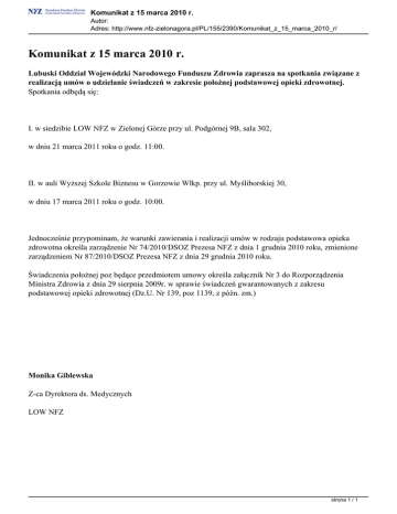 Komunikat z 15 marca 2010 r. Autor: Adres: http://www.nfz-zielonagora.pl/PL/155/2390/Komunikat_z_15_marca_2010_r/ Komunikat z 15 marca 2010 r. Lubuski Oddział Wojewódzki Narodowego Funduszu Zdrowia zaprasza na spotkania związane z realizacją umów o udzielanie świadczeń w zakresie położnej podstawowej opieki zdrowotnej. Spotkania odbędą się: I. w siedzibie LOW NFZ w Zielonej Górze przy ul. Podgórnej 9B, sala 302, w dniu 21 marca 2011 roku o godz. 11:00. II. w auli Wyższej Szkole Biznesu w Gorzowie Wlkp. przy ul. Myśliborskiej 30, w dniu 17 marca 2011 roku o godz. 10:00. Jednocześnie przypominam, że warunki zawierania i realizacji umów w rodzaju podstawowa opieka zdrowotna określa zarządzenie Nr 74/2010/DSOZ Prezesa NFZ z dnia 1 grudnia 2010 roku, zmienione zarządzeniem Nr 87/2010/DSOZ Prezesa NFZ z dnia 29 grudnia 2010 roku. Świadczenia położnej poz będące przedmiotem umowy określa załącznik Nr 3 do Rozporządzenia Ministra Zdrowia z dnia 29 sierpnia 2009r. w sprawie świadczeń gwarantowanych z zakresu podstawowej opieki zdrowotnej (Dz.U. Nr 139, poz 1139, z późn. zm.) Monika Giblewska Z-ca Dyrektora ds. Medycznych LOW NFZ strona 1 / 1 Powered by TCPDF (www.tcpdf.org)