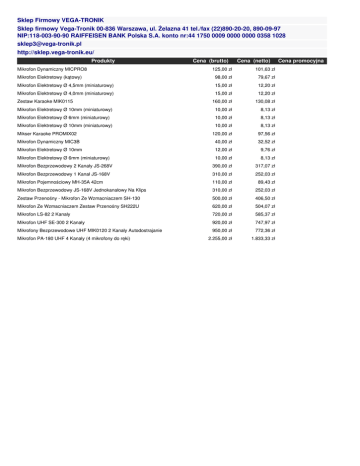 Sklep Firmowy VEGA-TRONIK Sklep firmowy Vega-Tronik 00-836 Warszawa, ul. Żelazna 41 tel./fax (22)890-20-20, 890-09-97 NIP:118-003-90-90 RAIFFEISEN BANK Polska S.A. konto nr:44 1750 0009 0000 0000 0358 1028 [email protected] http://sklep.vega-tronik.eu/ Produkty Mikrofon Dynamiczny MICPRO8 Cena (brutto) Cena (netto) 125,00 zł 101,63 zł Mikrofon Elektretowy (kątowy) 98,00 zł 79,67 zł Mikrofon Elektretowy Ø 4,5mm (miniaturowy) 15,00 zł 12,20 zł Mikrofon Elektretowy Ø 4,0mm (miniaturowy) 15,00 zł 12,20 zł 160,00 zł 130,08 zł Mikrofon Elektretowy Ø 10mm (miniaturowy) 10,00 zł 8,13 zł Mikrofon Elektretowy Ø 6mm (miniaturowy) 10,00 zł 8,13 zł Mikrofon Elektretowy Ø 10mm (miniaturowy) 10,00 zł 8,13 zł Zestaw Karaoke MIK0115 Mikser Karaoke PROMIX02 120,00 zł 97,56 zł Mikrofon Dynamiczny MIC3B 40,00 zł 32,52 zł Mikrofon Elektretowy Ø 10mm 12,00 zł 9,76 zł Mikrofon Elektretowy Ø 6mm (miniaturowy) 10,00 zł 8,13 zł Mikrofon Bezprzewodowy 2 Kanały JS-268V 390,00 zł 317,07 zł Mikrofon Bezprzewodowy 1 Kanał JS-168V 310,00 zł 252,03 zł Mikrofon Pojemnościowy MH-35A 42cm 110,00 zł 89,43 zł Mikrofon Bezprzewodowy JS-168V Jednokanałowy Na Klips 310,00 zł 252,03 zł Zestaw Przenośny - Mikrofon Ze Wzmacniaczem SH-130 500,00 zł 406,50 zł Mikrofon Ze Wzmacniaczem Zestaw Przenośny SH222U 620,00 zł 504,07 zł Mikrofon LS-82 2 Kanały 720,00 zł 585,37 zł Mikrofon UHF SE-300 2 Kanały 920,00 zł 747,97 zł Mikrofony Bezprzewodowe UHF MIK0120 2 Kanały Autodostrajanie 950,00 zł 772,36 zł 2.255,00 zł 1.833,33 zł Mikrofon PA-180 UHF 4 Kanały (4 mikrofony do ręki) Cena promocyjna
