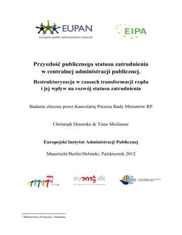 Przyszłość publicznego statusu zatrudnienia w centralnej administracji publicznej. Restrukturyzacja w czasach transformacji rządu i jej wpływ na rozwój statusu zatrudnienia Badanie zlecone przez Kancelarię Prezesa Rady Ministrów RP Christoph Demmke & Timo Moilanen1 Europejski Instytut Administracji Publicznej Maastricht/Berlin/Helsinki, Październik 2012 1 Ministerstwo Finansów, Finlandia. STRESZCZENIE2 1. Badania nad administracją publiczną przez długi czas skupiały się na państwie jako na suwerennej władzy z wyspecjalizowanym personelem. To pojęcie państwa i zapotrzebowanie na szczególną/swoistą kategorię pracowników sektora publicznego o szczególnych warunkach pracy stopniowo i nieustannie pojawiało się w renesansie i w okresie reformacji. 2. Status służby publicznej jest ściśle powiązany z państwem jako suwerenną władzą, z doktryną państwa prawa i zasadą legalizmu. Szczególny status i warunki pracy miały również na celu zapewnienie uczciwości i sprawiedliwości, wdrażanie systemu zasług oraz ochronę pracowników administracji publicznej przed arbitralnymi decyzjami administracyjnymi. 3. Hierarchiczna i sformalizowana struktura organizacyjna, przejrzyste i sztywne ścieżki kariery, dożywotnią posadę, zatrudnienie na pełnym etacie, system starszeństwa, korzystny system emerytalny i sztywne systemy wynagrodzeń, zostały tradycyjnie wprowadzone w celu ograniczenia w jak najwyższym stopniu ryzyka zbyt dużego wpływu politycznego, korupcji, nieetycznych zachowań, załatwiania prywatnych interesów i niestabilności rządów. W rezultacie tradycyjnym argumentem przemawiającym za szczególną strukturą organizacyjną było zapewnienie określonego statusu etycznego dla urzędników służby cywilnej, którzy powinni stać na straży dobra publicznego, neutralności, bezstronności oraz przestrzegać poufności i wykazywać się wiedzą ekspercką/ kompetencjami. Dlatego w wielu krajach urzędnicy służby cywilnej pracowali w zhierarchizowanych organizacjach, procedury ich naboru były specyficzne, urzędnicy mieli określone obowiązki etyczne, ich zatrudnienie cechowała mała mobilność, różne warunki pracy i szczególne systemy zabezpieczeń społecznych. 4. Ponadto odpowiedź na pytanie o to, komu należy przyznać status urzędnika służby cywilnej zawsze była powiązana z zadaniem wykonywania uprawnień publicznych i ochrony interesów państwa. Dlatego pojęcie urzędnika służby cywilnej zawsze opierało się na tradycyjnej ideologii państwa narodowego. 5. Obecnie zmianie uległy takie pojęcia, jak suwerenność, narodowość, obywatelstwo, wykonywanie uprawnień publicznych i ochrona ogólnego interesu. Najnowsze 2 Streszczenie dotyczy raportu z badania pt. “Przyszłość publicznego statusu zatrudnienia w centralnej administracji publicznej. Restrukturyzacja w czasach transformacji rządu i jej wpływ na rozwój statusu zatrudnienia”. Badanie zostało zlecone przez Kancelarię Prezesa Rady Ministrów, prowadzone w ramach prac Europejskiej Sieci ds. Administracji Publicznej (EUPAN), w trakcie prezydencji trzech krajów TRIO – Polski, Danii i Cypru. Ostateczna wersja raportu zaprezentowana zostanie podczas 59. Spotkania Dyrektorów Generalnych EUPAN w Nikozji podczas prezydencji cypryjskiej (5-6 grudnia 2012 r.). Autorami Badania są prof. Christoph Demmke (Europejski Instytut Administracji Publicznej, EIPA w Maastricht) oraz Timo Moilanen (Ministerstwo Finansów Republiki Finlandii). wydarzenia wskazują na zmianę modelu i sprawowania władzy państwowej, przejście od rządu do zarządzania, od hierarchii i państwa biurokratycznego do zarządzania w ramach i przez sieci, outsourcingu, partnerstw publiczno-prywatnych i organizacji hybrydowych. Dotychczas zmiana rządu miała wpływ na status jego personelu. Niemniej jak dotąd niewiele systematycznej pracy poświęcono kwestii powiązania pomiędzy „zarządzaniem zmianą” a „zmianą statusu” 6. Zmienia się również charakter pracy, etos pracy, wartości, skład siły roboczej i struktura wiekowa. Nie ma jasności co do tego, w jaki sposób zmiany te wpłyną na strukturę i status pracowników sektora publicznego. W ogólnym ujęciu ten proces wydaje się zmierzać ku procesowi „normalizacji”, jako że koncepcja „lewiatana” (oraz urzędnika służby cywilnej jako sługi monarchy, państwa, rządu, itp.) jest powoli zastępowane przez koncepcję urzędnika służby cywilnej jako służącego obywatelom. 7. Jednym z dotychczas lekceważonych skutków reform zarządzania publicznego ostatnich lat jest pozbawienie administracji krajowych jednego, spójnego paradygmatu czy ram koncepcyjnych. Obecnie zanikają dwie kluczowe koncepcje tradycyjnej administracji publicznej. Pierwsza zakłada, że rząd występuje w charakterze pojedynczego, jednolitego pracodawcy. Druga z nich to idea ujednoliconej służby cywilnej. Choć kiedyś większość pracowników sektora publicznego podlegała tym samym statutom i warunkom pracy, obecnie ich liczba maleje. 8. Pojęcie zatrudnienia w sektorze publicznym obejmuje różne kategorie pracowników, często różne kategorie pracowników zatrudnionych na zasadach mianowania (public law status) (urzędnicy państwowi, sędziowie, dyplomaci, funkcjonariusze policji, personel wojskowy) oraz pracowników zatrudnionych w oparciu o przepisy prawa pracy (labour law status). Często kwestie zatrudnienia w sektorze publicznym reguluje konstytucja (w niektórych krajach), różne statuty i różne przepisy. Są one również tematem dialogu społecznego. Ponadto zatrudnienie w sektorze publicznym powiązane jest ze strukturami państwowymi i administracyjnymi. Jednak bazując na faktach nie można udowodnić, że kraje zarządzane w sposób zdecentralizowany mają wyższy odsetek zatrudnienia w sektorze publicznym (względem całkowitego zatrudnienia).Nie można też udowodnić, że w przypadku rządów wyznających bardzie