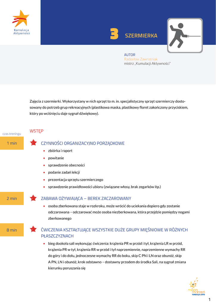 3 szermierka autor Radosław Zawrotniak mistrz „Kumulacji Aktywności” Zajęcia z szermierki. Wykorzystany w nich sprzęt to m. in. specjalistyczny sprzęt szermierczy dostosowany do potrzeb grup rekreacyjnych (plastikowa maska, plastikowy floret zakończony przyciskiem, który po wciśnięciu daje sygnał dźwiękowy). czas treningu 1 min wstęp Czynności organizacyjno porządkowe •• zbiórka i raport •• powitanie •• sprawdzenie obecności •• podanie zadań lekcji •• prezentacja sprzętu szermierczego •• sprawdzenie prawidłowości ubioru (związane włosy, brak zegarków itp.) 2 min Zabawa ożywiająca – berek zaczarowany •• osoba zberkowana staje w rozkroku, może wrócić do uciekania dopiero gdy zostanie odczarowana – odczarować może osoba niezberkowana, która przejdzie pomiędzy nogami zberkowanego 8 min Ćwiczenia kształtujące wszystkie duże grupy mięśniowe w różnych płaszczyznach •• bieg dookoła sali wykonując ćwiczenia: krążenia PR w przód i tył, krążenia LR w przód, krążenia PR w tył, krążenia RR w przód i tył naprzemiennie, naprzemienne wymachy RR do góry i do dołu, jednoczesne wymachy RR do boku, skip C PN i LN oraz obunóż, skip A PN, LN i obunóż, krok odstawno – dostawny przodem do środka Sali, na sygnał zmiana kierunku poruszania się 1 3 •• na sygnał: przysiad i wyskok w górę, naprzemienne wypady NN w przód co trzeci krok, naprzemienne wymachy NN w przód co trzeci krok, •• ćwiczenia w staniu w luźnej rozsypce: rozkrok i skłon tułowia naprzemiennie do nogi L i P, rozkrok i opad oraz skręt tułowia z dotknięciem dłonią raz do P raz do L nogi, naprzemienne wypady NN do boku z pogłębieniem, wypad w przód z przeskokiem i zmiana nóg wykrocznych, przeniesienie LR górą w tył a następnie PR dołem w tył starając się złączyć dłonie za plecami – po chwili zmiana na RR. Część główna 23 min Ćwiczenia techniczne •• nauka frontu: uczniowie robią front w prawo lub lewo, w zależności od preferencji. •• przyjmowanie postawy szermierczej z frontu: prowadzący zwraca uwagę na prawidłowe przedstawienie postawy, zwraca uwagę na błędy. Zabawy •• uczniowie leżą przodem, tyłem, siedzą w siadzie krzyżnym lub płaskim i na sygnał przyjmują postawę szermierczą •• uczniowie podskakują w miejscu w postawie szermierczej lub poruszając się w przód i tył podskakując w postawie szermierczej utrzymując odległość w podskokach •• nauka kroków szermierczych w przód i tył, utrzymywanie odległości z prowadzącym •• na sygnał prowadzącego uczniowie jak najszybciej podchodzą do środka Sali krokami szermierczymi w przód, wracają na miejsca krokami szermierczymi w tył •• uczniowie stoją w pozycji szermierczej naprzeciwko siebie w odległości ok. 1,5 metra, osoba z pary kładzie woreczek na stopie nogi wykrocznej i poprzez kopnięcie stara się podać woreczek drugiej osobie •• jedna osoba z pary trzyma woreczek na ręce, uczniowie stoją w pozycji szermierczej naprzeciwko siebie i na sygnał prowadzącego mają za zadanie jak najszybsze podanie woreczka 10 razy poprzez wyprost ręki uzbrojonej •• uczniowie utrzymują odległość w biegu naprzeciwko siebie, osoba prowadząca trzyma woreczek za plecami, gdy wyciągnie go z prawej strony osoba utrzymująca odległość przeskakuje do postawy szermierczej na prawą stronę, ćwiczenie wykonywane jest analogicznie na prawą stronę 2 3 •• woreczek leży pomiędzy ćwiczącymi w odległości ok. 5 m., na sygnał krokami szermierczymi uczniowie musza jak najszybciej dojść do woreczka •• poprzednie ćwiczenie wykonywane jest analogicznie z pozycji leżenia tyłem oraz leżenia przodem 6 min Ćwiczenia techniczne z floretami - Prowadzący zbiera woreczki i rozdaje florety •• nauka ukłonu szermierczego •• uczniowie w parach stoją naprzeciwko siebie w pozycji szermierczej, jeden koniec floretu opiera się o ziemię. Na sygnał uczniowie puszczają trzymane florety i starają się złapać floret partnera zanim upadnie •• uczniowie w parach stoją naprzeciwko siebie w pozycji szermierczej i na zmianę starają się trafić partnera floretem w stopę •• walka w parach: uczniowie zdobywają punkt za trafienie w stopę, walka toczy się do zdobycia dwóch punktów Część końcowa 2 min Ćwiczenia korektywne z floretami •• marsz na palcach dookoła sali z floretami ułożonymi poziomo na plecach, ręce przytrzymują floret w pozycji skrzydełek •• marsz na palcach dookoła sali, floret trzymany jest oburącz nad głową za jego końce, zginanie rąk w stawach łokciowych tak, aby nie puścić floretu a on sam by znalazł się za plecami 1 min Ćwiczenie oddechowe •• uczniowie stoją w rozkroku, floret trzymany jest oburącz nad głową za jego końce, wdech a następnie wydech ze skłonem w przód 1 min Zakończenie (czas: 2 minuty) •• zbiórka i omówienie lekcji •• wyróżnienie najlepiej ćwiczących •• zebranie przyborów przez niećwiczących •• pożegnanie •• uporządkowanie sprzętu i wymarsz do szatni 3