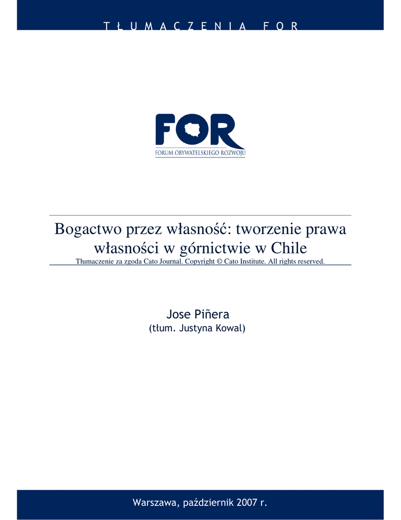 Bogactwo przez własność: tworzenie prawa własności w górnictwie w Chile Tłumaczenie za zgoda Cato Journal. Copyright © Cato Institute. All rights reserved. Jose Piñera (tłum. Justyna Kowal) Warszawa, październik 2007 r. José Piñera1 W 1971 r. prezydent Chile Salvador Allende, marksista, uzyskał aprobatę parlamentu dla zmiany konstytucji, która dawała państwu „całkowitą, wyłączną, niezbywalną i nieprzenoszalną” własność wszystkich kopalń. Jej celem była konfiskata, bez należytej rekompensaty, czterech dużych amerykańskich przedsiębiorstw wydobywających miedź. Wkrótce potem rząd wywłaszczył te przedsiębiorstwa odmawiając wypłacenia odszkodowania twierdząc przy tym, że kopalnie stanowią własność państwową. W ten sposób kilkuwiekowa tradycja prawna – według której górnicy ciszyli się zabezpieczeniem udziałów – została zmieniona z dnia na dzień. Złamano przy tym prawa własności i sparaliżowano prywatne poszukiwania złóż i inwestycje w kraju potencjalnie bogatym w nieodkryte jeszcze złoża mineralne. Po zmianie władzy w 1973 r. sytuacja nie uległa poprawie w oczekiwaniu na nową konstytucję, która wprowadziłaby instytucje demokratyczne i z powrotem zainstalowała tradycyjne prawa własności w sektorze górniczym. Jednak, ku zaskoczeniu wielu osób, nieoczekiwany brak zgody w rządzie (generałowie kontra ekonomiści) spowodował, że w konstytucji z 1980 r. zabrakło jasnych uregulowań prawnych dotyczących górnictwa. Dzień po zaakceptowaniu konstytucji w referendum sektor górniczy zaczął głosić potrzebę wprowadzenia reformy konstytucyjnej w formie nadzwyczajnego „plebiscytu górniczego” lub poprzez opublikowanie ustawy interpretującej w tym względzie konstytucję. Chile stało wówczas w obliczu dwóch ważnych problemów: 1) niepewności dotyczącej prawa własności w sektorze górniczym i 2) zagrożenia prawomocności nowej konstytucji. Próbując rozwiązać ten kryzys prezydent Pinochet poprosił mnie 29 września 1980 r. o rezygnację z funkcji Ministra Pracy i Opieki Społecznej i objęcie stanowiska Ministra Górnictwa. Miało to miejsce tuż po przyjęciu reformy opieki społecznej 4 listopada 1980 r. Reforma ta wprowadziła powszechny system emerytalny oparty na prywatnych kontach emerytalnych (patrz Piñera 1996). 1 Piñera J., Wealth Through Ownership: Creating Property Rights in Chilean Mining, “Cato Journal”, vol. 24, nr 3 (Fall 2004). Wyzwaniem w nowym resorcie było utworzenie ustawy konstytucyjnej, która zabezpieczałaby prawa własności w górnictwie, uzyskała poparcie prezydenckie i parlamentarne oraz akceptację Trybunału Konstytucyjnego, a także przekonałaby przedsiębiorców lokalnych i zagranicznych o swojej racjonalności a opinię publiczną o tym, że interes narodowy został dobrze zabezpieczony. Wszystkie te cele trzeba było osiągnąć bez osłabienia konstytucji. Nasza grupa klasycznych liberalnych ekonomistów wytrwale walczyła o nowy model gospodarczy oparty na wolnym rynku i własności prywatnej a także o powrót do ograniczonej demokracji inspirowanej działaniami Ojców Założycieli Stanów Zjednoczonych. Konstytucja z 1980 r. była kluczowym krokiem w kierunku realizacji drugiego z tych celów, gdyż nie tylko odzwierciedlała decyzję rządu o przywróceniu władzy społeczeństwu, ale także wyznaczała datę i warunki przeprowadzenia wolnych wyborów do politycznej reprezentacji Chile. Węzeł gordyjski Od samego początku odmówiłem udziału we wzbudzającej wiele kontrowersji dyskusji na temat prywatyzacji Codelco, dużego państwowego przedsiębiorstwa eksploatującego złoża miedzi należące niegdyś do Amerykanów. W tym czasie Codelco odpowiadało za 85% produkcji miedzi w Chile i miało podobny udział w krajowych dochodach z eksportu. Oczywiście nigdy nie mógłbym poprzeć utworzenia Codelco lub innego tego typu państwowego przedsiębiorstwa, ale gdy już takie istniało i posiadało przy tym niemal całkowity monopol zarówno w górnictwie jak i w wymianie międzynarodowej, próba jego prywatyzacji w wyjątkowych warunkach, w jakich został powołany rząd, była niemożliwa. Prywatyzacja przeprowadzona przez niepochodzący z wyborów rząd doprowadziłaby do wybuchu „świętej wojny”, która mogłaby zagrozić postępom w rozwiązaniu problemów priorytetowych dla Chile. W praktyce gospodarczej optymalna sekwencja podejmowanych decyzji w obrębie prowadzonej polityki jest niezwykle ważna. Należało najpierw otworzyć drogę dla rozwoju prywatnej produkcji miedzi (i innych minerałów), doprowadzić do tego, by dominowała ona w sektorze, tworząc w ten sposób bogactwo, a dopiero potem zająć się problemem własności Codelco. Naglącym wyzwaniem było ustawodawstwo, w ramach konstytucyjnych ograniczeń, które zachęcało by do prowadzenia prac badawczych w celu odnalezienia nowych złóż i do szerszego wykorzystania już istniejących. Prawidłowa identyfikacja problemu jest pierwszym ważnym krokiem do jego rozwiązania. Gordyjskim węzłem, który powstrzymywał rozwój prywatnego górnictwa, była niepewność uzyskania sprawiedliwego odszkodowania w przypadku konfiskaty przez państwo koncesji wydobywczych. Dla prywatnych inwestorów był to czynnik kluczowy biorąc pod uwagę całą historię wywłaszczeń w krajach bogatych w surowce, a zwłaszcza w Chile. „Miecz”, którym miałem ten węzeł przeciąć znalazłem na gruncie nauk ekonomicznych. Była to koncepcja wartości bieżącej przyszłych przepływów pieniężnych netto generowanych przez majątek lub całą firmę. Wielkość, która w warunkach przejrzystego i konkurencyjnego rynku jest odpowiednikiem ceny rynkowej takiego majątku lub przedsiębiorstwa. Podejście to było, moim zdaniem, zgodne z ogólnymi zasadami konstytucji, gdy określono solidne prawo koncesyjne w górnictwie. Rozumowanie leżące u podstaw powyższego kryterium jest proste. 