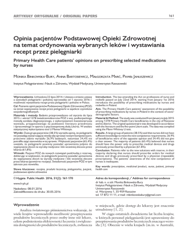 Binkowska-Bury oryginalne M i wsp. Opinia pacjentów Podstawowej Opieki Zdrowotnej na temat ordynowania wybranych leków ... 161 Artykuły / original papers Opinia pacjentów Podstawowej Opieki Zdrowotnej na temat ordynowania wybranych leków i wystawiania recept przez pielęgniarki Primary Health Care patients’ opinions on prescribing selected medications by nurses Monika Binkowska-Bury, Anna Bartosiewicz, Małgorzata Marć, Paweł Januszewicz Instytut Pielęgniarstwa i Nauk o Zdrowiu, Wydział Medyczny, Uniwersytet Rzeszowski Wprowadzenie. Uchwalona 22 lipca 2014 r. Ustawa o zmianie ustawy o zawodach pielęgniarki i położnej wprowadza od 1 stycznia 2016 r. możliwość wystawiania recept przez pielęgniarki i położne w Polsce. Cel. Poznanie opinii pacjentów Podstawowej Opieki Zdrowotnej (POZ) na temat wypisywania recept przez pielęgniarki w aspekcie czynników socjodemograficznych. Materiały i metody. Badanie przeprowadzono od stycznia do lipca 2015 r. wśród 1378 świadczeniobiorców POZ z woj. podkarpackiego metodą sondażu diagnostycznego, z wykorzystaniem kwestionariusza wywiadu, przygotowanego na podstawie literatury przedmiotu i opracowanego w oparciu o pięciostopniową skalę Likerta. W analizie statystycznej wykorzystano test U Manna-Whitneya. Wyniki. Duża grupa pacjentów (38,5%) wyraziła opinię, że pielęgniarki nie posiadają wystarczającej wiedzy aby sprostać nowym kompetencjom; przeciwne zdanie wyrażało 26,9% badanych, natomiast 34,4% nie potrafiło zająć stanowiska w tej sprawie. Większość pacjentów (65,4%) uważała, że pielęgniarki powinny posiadać uprawnienia jedynie do wypisywania zleceń na wyroby medyczne i leki wcześniej zlecone przez lekarza (61,8%). Wnioski. Pacjenci POZ do nowych rozwiązań podchodzą z rezerwą, deklarując w większości, że pielęgniarki powinny posiadać uprawnienia do wypisywania zleceń na wyroby medyczne i leki wcześniej zlecone przez lekarza (powtórne recepty). Świadomość pacjentów POZ w tym zakresie jest niewielka. Słowa kluczowe: recepta, produkt leczniczy, pielęgniarka, pacjent, podstawowa opieka zdrowotna Introduction. The law amending the Act on professions of nurse and midwife passed on July 22nd 2014, starting from January 1st 2016 introduces the possibility of prescribing medications by nurses and midwifes in Poland. Aim. The Primary Health Care patients’ assessment of the possibility of prescribing medications by nurses in Poland in the context of sociodemographic factors. Material & Method. The study was conducted from January to July 2015 among 1378 Primary Health Care beneficiaries in the city of Rzeszow and its district. The original questionnaire was developed in accordance with the literature and the five-point Likert scale. The data was compiled using the Mann-Whitney U test. Results. A large group of patients (38.5%) said that nurses did not have sufficient knowledge to meet the new competence requirements; 26.9% of beneficiaries were of the opposite opinion and 34.4% did not give a clear answer. The majority of patients (65.4%) believed that nurses should have the power only to prescribe medical devices and drugs previously prescribed by a physician (61.8%). Conclusion. Patients refer to the new solutions with reserve, in their majority declaring that nurses should prescribe orders for medical devices and drugs previously prescribed by a physician (repeatable prescriptions). The patients’ awareness of the new competence of nurses is inadequate. Key words: prescription, medicinal product, nurse, patient, primary health care © Hygeia Public Health 2016, 51(2): 161-170 Adres do korespondencji / Address for correspondence www.h-ph.pl dr hab. n. o zdr. Monika Binkowska-Bury Instytut Pielęgniarstwa i Nauk o Zdrowiu, Wydział Medyczny Uniwersytet Rzeszowski ul. Warzywna 1, 35-959 Rzeszów tel. 17 872 11 11, e-mail: [email protected] Nadesłano: 08.01.2016 Zakwalifikowano do druku: 30.05.2016 Wprowadzenie Analiza światowego piśmiennictwa wskazuje, że wiele krajów wprowadziło możliwość przepisywania produktów leczniczych przez osoby inne niż lekarz, celem podniesienia efektywności leczenia i zwiększenia dostępności do produktów leczniczych, zwłaszcza w miejscach, gdzie dostęp do lekarzy jest znacznie utrudniony [1, 2]. W ciągu ostatnich dwudziestu lat liczba krajów, w których personel pielęgniarski jest uprawniony do przepisywania produktów leczniczych znacząco wzrosła [3]. Obecnie w wielu krajach (m.in. w Australii, 162 USA, Wielkiej Brytanii, Kanadzie, Irlandii) określone grupy pielęgniarskie mogą przepisywać określone rodzaje leków [4]. W krajach o dobrze rozwiniętym systemie edukacji stanowisk pielęgniarskich (m.in. USA, Kanada, Irlandia) istnieją możliwości zaawansowanego szkolenia i kształcenia akademickiego tej grupy zawodowej. Przykładowo wysoko wykształcona pielęgniarka (nurse practitioner), określana mianem „dyplomowanej pielęgniarki” (registered nurse), jest kształcona w celu pełnienia szerokiej klinicznej roli, której jednym z aspektów jest przepisywanie leków [5]. Wśród zalet poszerzenia możliwości przepisywania leków przez inne osoby z branży medycznej niż lekarze [1, 2], za najważniejsze uważa się poprawę dostępności i jakości udzielanych świadczeń zdrowotnych. W związku z powyższym, na V spotkaniu regionalnego zespołu doradczego wschodnio-śródziemnomorskiego zgromadzenia pielęgniarek/pielęgniarzy WHO (Islamabad, Pakistan 2001) zalecono, aby w szczególności pielęgniarki pierwszego kontaktu były uprawnione i właściwie przygotowane do przepisywania leków [6]. Zalecenia WHO nie przełożyły się jednak na konkretne rozwiązania normatywne, bowiem wciąż w wielu krajach wspomniana grupa zawodowa nie posiada przedmiotowych uprawnień. Wprowadzenie możliwości przepisywania leków przez pielęgniarki/pielęgniarzy, wymaga zaawansowanej dyskusji i opracowania odpowiedniej strategii [7]. Każde 
