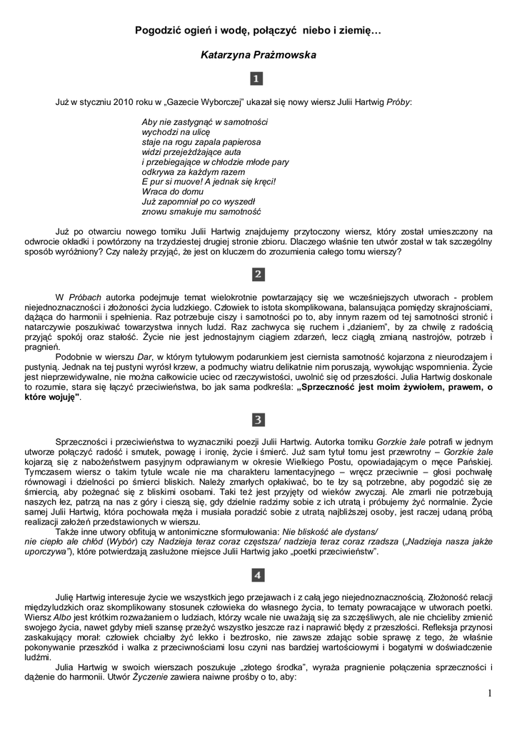 Pogodzić ogień i wodę, połączyć niebo i ziemię… Katarzyna Prażmowska Już w styczniu 2010 roku w „Gazecie Wyborczej” ukazał się nowy wiersz Julii Hartwig Próby: Aby nie zastygnąć w samotności wychodzi na ulicę staje na rogu zapala papierosa widzi przejeżdżające auta i przebiegające w chłodzie młode pary odkrywa za każdym razem E pur si muove! A jednak się kręci! Wraca do domu Już zapomniał po co wyszedł znowu smakuje mu samotność Już po otwarciu nowego tomiku Julii Hartwig znajdujemy przytoczony wiersz, który został umieszczony na odwrocie okładki i powtórzony na trzydziestej drugiej stronie zbioru. Dlaczego właśnie ten utwór został w tak szczególny sposób wyróżniony? Czy należy przyjąć, że jest on kluczem do zrozumienia całego tomu wierszy? W Próbach autorka podejmuje temat wielokrotnie powtarzający się we wcześniejszych utworach - problem niejednoznaczności i złożoności życia ludzkiego. Człowiek to istota skomplikowana, balansująca pomiędzy skrajnościami, dążąca do harmonii i spełnienia. Raz potrzebuje ciszy i samotności po to, aby innym razem od tej samotności stronić i natarczywie poszukiwać towarzystwa innych ludzi. Raz zachwyca się ruchem i „dzianiem”, by za chwilę z radością przyjąć spokój oraz stałość. Życie nie jest jednostajnym ciągiem zdarzeń, lecz ciągłą zmianą nastrojów, potrzeb i pragnień. Podobnie w wierszu Dar, w którym tytułowym podarunkiem jest ciernista samotność kojarzona z nieurodzajem i pustynią. Jednak na tej pustyni wyrósł krzew, a podmuchy wiatru delikatnie nim poruszają, wywołując wspomnienia. Życie jest nieprzewidywalne, nie można całkowicie uciec od rzeczywistości, uwolnić się od przeszłości. Julia Hartwig doskonale to rozumie, stara się łączyć przeciwieństwa, bo jak sama podkreśla: „Sprzeczność jest moim żywiołem, prawem, o które wojuję". Sprzeczności i przeciwieństwa to wyznaczniki poezji Julii Hartwig. Autorka tomiku Gorzkie żale potrafi w jednym utworze połączyć radość i smutek, powagę i ironię, życie i śmierć. Już sam tytuł tomu jest przewrotny – Gorzkie żale kojarzą się z nabożeństwem pasyjnym odprawianym w okresie Wielkiego Postu, opowiadającym o męce Pańskiej. Tymczasem wiersz o takim tytule wcale nie ma charakteru lamentacyjnego – wręcz przeciwnie – głosi pochwałę równowagi i dzielności po śmierci bliskich. Należy zmarłych opłakiwać, bo te łzy są potrzebne, aby pogodzić się ze śmiercią, aby pożegnać się z bliskimi osobami. Taki też jest przyjęty od wieków zwyczaj. Ale zmarli nie potrzebują naszych łez, patrzą na nas z góry i cieszą się, gdy dzielnie radzimy sobie z ich utratą i próbujemy żyć normalnie. Życie samej Julii Hartwig, która pochowała męża i musiała poradzić sobie z utratą najbliższej osoby, jest raczej udaną próbą realizacji założeń przedstawionych w wierszu. Także inne utwory obfitują w antonimiczne sformułowania: Nie bliskość ale dystans/ nie ciepło ale chłód (Wybór) czy Nadzieja teraz coraz częstsza/ nadzieja teraz coraz rzadsza („Nadzieja nasza jakże uporczywa”), które potwierdzają zasłużone miejsce Julii Hartwig jako „poetki przeciwieństw”. Julię Hartwig interesuje życie we wszystkich jego przejawach i z całą jego niejednoznacznością. Złożoność relacji międzyludzkich oraz skomplikowany stosunek człowieka do własnego życia, to tematy powracające w utworach poetki. Wiersz Albo jest krótkim rozważaniem o ludziach, którzy wcale nie uważają się za szczęśliwych, ale nie chcieliby zmienić swojego życia, nawet gdyby mieli szansę przeżyć wszystko jeszcze raz i naprawić błędy z przeszłości. Refleksja przynosi zaskakujący morał: człowiek chciałby żyć lekko i beztrosko, nie zawsze zdając sobie sprawę z tego, że właśnie pokonywanie przeszkód i walka z przeciwnościami losu czyni nas bardziej wartościowymi i bogatymi w doświadczenie ludźmi. Julia Hartwig w swoich wierszach poszukuje „złotego środka”, wyraża pragnienie połączenia sprzeczności i dążenie do harmonii. Utwór Życzenie zawiera naiwne prośby o to, aby: 1 Być na równej stopie nie tylko z ludźmi ale i z roślinami przedmiotami z całym światem być na równej stopie z bogaczem i z wydziedziczonym z geniuszem i z nieudacznikiem nie cofać się przed cudzą wielkością Rembrandta mieć za brata a Pana Boga za ojca (…) Bacha kochać ale nie na kolanach Świat przedstawiony w wierszach poetki jest szalenie bogaty i wielobarwny, nie sposób go jednoznacznie ocenić czy uschematyzować. Zarówno wady jak i zalety, jasne i ciemne strony ziemskiego życia mają swój cel i jakieś głębsze znaczenie. Wiersze pisane w trakcie poważnej choroby autorki emanują spokojem, cierpliwą próbą zrozumienia świata i jednoczesną zgodą na niemożność jego pełnego odkrycia. Do ważnych motywów wierszy Julii Hartwig, zarówno tych wcześniejszych, jak i zawartych w tomiku Gorzkie żale, należy refleksja nad rolą poety i samej poezji. Cena to tytuł utworu ukazującego różnorodność twórczości poetyckiej, w którym podmiot liryczny podkreśla ogromną odpowiedzialność autora za słowo. Poezja nie jest ratunkiem, nie ma też mocy zbawiennej - jest pełna sprzeczności, jak wszystko w światopoglądzie Hartwig. Raz próbuje uciec od świata i stanowi azyl dla artysty, innym razem natarczywie poszukuje kontaktu z rzeczywistością. Równocześnie zadaje i przyjmuje rany, chce być zapamiętana i pragnie niepamięci. Poeta jest niekiedy więźniem własnej poezji, toczy sam ze sobą zacięte bitwy o jej kształt, o wiersze, które po nim pozostaną. Ponosi odpowiedzialność za to, co pisze, niektóre słowa mogą go bardzo drogo kosztować – kogoś obrazić, komuś się narazić, kogoś skrzywdzić. Podmiot liryczny podkreśla różnorodność poezji - jej „ciemną” stronę, zainteresowanie czarnymi