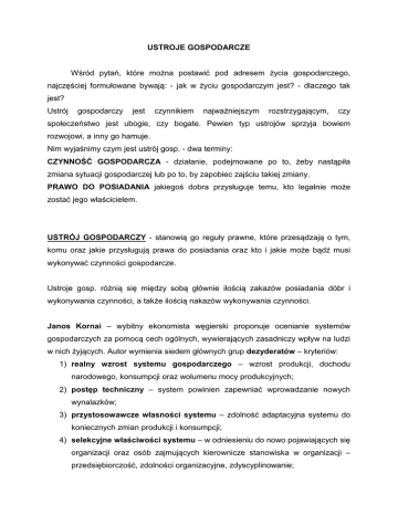 USTROJE GOSPODARCZE Wśród pytań, które można postawić pod adresem życia gospodarczego, najczęściej formułowane bywają: - jak w życiu gospodarczym jest? - dlaczego tak jest? Ustrój gospodarczy jest czynnikiem najważniejszym rozstrzygającym, czy społeczeństwo jest ubogie, czy bogate. Pewien typ ustrojów sprzyja bowiem rozwojowi, a inny go hamuje. Nim wyjaśnimy czym jest ustrój gosp. - dwa terminy: CZYNNOŚĆ GOSPODARCZA - działanie, podejmowane po to, żeby nastąpiła zmiana sytuacji gospodarczej lub po to, by zapobiec zajściu takiej zmiany. PRAWO DO POSIADANIA jakiegoś dobra przysługuje temu, kto legalnie może zostać jego właścicielem. USTRÓJ GOSPODARCZY - stanowią go reguły prawne, które przesądzają o tym, komu oraz jakie przysługują prawa do posiadania oraz kto i jakie może bądź musi wykonywać czynności gospodarcze. Ustroje gosp. różnią się między sobą głównie ilością zakazów posiadania dóbr i wykonywania czynności, a także ilością nakazów wykonywania czynności. Janos Kornai – wybitny ekonomista węgierski proponuje ocenianie systemów gospodarczych za pomocą cech ogólnych, wywierających zasadniczy wpływ na ludzi w nich żyjących. Autor wymienia siedem głównych grup dezyderatów – kryteriów: 1) realny wzrost systemu gospodarczego – wzrost produkcji, dochodu narodowego, konsumpcji oraz wolumenu mocy produkcyjnych; 2) postęp techniczny – system powinien zapewniać wprowadzanie nowych wynalazków; 3) przystosowawcze własności systemu – zdolność adaptacyjna systemu do koniecznych zmian produkcji i konsumpcji; 4) selekcyjne właściwości systemu – w odniesieniu do nowo pojawiających się organizacji oraz osób zajmujących kierownicze stanowiska w organizacji – przedsiębiorczość, zdolności organizacyjne, zdyscyplinowanie; 5) podział dochodu i zatrudnienia – sprzeczność pomiędzy bodźcowym a egalitarnym podziałem oraz konieczność zapewnienia pełnego zatrudnienia; 6) rozwój kulturalny i społeczny – dotyczy zapewnienie rozwoju nauki, wydłużenia okresu nauczania, poprawa służby zdrowia, 7) własność, władza i decyzje – sprzeczności pomiędzy nimi, centralizacja i decentralizacja władzy USTRÓJ LIBERALNY I ETATYSTYCZNY Liberalizm to pogląd w myśl, którego gospodarka funkcjonuje lepiej im mniej czynności gospodarczych zastrzeżonych jest dla instytucji lub przedsiębiorstw państwowych oraz im mniej czynności nakazanych jest przez państwo. Swoboda działalności gospodarczej, wolność gospodarcza Ustrój etatystyczny - występuje, gdy dużo czynności gosp. jest zastrzeżonych wyłącznie dla instytucji i przedsiębiorstw państwowych oraz im więcej czynności jest nakazanych przez państwo. Np. w PRL obrót dewizami był zarezerwowany dla instytucji państwowych. Podobnie eksport i import - tylko p. państwowe. Tak samo produkcja na dużą skalę i handel hurtowy. Pozostałością po ustroju etatystycznym w Polsce są koncesje, mówi się, żeby znosić koncesje ale państwo za dużo traci, taka sytuacja jest wygodna GOSPODARKA CENTRALNIE ZARZĄDZANA i GOSP. RYNKOWA XX wiek to czas konfrontacji między tymi dwoma rodzajami gosp. Po raz pierwszy w historii gospodarka centr. zarz. pojawiła się w Rosji po 1917 roku. Po II wojnie św. system te rozszerzył się na Chiny, kilka państw azjatyckich i kilka państw Europy Środkowo-Wschodniej. W latach sześćdziesiątych również kilka państw afrykańskich i Kuba. Gospodarka centralnie zarządzana jest wysoko zetatyzowana. Dla państwa zarezerwowana jest działalność banków, handel zagr., handel hurtowy i w dużej części detaliczny, produkcja przemysłowa i rolna na dużą skalę. W niektórych krajach nawet użytkowanie małych obszarów ziemi, rzemiosło i drobny handel. Wysoki stopień etatyzacji to jednak nie wszystko. Dochodzą również dyrektywy gospodarcze - dyrektywa nakłada na jednostkę gospodarczą obowiązek prowadzenia działalności w dziedzinach i rozmiarach określonych przez władze i metodą przez te władze wymaganą. Przykłady: - przedsiębiorstwo produkcyjne musi wykonać żądaną przez władzę produkcję o wymaganej strukturze; - bank musi udzielić kredytów o określonej przez władze wartości; - przedsiębiorstwo handlowe musi sprzedać towary o ustalonej łącznej wartości, towary te muszą mieć określoną strukturę asortymentową etc. Takie dyrektywy nosiły nazwę planów gospodarczych. Dzisiaj też istnieją plany, np. w Japonii, Plan wieloletni zwiększenie tempa wzrostu gospodarczego do 5% rocznie Przedsiębiorstwom nie wolno było zaopatrywać się poza tzw. rozdzielnikiem, czyli wydanym przez władze zezwoleniem na zakup określonej ilości czynników produkcji. Rozdzielnik ograniczał popyt przedsiębiorstw niezależnie od ich potrzeb i pieniędzy. W praktyce w okresie 1918 – 1989 w Europie obserwować można było dwa warianty takiego systemu: * socjalizm planowy: zasoby były własnością państwa, ich alokacja odbywała się zgodnie z centralnym planem państwa (b. ZSRR i b. NRD, Rumunia), * socjalizm rynkowy: zasoby były własnością państwa lub w dyspozycji realnej samorządów i innych podmiotów gospodarczych; alokację zasobów determinował w pewnym stopniu mechanizm rynkowy (b. Jugosławia, Węgry i Polska, a dziś także Chiny). Chiny: fenomen dzisiejszej ekonomii, socjalizm rynkowy, hybryda, rozwój w tempie 10% rocznie od kilkudziesięciu lat, inwestycje zagraniczne, rozwój regionów, zachęty inwestycyjne Kraj kontrastów: Dzieci, dysydenci, opozycja, korupcja (największa na świecie, kara śmierci) Gospodarka rynkowa istnieje, gdy podstawowym motywem działania przedsiębiorstw jest max. zysku, a podstawowym sposobem kontaktów między przedsiębiorstwami są transakcje kupna - sprzedaży zawierane w oparciu o swobodne negocjowanie ceny. Zwróćmy uwagę, że gospodarka rynkowa nie musi być jednocześnie liberalną. Większość czynności może być w 