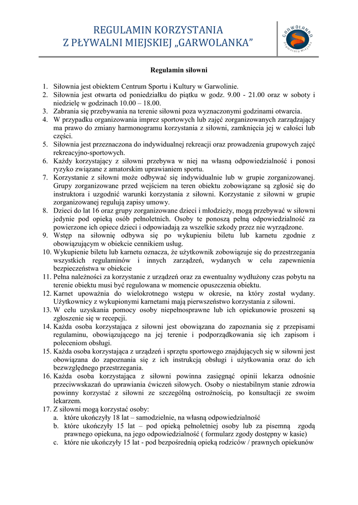 REGULAMIN KORZYSTANIA Z PŁYWALNI MIEJSKIEJ „GARWOLANKA” Regulamin siłowni 1. Siłownia jest obiektem Centrum Sportu i Kultury w Garwolinie. 2. Siłownia jest otwarta od poniedziałku do piątku w godz. 9.00 - 21.00 oraz w soboty i niedzielę w godzinach 10.00 – 18.00. 3. Zabrania się przebywania na terenie siłowni poza wyznaczonymi godzinami otwarcia. 4. W przypadku organizowania imprez sportowych lub zajęć zorganizowanych zarządzający ma prawo do zmiany harmonogramu korzystania z siłowni, zamknięcia jej w całości lub części. 5. Siłownia jest przeznaczona do indywidualnej rekreacji oraz prowadzenia grupowych zajęć rekreacyjno-sportowych. 6. Każdy korzystający z siłowni przebywa w niej na własną odpowiedzialność i ponosi ryzyko związane z amatorskim uprawianiem sportu. 7. Korzystanie z siłowni może odbywać się indywidualnie lub w grupie zorganizowanej. Grupy zorganizowane przed wejściem na teren obiektu zobowiązane są zgłosić się do instruktora i uzgodnić warunki korzystania z siłowni. Korzystanie z siłowni w grupie zorganizowanej regulują zapisy umowy. 8. Dzieci do lat 16 oraz grupy zorganizowane dzieci i młodzieży, mogą przebywać w siłowni jedynie pod opieką osób pełnoletnich. Osoby te ponoszą pełną odpowiedzialność za powierzone ich opiece dzieci i odpowiadają za wszelkie szkody przez nie wyrządzone. 9. Wstęp na siłownię odbywa się po wykupieniu biletu lub karnetu zgodnie z obowiązującym w obiekcie cennikiem usług. 10. Wykupienie biletu lub karnetu oznacza, że użytkownik zobowiązuje się do przestrzegania wszystkich regulaminów i innych zarządzeń, wydanych w celu zapewnienia bezpieczeństwa w obiekcie 11. Pełna należności za korzystanie z urządzeń oraz za ewentualny wydłużony czas pobytu na terenie obiektu musi być regulowana w momencie opuszczenia obiektu. 12. Karnet upoważnia do wielokrotnego wstępu w okresie, na który został wydany. Użytkownicy z wykupionymi karnetami mają pierwszeństwo korzystania z siłowni. 13. W celu uzyskania pomocy osoby niepełnosprawne lub ich opiekunowie proszeni są zgłoszenie się w recepcji. 14. Każda osoba korzystająca z siłowni jest obowiązana do zapoznania się z przepisami regulaminu, obowiązującego na jej terenie i podporządkowania się ich zapisom i poleceniom obsługi. 15. Każda osoba korzystająca z urządzeń i sprzętu sportowego znajdujących się w siłowni jest obowiązana do zapoznania się z ich instrukcją obsługi i użytkowania oraz do ich bezwzględnego przestrzegania. 16. Każda osoba korzystająca z siłowni powinna zasięgnąć opinii lekarza odnośnie przeciwwskazań do uprawiania ćwiczeń siłowych. Osoby o niestabilnym stanie zdrowia powinny korzystać z siłowni ze szczególną ostrożnością, po konsultacji ze swoim lekarzem. 17. Z siłowni mogą korzystać osoby: a. które ukończyły 18 lat – samodzielnie, na własną odpowiedzialność b. które ukończyły 15 lat – pod opieką pełnoletniej osoby lub za pisemną zgodą prawnego opiekuna, na jego odpowiedzialność ( formularz zgody dostępny w kasie) c. które nie ukończyły 15 lat - pod bezpośrednią opieką rodziców / prawnych opiekunów REGULAMIN KORZYSTANIA Z PŁYWALNI MIEJSKIEJ „GARWOLANKA” 18. Z siłowni należy korzystać w stroju oraz obuwiu sportowym (czystym, na płaskiej podeszwie, bez kolców i kołków, nie pozostawiającym podczas użytkowania zabrudzeń, rys itp.). Ze względów higienicznych wskazane jest posiadanie ręcznika. 19. Zmiana ubrania wierzchniego na strój sportowy odbywa się w szatni. 20. Przed wyjściem z szatni należy sprawdzić, czy szafka została zamknięta. Za rzeczy pozostawione w szafkach otwartych lub nieprawidłowo zamkniętych, pieniądze i przedmioty wartościowe kierownictwo obiektu nie ponosi odpowiedzialności. 21. Jednocześnie z siłowni może korzystać maksymalnie 25 osób 22. Kierownictwo obiektu może czasowo ograniczyć wstęp na siłownię ze względu na przekroczenie maksymalnej ilości osób korzystających lub w przypadku, gdy ilość osób stwarzałoby sytuacje zagrożenia dla użytkowników 23. Użytkownicy będą wpuszczani na siłownię nie później niż 45 minut przed jej zamknięciem 24. O wszelkich sytuacjach wypadkowych, zagrażających życiu i zdrowiu użytkowników oraz nieprawidłowej pracy urządzeń należy bezwzględnie powiadomić personel obiektu 25. Zabronione jest wszelkie postępowanie zagrażające bezpieczeństwu własnemu lub innych użytkowników siłowni oraz stanowi sanitarno-higienicznemu obiektu, w szczególności: a. przebierania się poza szatnią, b. wchodzenia w innym stroju i obuwiu niż sportowe, c. przebywanie w stanie wskazującym na stan intoksykacji d. wnoszenie i spożywanie napojów alkoholowych oraz środków odurzających e. palenie tytoniu i używanie otwartego ognia f. żucie gumy i spożywanie pokarmów g. wnoszenie opakowań szklanych, puszek, ostrych narzędzi, broni oraz innych niebezpiecznych przedmiotów h. zaśmiecanie i zanieczyszczanie terenu siłowni i. niszczenie urządzeń i wyposażenia siłowni j. wnoszenie przedmiotów utrudniających komunikację k. hałasowanie, przeszkadzanie ćwiczącym oraz innym osobom przebywającym na terenie siłowni l. wchodzenie na konstrukcję przyrządów w innych miejscach niż do tego przeznaczone m. ustawianie na przyrządach jakichkolwiek przedmiotów i sprzętu (toreb, butelek, itp) n. wykonywanie ćwiczeń siłowych bez rozgrzewki o. ćwiczenie z nie spiętymi długimi włosami oraz z biżuterią i ozdobami, mogącymi spowodować uszkodzenie ciała p. korzystania ze sprzętu sportowego, dokonywanie jakiejkolwiek modyfikacji przyrządów oraz przemieszczania wyposażenia ruchomego bez zgody personelu, q. korzystania ze sprzętu sportowego oraz wyposażenia siłowni niezgodnie z ich przeznaczeniem, r. wykonywania ćwiczeń siłowych na ławce w pozycji leżącej oraz treningu z dużymi obciążeniami, bez asekuracji i