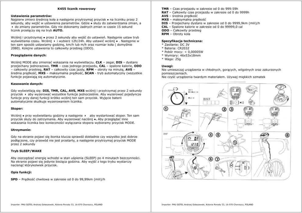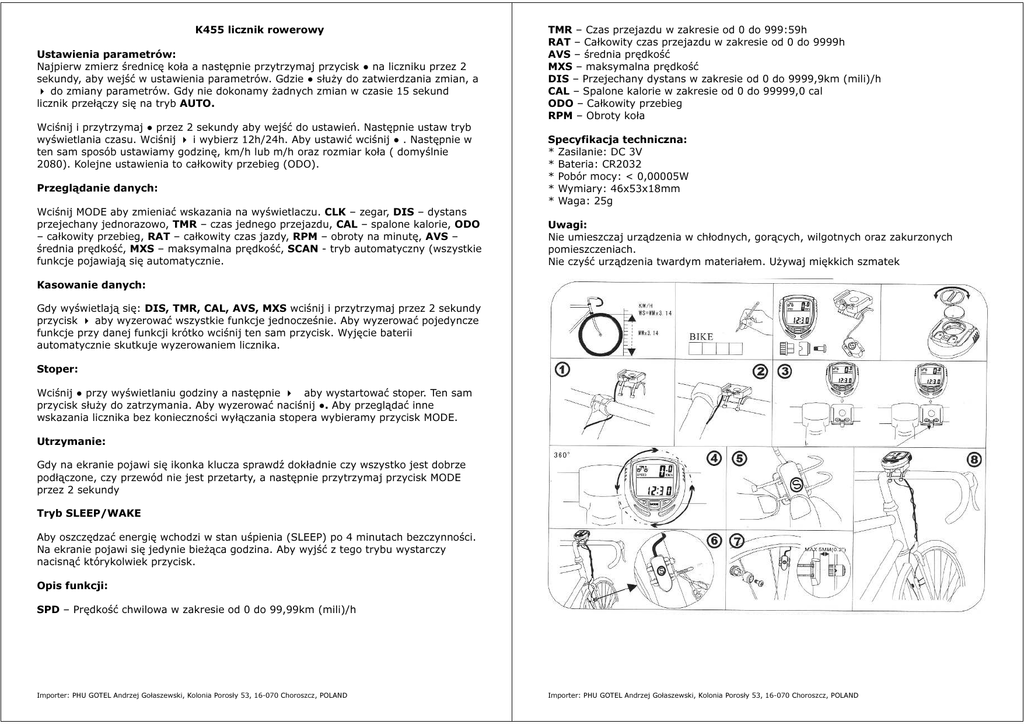 K455 licznik rowerowy Ustawienia parametrów: Najpierw zmierz średnicę koła a następnie przytrzymaj przycisk ● na liczniku przez 2 sekundy, aby wejść w ustawienia parametrów. Gdzie ● służy do zatwierdzania zmian, a do zmiany parametrów. Gdy nie dokonamy żadnych zmian w czasie 15 sekund licznik przełączy się na tryb AUTO. Wciśnij i przytrzymaj ● przez 2 sekundy aby wejść do ustawień. Następnie ustaw tryb wyświetlania czasu. Wciśnij i wybierz 12h/24h. Aby ustawić wciśnij ● . Następnie w ten sam sposób ustawiamy godzinę, km/h lub m/h oraz rozmiar koła ( domyślnie 2080). Kolejne ustawienia to całkowity przebieg (ODO). Przeglądanie danych: Wciśnij MODE aby zmieniać wskazania na wyświetlaczu. CLK – zegar, DIS – dystans przejechany jednorazowo, TMR – czas jednego przejazdu, CAL – spalone kalorie, ODO – całkowity przebieg, RAT – całkowity czas jazdy, RPM – obroty na minutę, AVS – średnia prędkość, MXS – maksymalna prędkość, SCAN - tryb automatyczny (wszystkie funkcje pojawiają się automatycznie. TMR – Czas przejazdu w zakresie od 0 do 999:59h RAT – Całkowity czas przejazdu w zakresie od 0 do 9999h AVS – średnia prędkość MXS – maksymalna prędkość DIS – Przejechany dystans w zakresie od 0 do 9999,9km (mili)/h CAL – Spalone kalorie w zakresie od 0 do 99999,0 cal ODO – Całkowity przebieg RPM – Obroty koła Specyfikacja techniczna: * Zasilanie: DC 3V * Bateria: CR2032 * Pobór mocy: < 0,00005W * Wymiary: 46x53x18mm * Waga: 25g Uwagi: Nie umieszczaj urządzenia w chłodnych, gorących, wilgotnych oraz zakurzonych pomieszczeniach. Nie czyść urządzenia twardym materiałem. Używaj miękkich szmatek Kasowanie danych: Gdy wyświetlają się: DIS, TMR, CAL, AVS, MXS wciśnij i przytrzymaj przez 2 sekundy przycisk aby wyzerować wszystkie funkcje jednocześnie. Aby wyzerować pojedyncze funkcje przy danej funkcji krótko wciśnij ten sam przycisk. Wyjęcie baterii automatycznie skutkuje wyzerowaniem licznika. Stoper: Wciśnij ● przy wyświetlaniu godziny a następnie aby wystartować stoper. Ten sam przycisk służy do zatrzymania. Aby wyzerować naciśnij ●. Aby przeglądać inne wskazania licznika bez konieczności wyłączania stopera wybieramy przycisk MODE. Utrzymanie: Gdy na ekranie pojawi się ikonka klucza sprawdź dokładnie czy wszystko jest dobrze podłączone, czy przewód nie jest przetarty, a następnie przytrzymaj przycisk MODE przez 2 sekundy Tryb SLEEP/WAKE Aby oszczędzać energię wchodzi w stan uśpienia (SLEEP) po 4 minutach bezczynności. Na ekranie pojawi się jedynie bieżąca godzina. Aby wyjść z tego trybu wystarczy nacisnąć którykolwiek przycisk. Opis funkcji: SPD – Prędkość chwilowa w zakresie od 0 do 99,99km (mili)/h Importer: PHU GOTEL Andrzej Gołaszewski, Kolonia Porosły 53, 16-070 Choroszcz, POLAND Importer: PHU GOTEL Andrzej Gołaszewski, Kolonia Porosły 53, 16-070 Choroszcz, POLAND