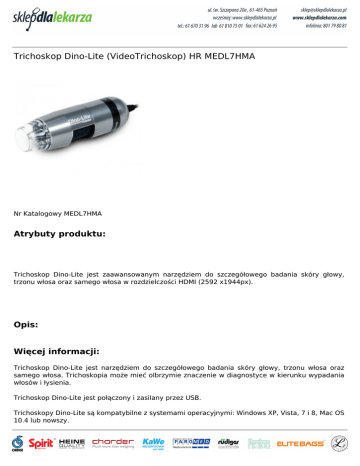 Trichoskop Dino-Lite (VideoTrichoskop) HR MEDL7HMA Nr Katalogowy MEDL7HMA Atrybuty produktu: Trichoskop Dino-Lite jest zaawansowanym narzędziem do szczegółowego badania skóry głowy, trzonu włosa oraz samego włosa w rozdzielczości HDMI (2592 x1944px). Opis: Więcej informacji: Trichoskop Dino-Lite jest narzędziem do szczegółowego badania skóry głowy, trzonu włosa oraz samego włosa. Trichoskopia może mieć olbrzymie znaczenie w diagnostyce w kierunku wypadania włosów i łysienia. Trichoskop Dino-Lite jest połączony i zasilany przez USB. Trichoskopy Dino-Lite są kompatybilne z systemami operacyjnymi: Windows XP, Vista, 7 i 8, Mac OS 10.4 lub nowszy. Dołączone bezpłatne (nieograniczone czasem i licencją) do instalacji na dowolnej liczbie komputerów oprogramowanie w języku polskim: DinoCapture 2.0 (Windows), DinoXcope (Mac OS) pozwala m.in na: na przechowywanie i katalogowanie zdjęć i filmików z badania, nanoszenie uwag na plik, pomiar obwodu i powierzchni badaniej zmiany, dołączanie do wysyłanej wiadomości pliku z badania (konsultacja medyczna). W zestawie: etui, Płyta CD z programem, płytka kalibracyjna. Powered by TCPDF (www.tcpdf.org)