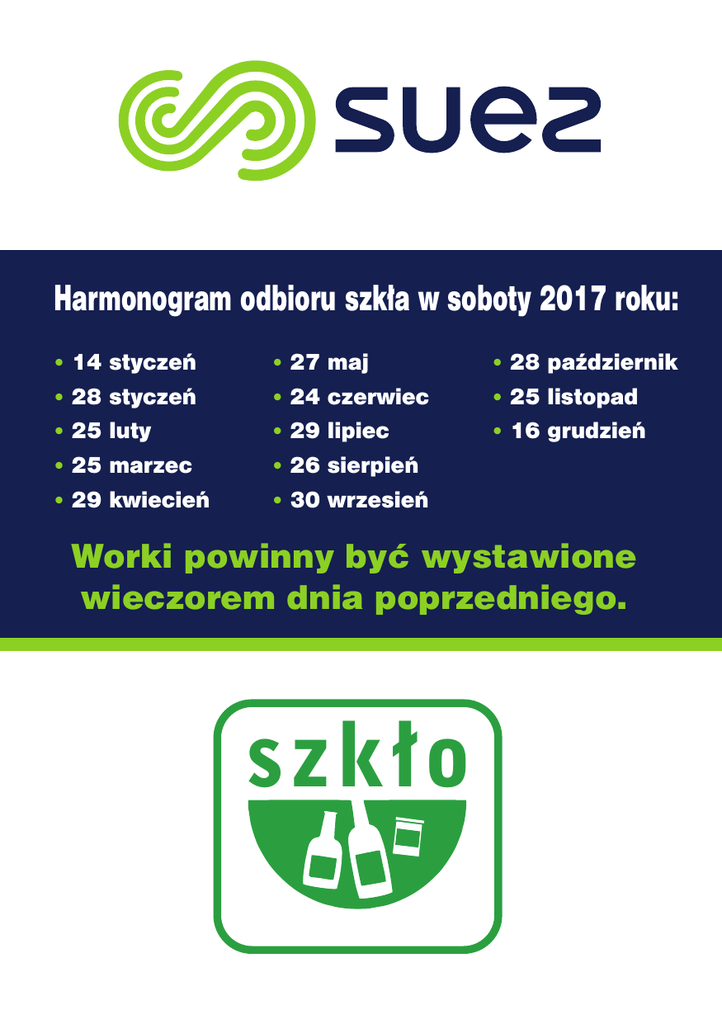 Harmonogram odbioru szkła w soboty 2017 roku: • 14 styczeń • 27 maj • 28 październik • 28 styczeń • 24 czerwiec • 25 listopad • 25 luty • 29 lipiec • 16 grudzień • 25 marzec • 26 sierpień • 29 kwiecień • 30 wrzesień Worki powinny być wystawione wieczorem dnia poprzedniego. szkło