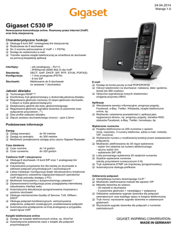 24.04.2014 Wersja 1.0 Gigaset C530 IP Nowoczesna komunikacja online. Rozmowy przez Internet (VoIP) oraz linię stacjonarną. Charakterystyczne funkcje: Obsługa 6 kont SIP i analogowej linii stacjonarnej Rozbudowa do 6 słuchawek Do 3 rozmów jednocześnie (2 VoIP + 1 PSTN) Dostęp do wiadomości e-mail Transfer wpisów książki telefonicznej ze smartfona do słuchawki za pomocą bezpłatnej aplikacji Interfejsy: Standardy: Konfiguracja: Słuchawki: - a/b (analogowy – RJ11) - IP/Ethernet (IEEE 802.3) dla VoIP DECT, GAP, DHCP, SIP, RTP, STUN, POP3(S) - 1 linia analogowa (PSTN) - 6 linii SIP Meldowanie do 6 słuchawek (w zestawie 1 słuchawka) Jakość dźwięku Technologia HDSP TM Komfortowy tryb głośnomówiący z doskonałą jakością dźwięku Regulowana głośność rozmowy (5 stopni głośności słuchawki, 5 stopni w trybie głośnomówiącym) Dedykowany głośnik dla trybu głośnomówiącego Regulowana głośność sygnałów dzwonka (5 poziomów oraz wyłączenie przyciskiem „*”) Dwa profile ustawień dźwięku Złącze zestawu słuchawkowego (mono) – jack 2,5mm Podstawowe informacje Zasięg Zasięg wewnątrz: do 50 metrów Zasięg na zewnątrz: do 300 metrów Możliwość powiększenia zasięgu przy użyciu Gigaset Repeater Czas działania Czas rozmów: Czas czuwania: do 14 godzin do 320 godzin Telefonia VoIP i stacjonarna Obsługa 6 słuchawek i 6 kont SIP oraz 1 analogowej linii stacjonarnej Indywidualne przypisanie linii dla każdej ze słuchawek w zakresie połączeń przychodzących i wychodzących Łatwa instalacja i konfiguracja dzięki wbudowanemu kreatorowi zawierającemu ustawienia najpopularniejszych operatorów VoIP (brak potrzeby dostępu z PC) Możliwość korzystania z autoprovisioningu ustawień 1 Zaawansowana konfiguracja przez przeglądarkę internetową (wbudowany interfejs web) Automatyczna aktualizacja oprogramowania inicjowana z poziomu słuchawki Obsługa mechanizmów Quality of Service: ToS, Diffserv, DSCP Obsługa połączeń konferencyjnych, wstrzymywania połączenia, połączeń oczekujących, przekierowania połączeń Automatyczne przełączenie na linię analogową w przypadku awarii łącza VoIP Książki telefoniczne online Dostęp do książek telefonicznych online, np. KlickTel Automatyczne pobieranie nazw z książki dla połączeń przychodzących E-mail Dostęp do konta poczty e-mail POP3/POP3S Odczyt wiadomości na słuchawce: nadawca, data i godzina, temat (do 560 znaków) Optyczna sygnalizacja nowych wiadomości (miganie przycisku MWI) Aplikacje Wbudowane serwisy informacyjne: prognoza pogody, Facebook, e-Bay, Twitter, Wikipedia, książki telefoniczne online, itp. Możliwość ustawienia powiadomień z aplikacji jako wygaszacza ekranu, np: prognozy pogody, kanałów RSS, statusów Facebook, e-Bay, Twitter, horoskopu, itp. Wybieranie numerów Książka telefoniczna na 200 numerów z opisem (imię, nazwisko, 3 numery telefonów, adres e-mail, melodia VIP, rocznica) Wybieranie numeru z możliwością korekcji przed zestawieniem połączenia Możliwość zdefiniowania do 30 reguł wybierania: - wybór linii zależnie od numeru telefonicznego - ręczny wybór linii - wybieranie SIP URI Lista ponownego wybierania 20 ostatnich numerów Szybkie wybieranie numerów (skróty przyciskami numerycznymi 2-9) Tryb wybierania DTMF lub impulsowy (programowalny) Automatyczna obsługa prefiksów Odbieranie połączeń Identyfikacja numeru dzwoniącego CLIP 1 Możliwość zdefiniowania melodii dla wpisów VIP Melodie dzwonka do wyboru: - 30 melodii w słuchawce - 5 poziomów głośności + narastający + wyłączony Oddzielne ustawienie sygnału dzwonka dla połączeń wewnętrznych oraz każdego wpisu w książce telefonicznej Tryb nocny: wyciszanie sygnału dzwonka w ustawionych godzinach Wyciszanie sygnału dzwonka dla połączeń z numerów zastrzeżonych 24.04.2014 Wersja 1.0 Listy połączeń Lista 30 odebranych i nieodebranych połączeń Lista 20 wybranych numerów Powiadomienie SMS o nieodebranym połączeniu Funkcje dodatkowe Darmowa aplikacja „Gigaset Contacts” do kopiowania kontaktów ze smartfona do słuchawki Przypomnienie o urodzinach Budzik z funkcją drzemki Babyfon / monitoring pomieszczenia Direct call (baby call) – wybieranie zaprogramowanego numeru naciśnięciem dowolnego przycisku Data i czas chronione w przypadku utraty zasilania Możliwość edycji nazwy na liście słuchawek wewnętrznych Anteny wewnętrzne Możliwość montażu stacji bazowej na ścianie Wyświetlacz Podświetlany kolorowy wyświetlacz graficzny TFT (1,8”, 38 x 32 mm, 128 x 160pikseli, 65 tyś. kolorów) 2 układy kolorów wyświetlacza (jasny / ciemny) Wygaszacze ekranu Wyświetlanie: - daty i godziny - siły sygnału i stanu naładowania akumulatorów - czasu trwania aktualnej rozmowy Menu Wygodne w użyciu menu w 24 językach (niemiecki, angielski, francuski, włoski, hiszpański, portugalski, holenderski, duński, norweski, szwedzki, fiński, czeski, polski, turecki, grecki, węgierski, rosyjski, chorwacki, słoweński, rumuński, serbski, kataloński, bułgarski, ukraiński) Menu oparte o ikony i teksty oraz przyciski funkcyjne wyświetlacza Klawiatura Ergonomiczna klawiatura z materiałów wysokiej jakości Pięciokierunkowy przycisk nawigacyjny Podświetlana klawiatura (kolor bursztynowy) Podświetlane przycisk wiadomości (MWI) Blokada klawiatury (długie naciśnięcie „#”) Wyłączenie dzwonka (długie naciśnięcie „*”) Funkcja Flash (R) – (długie naciśnięcie „0”) ECO-DECT Do 60% niższe zużycie energii2 (energooszczędny zasilacz impulsowy na wyposażeniu) Redukcja mocy nadawania prawie do zera po odstawieniu słuchawki do stacji bazowej (tylko przy 1 zalogowanej słuchawce) Tryb ECO – manualna redukcja mocy nadawania o 80% 3 Tryb ECO Plus – redukcja do 100% mocy nadawania dla wszystkich zalogowanych słuchawek4 Płynna redukcja mocy nadawania w zależności od odległości między stacją bazową a słuchawką W