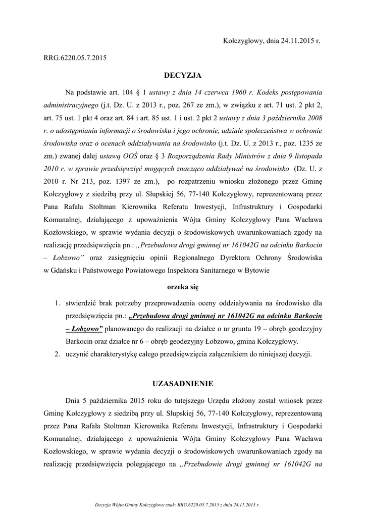 Kołczygłowy, dnia 24.11.2015 r. RRG.6220.05.7.2015 DECYZJA Na podstawie art. 104 § 1 ustawy z dnia 14 czerwca 1960 r. Kodeks postępowania administracyjnego (j.t. Dz. U. z 2013 r., poz. 267 ze zm.), w związku z art. 71 ust. 2 pkt 2, art. 75 ust. 1 pkt 4 oraz art. 84 i art. 85 ust. 1 i ust. 2 pkt 2 ustawy z dnia 3 października 2008 r. o udostępnianiu informacji o środowisku i jego ochronie, udziale społeczeństwa w ochronie środowiska oraz o ocenach oddziaływania na środowisko (j.t. Dz. U. z 2013 r., poz. 1235 ze zm.) zwanej dalej ustawą OOŚ oraz § 3 Rozporządzenia Rady Ministrów z dnia 9 listopada 2010 r. w sprawie przedsięwzięć mogących znacząco oddziaływać na środowisko (Dz. U. z 2010 r. Nr 213, poz. 1397 ze zm.), po rozpatrzeniu wniosku złożonego przez Gminę Kołczygłowy z siedzibą przy ul. Słupskiej 56, 77-140 Kołczygłowy, reprezentowaną przez Pana Rafała Stoltman Kierownika Referatu Inwestycji, Infrastruktury i Gospodarki Komunalnej, działającego z upoważnienia Wójta Gminy Kołczygłowy Pana Wacława Kozłowskiego, w sprawie wydania decyzji o środowiskowych uwarunkowaniach zgody na realizację przedsięwzięcia pn.: „Przebudowa drogi gminnej nr 161042G na odcinku Barkocin – Łobzowo” oraz zasięgnięciu opinii Regionalnego Dyrektora Ochrony Środowiska w Gdańsku i Państwowego Powiatowego Inspektora Sanitarnego w Bytowie orzeka się 1. stwierdzić brak potrzeby przeprowadzenia oceny oddziaływania na środowisko dla przedsięwzięcia pn.: „Przebudowa drogi gminnej nr 161042G na odcinku Barkocin – Łobzowo” planowanego do realizacji na działce o nr gruntu 19 – obręb geodezyjny Barkocin oraz działce nr 6 – obręb geodezyjny Łobzowo, gmina Kołczygłowy. 2. uczynić charakterystykę całego przedsięwzięcia załącznikiem do niniejszej decyzji. UZASADNIENIE Dnia 5 października 2015 roku do tutejszego Urzędu złożony został wniosek przez Gminę Kołczygłowy z siedzibą przy ul. Słupskiej 56, 77-140 Kołczygłowy, reprezentowaną przez Pana Rafała Stoltman Kierownika Referatu Inwestycji, Infrastruktury i Gospodarki Komunalnej, działającego z upoważnienia Wójta Gminy Kołczygłowy Pana Wacława Kozłowskiego, w sprawie wydania decyzji o środowiskowych uwarunkowaniach zgody na realizację przedsięwzięcia polegającego na „Przebudowie drogi gminnej nr 161042G na Decyzja Wójta Gminy Kołczygłowy znak: RRG.6220.05.7.2015 z dnia 24.11.2015 r. odcinku Barkocin – Łobzowo”, planowanego do realizacji na działce o nr gruntu 19 – obręb geodezyjny Barkocin oraz działce nr 6 – obręb geodezyjny Łobzowo, gmina Kołczygłowy. Do wniosku załączona została: 1) karta informacyjna o planowanym przedsięwzięciu, 2) kopie map ewidencyjnych obejmujących przewidywany teren, na którym będzie realizowane przedsięwzięcie i obejmujący obszar, na który będzie oddziaływać przedsięwzięcie, 3) wypis z ewidencji gruntów przewidywanego terenu, 4) informację o braku miejscowego planu zagospodarowania przestrzennego. Zgodnie z art. 71 ust. 2 ustawy z dnia 3 października 2008 r. o udostępnianiu informacji o środowisku i jego ochronie, udziale społeczeństwa w ochronie środowiska oraz o ocenach oddziaływania na środowisko (j.t. Dz. U. z 2013 r., poz. 1235 ze zm.), uzyskanie decyzji o środowiskowych uwarunkowaniach jest wymagane dla planowanych przedsięwzięć mogących zawsze lub potencjalnie znacząco oddziaływać na środowisko. Na podstawie art. 73 ust. 1 ustawy OOŚ, postępowanie w przedmiocie wydania decyzji o środowiskowych uwarunkowaniach wszczyna się na wniosek podmiotu podejmującego realizację przedsięwzięcia. Niniejsze przedsięwzięcie poddane zostało procedurze screeningu (przesądzeniu o konieczności przeprowadzeniu oceny oddziaływania na środowisko). W nawiązaniu do złożonego wniosku, Wójt Gminy Kołczygłowy w dniu 06.10.2015 r. obwieszczeniem w znak: przedmiotowej RRG.6220.05.1.2015 sprawie. Niniejsze wszczął postępowanie postępowanie prowadzone administracyjne jest z udziałem społeczeństwa. Zgodnie z art. 33 ustawy z dnia 3 października 2008 r. o udostępnianiu informacji o środowisku i jego ochronie, udziale społeczeństwa w ochronie środowiska oraz o ocenach oddziaływania na środowisko (j.t. Dz. U. z 2013 r., poz. 1235 ze zm.), zawiadomienie o wszczęciu postępowania zostało podane do publicznej wiadomości przez zamieszczenie w publicznie dostępnym wykazie danych na stronie Biuletynu Informacji Publicznej Urzędu Gminy w Kołczygłowach: bip.kolczyglowy.pl oraz wywieszenie na tablicy ogłoszeń Urzędu Gminy w Kołczygłowach oraz w pobliżu miejsca planowanej inwestycji. Poinformowano o uprawnieniach wszystkich stron tego postępowania do czynnego udziału w każdym stadium postępowania, w tym do składania wniosków dowodowych oraz możliwości zapoznania się z dokumentacją niniejszej sprawy w siedzibie tutejszego Urzędu. Decyzja Wójta Gminy Kołczygłowy znak: RRG.6220.05.7.2015 z dnia 24.11.2015 r. Stosownie do treści art. 59 ust. 1 pkt. 2 ustawy z dnia 3 października 2008 r. o udostępnianiu informacji o środowisku jego ochronie, udziale społeczeństwa w ochronie środowiska oraz o ocenach oddziaływania na środowisko (j.t. Dz. U. z 2013 r., poz. 1235 z późn. zm.) realizacja planowanego przedsięwzięcia mogącego potencjalnie znacząco oddziaływać na środowisko wymaga przeprowadzenia oceny oddziaływania na środowisko, jeżeli obowiązek przeprowadzenia tej oceny został nałożony zgodnie z art. 63 ust.1 cytowanej ustawy. W myśl przywołanego wyżej przepisu oraz art. 64 ust. 1 ustawy OOŚ obowiązek przeprowadzenia oceny oddziaływania przedsięwzięcia na środowisko dla planowanego przedsięwzięcia mogącego potencjalnie znacząco oddziaływać na środowisko, organ właściwy do wydania decyzji o środowiskowych uwarunkowaniach stwierdza w drodze postanowienia, biorąc pod uwagę łączne uwarunkowania określone w art. 63 ust. 