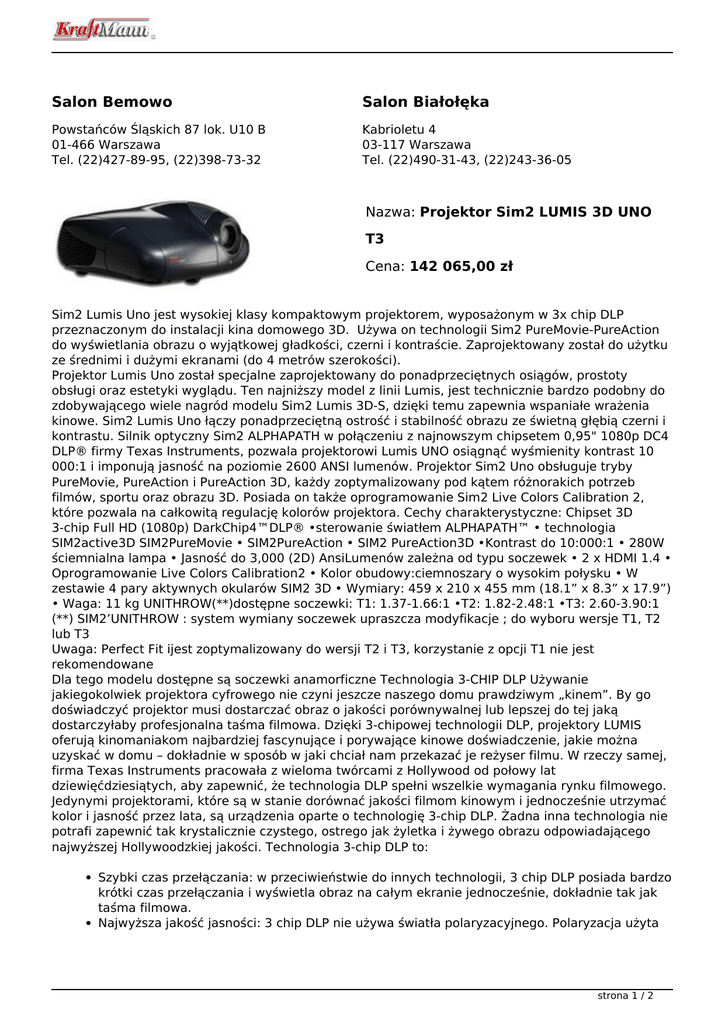 Salon Bemowo Salon Białołęka Powstańców Śląskich 87 lok. U10 B 01-466 Warszawa Tel. (22)427-89-95, (22)398-73-32 Kabrioletu 4 03-117 Warszawa Tel. (22)490-31-43, (22)243-36-05 Nazwa: Projektor Sim2 LUMIS 3D UNO T3 Cena: 142 065,00 zł Sim2 Lumis Uno jest wysokiej klasy kompaktowym projektorem, wyposażonym w 3x chip DLP przeznaczonym do instalacji kina domowego 3D. Używa on technologii Sim2 PureMovie-PureAction do wyświetlania obrazu o wyjątkowej gładkości, czerni i kontraście. Zaprojektowany został do użytku ze średnimi i dużymi ekranami (do 4 metrów szerokości). Projektor Lumis Uno został specjalne zaprojektowany do ponadprzeciętnych osiągów, prostoty obsługi oraz estetyki wyglądu. Ten najniższy model z linii Lumis, jest technicznie bardzo podobny do zdobywającego wiele nagród modelu Sim2 Lumis 3D-S, dzięki temu zapewnia wspaniałe wrażenia kinowe. Sim2 Lumis Uno łączy ponadprzeciętną ostrość i stabilność obrazu ze świetną głębią czerni i kontrastu. Silnik optyczny Sim2 ALPHAPATH w połączeniu z najnowszym chipsetem 0,95" 1080p DC4 DLP® firmy Texas Instruments, pozwala projektorowi Lumis UNO osiągnąć wyśmienity kontrast 10 000:1 i imponują jasność na poziomie 2600 ANSI lumenów. Projektor Sim2 Uno obsługuje tryby PureMovie, PureAction i PureAction 3D, każdy zoptymalizowany pod kątem różnorakich potrzeb filmów, sportu oraz obrazu 3D. Posiada on także oprogramowanie Sim2 Live Colors Calibration 2, które pozwala na całkowitą regulację kolorów projektora. Cechy charakterystyczne: Chipset 3D 3-chip Full HD (1080p) DarkChip4™DLP® •sterowanie światłem ALPHAPATH™ • technologia SIM2active3D SIM2PureMovie • SIM2PureAction • SIM2 PureAction3D •Kontrast do 10:000:1 • 280W ściemnialna lampa • Jasność do 3,000 (2D) AnsiLumenów zależna od typu soczewek • 2 x HDMI 1.4 • Oprogramowanie Live Colors Calibration2 • Kolor obudowy:ciemnoszary o wysokim połysku • W zestawie 4 pary aktywnych okularów SIM2 3D • Wymiary: 459 x 210 x 455 mm (18.1” x 8.3” x 17.9”) • Waga: 11 kg UNITHROW(**)dostępne soczewki: T1: 1.37-1.66:1 •T2: 1.82-2.48:1 •T3: 2.60-3.90:1 (**) SIM2’UNITHROW : system wymiany soczewek upraszcza modyfikacje ; do wyboru wersje T1, T2 lub T3 Uwaga: Perfect Fit ijest zoptymalizowany do wersji T2 i T3, korzystanie z opcji T1 nie jest rekomendowane Dla tego modelu dostępne są soczewki anamorficzne Technologia 3-CHIP DLP Używanie jakiegokolwiek projektora cyfrowego nie czyni jeszcze naszego domu prawdziwym „kinem”. By go doświadczyć projektor musi dostarczać obraz o jakości porównywalnej lub lepszej do tej jaką dostarczyłaby profesjonalna taśma filmowa. Dzięki 3-chipowej technologii DLP, projektory LUMIS oferują kinomaniakom najbardziej fascynujące i porywające kinowe doświadczenie, jakie można uzyskać w domu – dokładnie w sposób w jaki chciał nam przekazać je reżyser filmu. W rzeczy samej, firma Texas Instruments pracowała z wieloma twórcami z Hollywood od połowy lat dziewięćdziesiątych, aby zapewnić, że technologia DLP spełni wszelkie wymagania rynku filmowego. Jedynymi projektorami, które są w stanie dorównać jakości filmom kinowym i jednocześnie utrzymać kolor i jasność przez lata, są urządzenia oparte o technologię 3-chip DLP. Żadna inna technologia nie potrafi zapewnić tak krystalicznie czystego, ostrego jak żyletka i żywego obrazu odpowiadającego najwyższej Hollywoodzkiej jakości. Technologia 3-chip DLP to: Szybki czas przełączania: w przeciwieństwie do innych technologii, 3 chip DLP posiada bardzo krótki czas przełączania i wyświetla obraz na całym ekranie jednocześnie, dokładnie tak jak taśma filmowa. Najwyższa jakość jasności: 3 chip DLP nie używa światła polaryzacyjnego. Polaryzacja użyta strona 1 / 2 w innych technologiach (np. LCD) powoduje około 50% stratę efektywności. Najwierniejsze odwzorowanie kolorów: Architektura 3-chipowa dostarcza głęboką gamę kolorów i ekstremalnie dokładne ich odwzorowanie. Zwiększona głębia: 3-chip DLP dostarcza do 14 bitów skali szarości na jeden kanał koloru na ekranie. Niezawodność: Wydajność systemu 3-chip DLP pozostaje niezmiennie wybitna przez cały okres życia projektora. Silnik optyczny Sim2 Alpha Path Najważniejszym komponentem projektora w instalacji kina domowego był zawsze silnik optyczny. Precyzja obrazu wyświetlanego przez projektor jest w pełni zależna od jakości tej części układu optycznego. W celu osiągnięcia najlepszej jakości wyświetlanego obrazu, potrzebny jest delikatny balans pomiędzy silnikiem optycznym, chipsetem DLP i elektroniką urządzenia. W oparciu o swoje doświadczenie z projektowania silników optycznych klasy high-end, Sim2 wyprodukowało innowacyjny system optyczny mający na celu zmianę rozmiaru ścieżki światła i jednocześnie utrzymanie jej długości oraz kompaktowości. Tak upakowana, opatentowana i nazwana ALPHAPATH ścieżka światła jest rezultatem lat zaawansowanych badań i analiz przeprowadzanych przez Sim2. Odlewana kokilowo obudowa dla lepszego chłodzenia: Nowa, kokilowo odlewana konstrukcja drastycznie poprawia własności cieplne silnika optycznego, co oznacza, że projektory Sim2 mogą używać znacznie mocniejszych lamp by wyświetlać jeszcze jaśniejszy obraz. Zwężany rod-integrator dla większej jednolitości obrazu: celem rod-integratora jest przyjęcie surowej energii świetlnej z lampy i przetworzenie jej na czysty i dopracowany promień światła. Jest to także miejsce, gdzie punktowe światło z lampy jest przemieniane w precyzyjny obraz 16:9. Nowy zwężony kształt pomaga w późniejszej poprawie jednolitości kolorów i efektywności transmisji światła. Nowa powłoka na pryzmacie dla późniejszej poprawy jakości kolorów: Potrójne DMD (Digital Micro-Mirror Device) są wmontowane bezpośrednio w pryzmaty, dzięki czemu są one niezwykle przejrzyste co jest kluczow