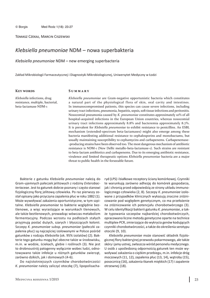 © Borgis Med Rodz 1(18): 23-27 Tomasz Czekaj, Marcin Ciszewski Klebsiella pneumoniae NDM – nowa superbakteria Klebsiella pneumoniae NDM – new emerging superbacteria Zakład Mikrobiologii Farmaceutycznej i Diagnostyki Mikrobiologicznej, Uniwersytet Medyczny w Łodzi Key words Summary Klebsiella infections, drug resistance, multiple, bacterial, beta-lactamase NDM-1 Klebsiella pneumoniae are Gram-negative opportunistic bacteria which constitutes a natural part of the physiological f lora of skin, oral cavity and intestines. In immunocompromised patients, this species can cause severe infections, including urinary tract infections, pneumonia, hepatitis, sepsis, soft tissue infections and peritonitis. Nosocomial pneumonia caused by K. pneumoniae constitutes approximately 10% of all hospital-acquired infections in the European Union countries, whereas nosocomial urinary tract infections approximately 8.8% and bacteremia approximately 8.7%. It is prevalent for Klebsiella pneumoniae to exhibit resistance to penicillins. An ESBL mechanism (extended-spectrum beta-lactamases) might also emerge among these bacteria manifesting additional resistance to cephalosporins and monobactams, but usually maintaining susceptibility to cephamycins and carbapenems. Carbapenemase-producing strains have been observed too. The most dangerous mechanism of antibiotic resistance is NDM-1 (New Delhi metallo-beta-lactamase-1). Such strains are resistant to beta-lactam antibiotics and carbapenems. Due to its emerging antibiotic resistance, virulence and limited therapeutic options Klebsiella pneumoniae bacteria are a major threat to public health in the forseeable future. Bakterie z gatunku Klebsiella pneumoniae należą do Gram-ujemnych pałeczek jelitowych z rodziny Enterobacteriaceae. Jest to gatunek dobrze poznany i często stanowi fizjologiczną florę jelitową człowieka. Po raz pierwszy został opisany jako przyczyna zapalenia płuc w roku 1882 (1). Może wywoływać zakażenia oportunistyczne, w tym szpitalne. Klebsiella pneumoniae to bakterie względnie beztlenowe, a więc wyrastające w warunkach tlenowych, ale także beztlenowych, prowadząc wówczas metabolizm fermentacyjny. Podczas wzrostu na podłożach stałych przyjmują postać dużych, szarych i błyszczących kolonii. Szczepy K. pneumoniae subsp. pneumoniae (pałeczki zapalenia płuc) są najczęściej izolowanymi w Polsce pośród gatunków z rodzaju Klebsiella (ok. 95% izolatów) (2). Bakterie tego gatunku mogą być obecne także w środowisku, m.in. w wodzie, ściekach, glebie i roślinach (3). Nie jest to drobnoustrój patogenny wyłącznie wobec ludzi, odnotowywano także infekcje u różnych gatunków zwierząt, zarówno dzikich, jak i domowych (4-6). Do najistotniejszych czynników chorobotwórczości K. pneumoniae należy zaliczyć otoczkę (7), lipopolisachaMedycyna rodzinna 1/2015 ryd (LPS) i białkowe receptory ściany komórkowej. Czynniki te warunkują zarówno adhezję do komórek gospodarza, jak i chronią przed odpowiedzią ze strony układu immunologicznego człowieka (2, 8). Szczepy K. pneumoniae izolowane z przypadków klinicznych wykazują znaczne zróżnicowanie pod względem genetycznym, co ma przełożenie na zróżnicowanie ich potencjału chorobotwórczego (3). W celu identyfikacji bakterii gatunku K. pneumoniae, a także typowania szczepów najbardziej chorobotwórczych, opracowano liczne metody genetyczne oparte na technice multiplex-PCR, zmierzające do wykrycia genów kodujących czynniki chorobotwórczości, a także do określenia serotypu otoczki (9, 10). Klebsiella pneumoniae może stanowić składnik fizjologicznej flory bakteryjnej przewodu pokarmowego, ale także skóry i jamy ustnej, zwłaszcza wśród personelu medycznego. U osób z upośledzoną odpornością gatunek ten może wywoływać zakażenia o ciężkim przebiegu, m.in. infekcje dróg moczowych (11, 12), zapalenia płuc (13, 14), wątroby (15), posocznicę (16), zakażenia tkanek miękkich (17) i zapalenie otrzewnej (18). 23 Tomasz Czekaj, Marcin Ciszewski Niezwykle istotnym problemem są zakażenia szpitalne K. pneumoniae. W środowisku szpitalnym bakterie te nie tylko zyskują szansę na swobodne rozprzestrzenianie się i infekowanie pacjentów o obniżonej odporności, ale także na pozyskiwanie genów, np. w drodze poziomego transferu materiału genetycznego (ang. horizontal gene transfer – HGT), kodujących czynniki chorobotwórczości, a także warunkujących lekooporność. W takich warunkach istnieje największe ryzyko selekcji szczepów wieloopornych. Według Raportów Epidemiologicznych Unii Europejskiej zapalenia płuc wywoływane w warunkach szpitalnych przez K. pneumoniae stanowią średnio ok. 10% wszystkich zakażeń szpitalnych w państwach UE, szpitalne zakażenia dróg moczowych tym drobnoustrojem – średnio 8,8%, a zakażenia krwi spowodowane przez K. pneumoniae to średnio 8,7% wszystkich zakażeń szpitalnych w Unii Europejskiej. Według tego samego raportu, w Polsce odsetek wieloopornych szczepów Klebsiella pneumoniae wynosi pomiędzy 25 a 50%, co stanowi jeden z najwyższych wyników w Europie – dla porównania ten odsetek w Szwecji wynosi ok. 2% (19). Bakterie Klebsiella pneumoniae zazwyczaj są oporne na penicyliny, bowiem wytwarzanie beta-laktamaz kodowane jest przez geny znajdujące się na obecnych w komórce plazmidach. Niekiedy jednak, najprawdopodobniej w drodze wymiany materiału genetycznego, wykształcany jest mechanizm ESBL (ang. extended-spectrum beta-lactamase), a więc zdolność do wytwarzania beta-laktamaz o poszerzonym spektrum działania. Takie szczepy są wówczas oporne na penicyliny, cefalosporyny i monobaktamy, zazwyczaj zachowując wrażliwość na cefamycyny i karbapenemy (20). Charakterystykę fenotypową oraz genotypową szczepów K. pneumoniae wykazujących mechanizm oporności ESBL opisano w wielu krajach, m.in. w Polsce (21), Niemczech (22), Macedonii (23) oraz w Arabii Saudyjskiej (24). Me