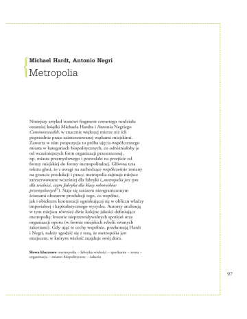 } Metropolia Michael Hardt, Antonio Negri Niniejszy artykuł stanowi fragment czwartego rozdziału ostatniej książki Michaela Hardta i Antonia Negriego Commonwealth, w znacznie większej mierze niż ich poprzednie prace zainteresowanej wątkami miejskimi. Zawarta w nim propozycja to próba ujęcia współczesnego miasta w kategoriach biopolitycznych, co odróżniałoby je od wcześniejszych form organizacji przestrzennej, np. miasta przemysłowego i pozwalało na przejście od formy miejskiej do formy metropolitalnej. Główna teza tekstu głosi, że z uwagi na zachodzące współcześnie zmiany na gruncie produkcji i pracy, metropolia zajmuje miejsce zarezerwowane wcześniej dla fabryki („metropolia jest tym dla wielości, czym fabryka dla klasy robotników przemysłowych”). Staje się zarazem nieograniczonym ścianami obszarem produkcji tego, co wspólne, jak i obiektem kontestacji ogniskującej się w obliczu władzy imperialnej i kapitalistycznego wyzysku. Autorzy analizują w tym miejscu również dwie kolejne jakości definiujące metropolię: kwestie nieprzewidywalnych spotkań oraz organizacji oporu (w formie miejskich rebelii zwanych żakeriami). Gdy ująć te cechy wspólnie, przekonują Hardt i Negri, należy zgodzić się z tezą, że metropolia jest miejscem, w którym wielość znajduje swój dom. Słowa kluczowe: metropolia – fabryka wielości – spotkanie – renta – organizacja – miasto biopolityczne – żakeria 97 anzpraktyka cyteroet 2-3/2011 Sprawię, że miasta zarzucą sobie ramiona na szyje i staną się nierozłączne, Dzięki miłości towarzyszy, Dzięki męskiej miłości towarzyszy. Walt Whitman Metropolia może być rozumiana przede wszystkim jako szkielet i rdzeń kręgowy wielości. Oznacza architektoniczne i społeczne środowisko, wspierające jej aktywność, a także tworzące zbiór i afektywny zestaw umiejętności, relacji społecznych, zwyczajów, pragnień, wiedzy i obiegów kulturowych. Metropolia nie tylko wpisuje się w przeszłość wielości, ale również reaktywuje ją – minione formy podporządkowania, cierpienia i walki; stwarza także warunki, zarazem negatywne i pozytywne, dla jej przyszłości. Organiczne metafory tego rodzaju mogą być jednak mylące, zbyt często bowiem implikują funkcjonalistyczne i hierarchiczne relacje: przywództwo głowy, posłuszeństwo rąk itp. Chcemy w zamian pojmować metropolię jako ciało nieorganiczne, a zatem ciało wielości bez organów. Jak pisał Marks we fragmencie, który zainspirował Deleuze’a i Guattariego, „[p]rzyroda, o ile sama nie jest ciałem ludzkim, jest nieorganicznym ciałem człowieka”2. Jak wyjaśnia Marks, natura stanowi bogactwo dobra wspólnego, będące bazą dla twórczej działalności człowieka, z kolei przeszłe działania ludzi są wpisane, niejako odnotowane przez naturę. W dobie produkcji biopolitycznej rolę nieorganicznego ciała wielości spełnia w coraz większym stopniu metropolia. W istocie, gdy skupić uwagę na produkcji, dochodzi się do jeszcze precyzyjniejszej i bardziej sugestywnej analogii: metropolia jest dla wielości tym, czym fabryka dla klasy robotników przemysłowych.W poprzedniej epoce fabryka stanowiła główne miejsce i zapewniała warunki dla trzech aktywności, centralnych z punktu widzenia robotników przemysłowych: produkcji; wewnętrznych spotkań i organizacji; ekspresji antagonizmów i rebelii. Współcześnie produktywne działania wielości przekraczają jednak mury fabryki i przenikają całą metropolię. W procesie tym jakości i potencjał wspomnianych aktywności poddawane są fundamentalnej transformacji. Rozpoczynamy śledzenie tych zmian od rozważenia aktywności wielości na gruncie wspomnianych dziedzin: produkcji, spotkań i antagonizmu. Metropolia jest miejscem biopolitycznej produkcji, ponieważ jest przestrzenią tego, co wspólne, miejscem żyjących razem ludzi, dzielących zasoby, komunikujących, wymieniających się dobrami i ideami. Współczesny język włoski zachowuje znaczenie średniowiecznej łaciny, w której dobro wspólne – włoskie il comune – było słowem oznaczającym miasto. Dobro wspólne służące za podstawę biopolitycznej produkcji, co odkryliśmy w części trzeciej tej książki, jest nie tyle „naturalnym dobrem wspólnym” osadzonym w materialnych zasobach ziemi, minerałach, wodzie, gazie, co „sztucznym dobrem wspólnym” tkwiącym w językach, obrazach, wiedzy, afektach, kodach, zwyczajach i praktykach. „Sztuczne dobra wspólne” przenikają cały obszar metropolitalny i ustanawiają samą metropolię. Jest ona zatem całkowicie włączona w cykl biopolitycznej produkcji: dostęp do zawartych w niej rezerw dobra wspólnego stanowi podstawę produkcji, a jej rezultaty są na nowo wpisywane w metropolię, transformując ją i ponownie konstytuując. Metropolia jest fabryką produkującą dobro wspólne. W przeciwieństwie do produkcji wielkoprzemysłowej, cykl produkcji biopolitycznej jest w coraz większym stopniu autonomiczny względem kapitału. Charakterystyczne dla wspomnianego cyklu schematy współpracy generowane są w samym procesie produkcji, a każde narzucenie kontroli stanowi przeszkodę dla jego produktywności. Podczas gdy fabryka przemysłowa generuje zysk, jej produktywność uzależniona jest bowiem od kapitalistycznych schematów kooperacji i kontroli, metropolia generuje przede wszystkim rentę, stanowiącą jedyny sposób, dzięki któremu kapitał zdolny jest przechwycić autonomicznie wypracowane bogactwo. Wartość miejskich nieruchomości jest zatem w dużej mierze wyrazem dobra wspólnego lub tego, co ekonomiści nazywają „efektami zewnętrznymi” osadzonymi w „otaczającym” je terenie metropolitalnym. Owe aspekty biopolitycznej produkcji analizowaliśmy w części trzeciej. Teraz możemy zrozumieć je lepiej w ich usytuowaniu w metropolii. Produkcja biopolityczna przekształca miasto, tworząc nową formę metropolitalną.