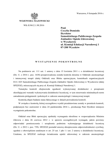 Warszawa, 8 listopada 2016 r. WOJEWODA MAZOWIECKI WK-II.9612.1.98.2016 Pani Cecylia Domżała Dyrektor Samodzielnego Publicznego Zespołu Zakładów Opieki Zdrowotnej w Wyszkowie ul. Komisji Edukacji Narodowej 1 07-200 Wyszków WYSTĄPIENIE POKONTROLNE Na podstawie art. 111 ust. 1 ustawy z dnia 15 kwietnia 2011 r. o działalności leczniczej (Dz. U. z 2016 r. poz. 1638) przeprowadzona została kontrola doraźna w Oddziale anestezjologii i intensywnej terapii (dalej Oddział) oraz Bloku operacyjnym, komórkach organizacyjnych 014 i 025 Samodzielnego Publicznego Zespołu Zakładów Opieki Zdrowotnej w Wyszkowie (dalej SPZZOZ), mieszczących się przy ul. Komisji Edukacji Narodowej 1. Tematyka kontroli obejmowała zgodność wykonywanej działalności z przepisami określającymi warunki wykonywania działalności leczniczej, w tym stosowanie minimalnych norm zatrudnienia pielęgniarek i położnych w zakresie anestezjologii i intensywnej terapii. Kontrolą objęto badanie stanu faktycznego w dniach prowadzenia kontroli. W związku z kontrolą, której szczegółowe wyniki przedstawione zostały w protokole kontroli, podpisanym bez zastrzeżeń w dniu 24 października 2016 r., przekazuję Pani Dyrektor niniejsze wystąpienie pokontrolne. Oddział oraz Blok operacyjny spełniały wymagania określone w rozporządzeniu Ministra Zdrowia z dnia 26 czerwca 2012 r. w sprawie szczegółowych wymagań, jakim powinny odpowiadać pomieszczenia i urządzenia podmiotu wykonującego działalność leczniczą (Dz. U. z 2012 r. poz. 739). SPZZOZ posiadał umowę ubezpieczenia odpowiedzialności cywilnej, zgodnie z obowiązkiem ustalonym w art. 25 ust. 1 pkt 1 i ust. 2 ustawy o działalności leczniczej. Ustalono, że SPZZOZ realizuje świadczenia opieki zdrowotnej w zakresie anestezjologii i intensywnej opieki medycznej w ramach umowy zawartej z Narodowym Funduszem Zdrowia (dalej NFZ) na poziomie pierwszego stopnia referencyjności, zgodnie z warunkami szczegółowymi określonymi przez NFZ. W trakcie kontroli stwierdzono, że Oddział dysponował 4 łóżkami intensywnej opieki medycznej – jak ustalono w księdze rejestrowej podmiotu leczniczego. W ramach Oddziału funkcjonowało stanowisko dializacyjne oraz miejsce pobytu dziennego. W obszarze bloku operacyjnego wydzielono 2 sale operacyjne oraz dwustanowiskową salę nadzoru poznieczuleniowego. Oddział i blok operacyjny były ze sobą funkcjonalnie powiązane, a świadczeń medycznych udzielał jeden zespół pielęgniarski, pracujący w oparciu o rozkłady pracy pielęgniarek w poszczególnych miesiącach. Zatrudnione w Oddziale pielęgniarki zabezpieczały ciągłość udzielanych świadczeń zdrowotnych w Oddziale, w bloku operacyjnym (2 stanowiska znieczulenia), w sali nadzoru poznieczuleniowego (2 stanowiska), w sali cięć cesarskich, podczas zabiegów diagnostyczno-endoskopowych oraz doraźnie w przypadku interwencji w pozostałych oddziałach szpitala. W Oddziale zatrudnionych było 25 pielęgniarek i 1 pielęgniarz, w tym 5 specjalistek pielęgniarstwa anestezjologicznego i intensywnej opieki oraz 19 pielęgniarek, które ukończyły kurs kwalifikacyjny w zakresie pielęgniarstwa anestezjologicznego i intensywnej terapii, co wypełniało wymogi dotyczące kwalifikacji pielęgniarek ustalone dla oddziału anestezjologii i intensywnej terapii przez NFZ. Ponadto jedna pielęgniarka i pielęgniarz posiadali tytuł licencjata pielęgniarstwa. W dokumentacji podmiotu zgromadzono dokumenty potwierdzające kwalifikacje oraz prawo wykonywania zawodu aktualnie zatrudnionej kadry pielęgniarskiej. SPZZOZ posiadał ustalone minimalne normy zatrudnienia pielęgniarek i położnych. Prace związane z ustaleniem norm rozpoczęte zostały w lutym 2013 r. Do opracowania projektu minimalnych norm zatrudnienia pielęgniarek i położnych w podmiocie powołany został zespół, którym kierowała Naczelna Pielęgniarka. Z Zarządzenia nr 3/2013 z dnia 26 lutego 2013 r., nr 4/2014 z 24 marca 2014 r. oraz nr 5/2014 z 28 marca 2014 r. Dyrektora SPZZOZ w Wyszkowie wynikał zakres danych i informacji, który należy uwzględnić podczas ustalania minimalnych norm zatrudnienia pielęgniarek i położnych, a w odniesieniu do anestezjologii i intensywnej terapii zobowiązano również do uwzględnienia w trakcie prac wytycznych wynikających z rozporządzenia Ministra Zdrowia z dnia 22 listopada 2013 r. w sprawie świadczeń gwarantowanych z zakresu leczenia szpitalnego (dalej rozporządzenie w sprawie świadczeń gwarantowanych – Dz. U. z 2013 r. poz. 1520). Z ww. zarządzenia wynikało, że w okresie od 1 marca 2013 r. do 28 lutego 2014 r. pielęgniarki i położne zostały zobowiązane do prowadzenia w oddziałach szpitalnych codziennej kwalifikacji pacjentów do właściwej kategorii opieki według kryteriów określonych w załącznikach do rozporządzenia Ministra Zdrowia z dnia 2 28 grudnia 2012 r. w sprawie sposobu ustalania minimalnych norm zatrudnienia pielęgniarek i położnych w podmiotach leczniczych niebędących przedsiębiorcami (dalej rozporządzenie w sprawie minimalnych norm zatrudnienia – Dz. U. z 2012 r. poz. 1545). Zgodnie z zapisami ww. Zarządzenia średnia liczba pacjentów oraz średni dobowy czas świadczeń pielęgniarskich bezpośrednich dla danej kategorii opieki zostaną ustalone przez Dyrektora po uwzględnieniu kategorii opieki, do której pacjent został zakwalifikowany. W wyniku kontroli ustalono, że placówka nie dysponuje dokumentami roboczymi dokumentującymi wykonywanie koniecznych czynności podczas kategoryzacji pacjentów oraz wykorzystanie wymaganych danych i informacji ustalonych w rozporządzeniu w sprawie minimalnych norm zatrudnienia w celu prawidłowego ustalenia minimalnych norm zatrudnienia pielęgniarek i położnych. Pielęgniarki nie prowadziły w Oddziale czynności w zakresie kwalifikowania pacjentów do właściwej kategorii opieki zgodnie z kryteriami określonymi w ww. rozporządzeniu. Dyrektor SPZZOZ zas