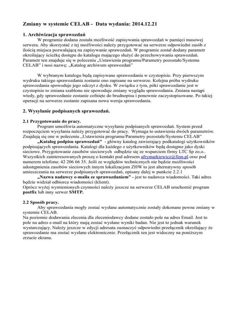 Zmiany w systemie CELAB - Data wydania: 2014.12.21 1. Archiwizacja sprawozdań W programie dodana została możliwość zapisywania sprawozdań w pamięci masowej serwera. Aby skorzystać z tej możliwości należy przygotować na serwerze odpowiedni zasób z ilością miejsca pozwalającą na zapisywanie sprawozdań. W programie został dodany parametr określający ścieżkę dostępu do katalogu mającego służyć do przechowywania sprawozdań. Parametr ten znajduje się w poleceniu „Ustawienia programu/Parametry pozostałe/Systemu CELAB” i nosi nazwę: „Katalog archiwum sprawozdań” W wybranym katalogu będą zapisywane sprawozdania w czystopisie. Przy pierwszym wydruku takiego sprawozdania zostanie ono zapisane na serwerze. Kolejna próba wydruku sprawozdania spowoduje jego odczyt z dysku. W związku z tym, póki sprawozdanie jest w czystopisie to zmiana szablonu nie spowoduje zmiany wyglądu sprawozdania. Zmiana nastąpi wtedy, gdy sprawozdanie zostanie cofnięte do brudnopisu i ponownie zaczystopisowane. Po takiej operacji na serwerze zostanie zapisana nowa wersja sprawozdania. 2. Wysyłanie podpisanych sprawozdań. 2.1 Przygotowanie do pracy. Program umożliwia automatyczne wysyłanie podpisanych sprawozdań. System przed rozpoczęciem wysyłania należy przygotować do pracy. Wymaga to ustawienia dwóch parametrów. Znajdują się one w poleceniu „Ustawienia programu/Parametry pozostałe/Systemu CELAB” „Katalog podpisu sprawozdań” - główny katalog zawierający podkatalogi użytkowników podpisujących sprawozdania. Katalogi dla każdego z użytkowników będą dostępne jako dyski sieciowe. Przygotowanie zasobów sieciowych odbędzie się ze wsparciem firmy LTC Sp zo.o.. Wszystkich zainteresowanych proszę o kontakt pod adresem [email protected] oraz pod numerem telefonu: 42 206 66 35. Jeśli ze względów technicznych nie będzie możliwości udostępnienia zasobów sieciowych innym lokalizacjom ZHW to jest alternatywny sposób umieszczania na serwerze podpisanych sprawozdań, opisany dalej w punkcie 2.2.1 „Nazwa nadawcy e-maila ze sprawozdaniem” - jest to nadawca wiadomości. Taki adres będzie widział odbiorca wiadomości (klient). Oprócz wyżej wymienionych czynności należy jeszcze na serwerze CELAB uruchomić program postfix lub inny serwer SMTP. 2.2 Sposób pracy. Aby sprawozdania mogły zostać wysłane automatycznie zostały dokonane pewne zmiany w systemie CELAB. Na poziomie dodawania zlecenia dla zleceniodawcy dodane zostało pole na adres Email. Jest to pole na adres e-mail na który mają zostać wysłane wyniki badan. Nie jest to jednak warunek wystarczający. Należy jeszcze w edycji adresata zaznaczyć odpowiedni przełącznik określający że sprawozdanie ma zostać wysłane elektronicznie. Przełącznik ten jest widoczny na poniższym zrzucie ekranu. Na formularzu jest jeszcze jedno dodatkowe pole, jest to Data wysłania. Pole to uzupełni sie jeśli sprawozdanie wraz z podpisem zostanie wysłane. Ten sam formularz można otworzyć z poziomu sprawozdania. Trzeba w tym celu użyć polecenia „Edytuj adresatów” a potem polecenia edycja na wybranej pozycji. Po wygenerowaniu sprawozdania i ustawienia statusu na czystopis, wybieramy opcję drukowania sprawozdania. Od aktualnej wersji systemu CELAB sprawozdania przy wydruku mają nazwę numeryczną pozwalającą na identyfikację sprawozdania. Jeśli sprawozdanie ma być podpisane i wysłane elektronicznie nie wolno tej nazwy zmieniać. Pobrane sprawozdanie zapisujemy na dysku i korzystając z oprogramowania dostarczonego do karty podpisujemy. Po podpisaniu należy sprawozdanie wraz z podpisem umieścić w udostępnionym na serwerze zasobie sieciowym lub w przypadku braku takiej możliwości zastosować się do poniższego opisu. 2.2.1 Wysyłanie sprawozdania wraz z podpisem na serwer poprzez system CELAB. W systemie CELAB na dole strony została dodana specjalna ramka. Ramka ta zawiera specjalny obszar oznaczony przerywaną linią. Aby skorzystać z tego obszaru należy otworzyć w systemie operacyjnym folder zawierający sprawozdanie wraz z podpisem. Folder ustawiamy na ekranie w ten sposób alby było widać przeglądarkę internetową i opisywaną wcześniej ramkę. Zaznaczamy wybrane pary plików (sprawozdanie,podpis) i na zaznaczeniu wciskamy lewy przycisk myszy, przytrzymujemy przycisk i przesuwamy kursor w obramowane pole. Następnie zwalniamy lewy przycisk. Zaznaczone pliku zostaną skopiowane do katalogu na serwerze aplikacji. Po skończonym kopiowaniu wyświetlony zostanie komunikat informujący o tym czy pliki zostały umieszczone na serwerze. System CELAB co określony czas sprawdza zawartość katalogu z podpisanymi sprawozdaniami i wysyła za pomocą wewnętrznego serwera SMTP wiadomość zawierającą dwa załączniki (sprawozdanie oraz podpis). Temat wiadomości zawiera numer sprawozdania. Jeśli wiadomość zostanie wysłana to w adresacie zostanie wypełnione pole Data wysłania. 3. Nowe pola na formularzu zlecenia i na wydruku sprawozdania. Na formularzu zlecenia na zakładce informacje zostały dodane trzy nowe pola - Cel badania - Procedura pobierania próbek - Plan pobierania próbek Wszystkie te pola mają pole tekstowe oraz słownikowe pozwalające na ich uzupełnienie. Wszystkie trzy pola drukują się na zleceniu. Na sprawozdaniu drukują się dwa ostatnie. 4. Nowy typ pola wyników (miara logarytmiczna z przeliczaniem) Dodany został nowy typ pola wynikowego pozwalający na wpisywanie wyniku w mierze logarytmicznej i przeliczanie na kilka sposobów. Jeśli takie pole zostanie zdefiniowane dla jakiejś metody to przy wprowadzaniu wyników pod nazwą metody będziemy mieli do wyboru sposób prezentacji wyniku: - Skala log – wynik podawany bez modyfikacji np: 5,0 ± 0,3 [log10 (jtk/g)] - Logarytm zakres – wynik podawany jako zakres 5,0 [log10 (jtk/g)] [4,7;5,3] - Zwykły zakres – wynik przeliczony na postać zwykłą z zakresem np: 1,0*105 jtk/g [5,01 * 1