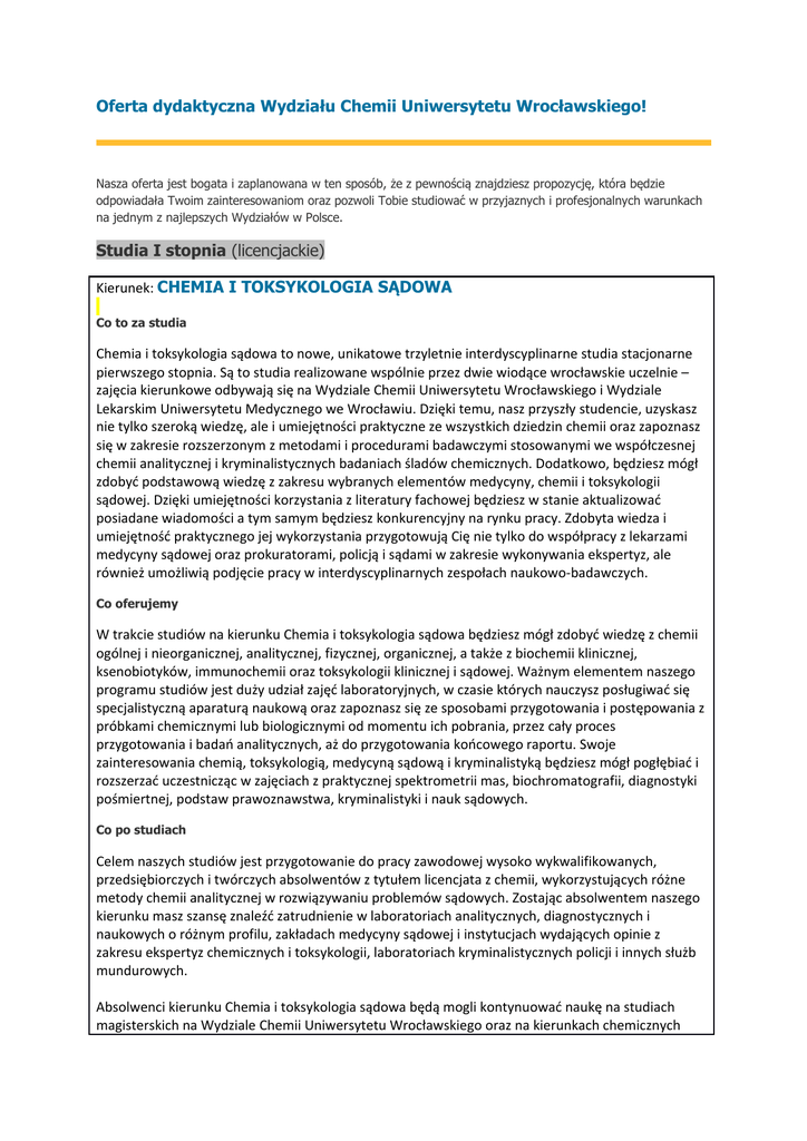 Oferta dydaktyczna Wydziału Chemii Uniwersytetu Wrocławskiego! Nasza oferta jest bogata i zaplanowana w ten sposób, że z pewnością znajdziesz propozycję, która będzie odpowiadała Twoim zainteresowaniom oraz pozwoli Tobie studiować w przyjaznych i profesjonalnych warunkach na jednym z najlepszych Wydziałów w Polsce. Studia I stopnia (licencjackie) Kierunek: CHEMIA I TOKSYKOLOGIA SĄDOWA Co to za studia Chemia i toksykologia sądowa to nowe, unikatowe trzyletnie interdyscyplinarne studia stacjonarne pierwszego stopnia. Są to studia realizowane wspólnie przez dwie wiodące wrocławskie uczelnie – zajęcia kierunkowe odbywają się na Wydziale Chemii Uniwersytetu Wrocławskiego i Wydziale Lekarskim Uniwersytetu Medycznego we Wrocławiu. Dzięki temu, nasz przyszły studencie, uzyskasz nie tylko szeroką wiedzę, ale i umiejętności praktyczne ze wszystkich dziedzin chemii oraz zapoznasz się w zakresie rozszerzonym z metodami i procedurami badawczymi stosowanymi we współczesnej chemii analitycznej i kryminalistycznych badaniach śladów chemicznych. Dodatkowo, będziesz mógł zdobyć podstawową wiedzę z zakresu wybranych elementów medycyny, chemii i toksykologii sądowej. Dzięki umiejętności korzystania z literatury fachowej będziesz w stanie aktualizować posiadane wiadomości a tym samym będziesz konkurencyjny na rynku pracy. Zdobyta wiedza i umiejętność praktycznego jej wykorzystania przygotowują Cię nie tylko do współpracy z lekarzami medycyny sądowej oraz prokuratorami, policją i sądami w zakresie wykonywania ekspertyz, ale również umożliwią podjęcie pracy w interdyscyplinarnych zespołach naukowo-badawczych. Co oferujemy W trakcie studiów na kierunku Chemia i toksykologia sądowa będziesz mógł zdobyć wiedzę z chemii ogólnej i nieorganicznej, analitycznej, fizycznej, organicznej, a także z biochemii klinicznej, ksenobiotyków, immunochemii oraz toksykologii klinicznej i sądowej. Ważnym elementem naszego programu studiów jest duży udział zajęć laboratoryjnych, w czasie których nauczysz posługiwać się specjalistyczną aparaturą naukową oraz zapoznasz się ze sposobami przygotowania i postępowania z próbkami chemicznymi lub biologicznymi od momentu ich pobrania, przez cały proces przygotowania i badań analitycznych, aż do przygotowania końcowego raportu. Swoje zainteresowania chemią, toksykologią, medycyną sądową i kryminalistyką będziesz mógł pogłębiać i rozszerzać uczestnicząc w zajęciach z praktycznej spektrometrii mas, biochromatografii, diagnostyki pośmiertnej, podstaw prawoznawstwa, kryminalistyki i nauk sądowych. Co po studiach Celem naszych studiów jest przygotowanie do pracy zawodowej wysoko wykwalifikowanych, przedsiębiorczych i twórczych absolwentów z tytułem licencjata z chemii, wykorzystujących różne metody chemii analitycznej w rozwiązywaniu problemów sądowych. Zostając absolwentem naszego kierunku masz szansę znaleźć zatrudnienie w laboratoriach analitycznych, diagnostycznych i naukowych o różnym profilu, zakładach medycyny sądowej i instytucjach wydających opinie z zakresu ekspertyz chemicznych i toksykologii, laboratoriach kryminalistycznych policji i innych służb mundurowych. Absolwenci kierunku Chemia i toksykologia sądowa będą mogli kontynuować naukę na studiach magisterskich na Wydziale Chemii Uniwersytetu Wrocławskiego oraz na kierunkach chemicznych innych uczelni. W roku akademickim 2018/19 planowane jest utworzenie na Wydziale Chemii Uniwersytetu Wrocławskiego studiów II stopnia na kierunku Chemia i toksykologia sądowa, które pozwolą rozszerzyć wiedzę zdobytą w trakcie studiów licencjackich i umożliwią ukształtowanie sylwetki absolwenta-specjalisty.