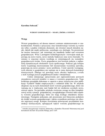 do źródeł wzrostu gospodarczego i jakim czynnikom poświęca się obecnie najwięcej uwagi. Kolejne rozważania poświęcono przykładom konstrukcji teoretycznych, opisujących wpływ wzrostu gospodarczego na