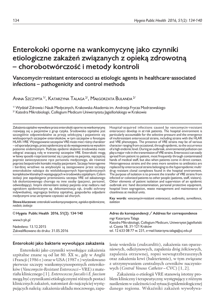 134 Hygeia Public Health 2016, 51(2): 134-140 Enterokoki oporne na wankomycynę jako czynniki etiologiczne zakażeń związanych z opieką zdrowotną – chorobotwórczość i metody kontroli Vancomycin-resistant enterococci as etiologic agents in healthcare-associated infections – pathogenicity and control methods Anna Szczypta 1/, Katarzyna Talaga 2/, Małgorzata Bulanda 2/ 1/ 2/ Wydział Zdrowia i Nauk Medycznych, Krakowska Akademia im. Andrzeja Frycza Modrzewskiego Katedra Mikrobiologii, Collegium Medicum Uniwersytetu Jagiellońskiego w Krakowie Zakażenia szpitalne wywołane przez enterokoki oporne na wankomycynę rozwijają się u pacjentów z grup ryzyka. Środowisko szpitalne jest szczególnie odpowiedzialne za presję selekcyjną i pojawienie się wieloopornych szczepów enterokoków, w tym szczepów o fenotypie HLAR i VRE. Występowanie szczepów VRE może mieć różny charakter – od sporadycznego, przez epidemiczny aż do występowania na wysokim poziomie endemicznym. Podczas epidemii skażenie środowiska może odegrać znaczącą rolę w transmisji szczepów VRE. Enterokoki mogą w łatwy sposób rozprzestrzeniać się z pacjenta na pacjenta, najczęściej poprzez zanieczyszczone ręce personelu medycznego, ale również poprzez bezpośredni kontakt między pacjentami. Szczepy heterogenne i bardziej wrażliwe na antybiotyki są zastępowane przez szczepy enterokoków należące do wielolekoopornych hiperepidemicznych kompleksów klonalnych występujących w środowisku szpitalnym. Celem izolacji jest zapobieganie przeniesieniu szczepu VRE od zakażonego lub skolonizowanego chorego na inne osoby (pacjenci, personel, odwiedzający). Innymi elementami izolacji pacjenta oraz nadzoru nad ogniskiem epidemicznym są: dekontaminacja rąk, środki ochrony indywidualnej, segregacja bielizny szpitalnej, gospodarka odpadami medycznymi oraz utrzymanie czystości sal chorych. Słowa kluczowe: enterokoki wankomycynooporne, ogniska epidemiczne, nadzór, izolacja Hospital-acquired infections caused by vancomycin-resistant enterococci develop in at-risk patients. The hospital environment is particularly accountable for the selective pressure and the emergence of multiresistant enterococcal strains, including strains with the HLAR and VRE phenotypes. The presence of VRE strains may be of various character ranging from occasional, through epidemic, to the occurrence of a high endemic level. During an outbreak, environmental pollution can play a major role in the transmission of VRE strains. Enterococci can easily spread from patient to patient, most frequently through contaminated hands of medical staff, but also when patients come in direct contact. Heterogeneous strains and the ones more sensitive to antibiotics are replaced by enterococcal strains belonging to the hyperepidemic multidrug resistant clonal complexes found in the hospital environment. The purpose of isolation is to prevent the transfer of VRE strains from infected or colonized patients to other people (patients, staff, visitors). Other elements of patient isolation and supervision of an epidemic outbreak are: hand decontamination, personal protective equipment, hospital linen segregation, waste management and maintenance of cleanliness at medical units. Key words: vancomycin-resistant enterococci, outbreaks, surveillance, isolation © Hygeia Public Health 2016, 51(2): 134-140 Adres do korespondencji / Address for correspondence www.h-ph.pl mgr Katarzyna Talaga Katedra Mikrobiologii, Collegium Medicum, Uniwersytet Jagielloński ul. Czysta 18, 31-121 Kraków tel. 12 633 08 77 w. 231, e-mail:[email protected] Nadesłano: 13.12.2015 Zakwalifikowano do druku: 31.05.2016 Enterokoki jako bakterie wywołujące zakażenia Enterokoki jako czynniki wywołujące zakażenia szpitalne znane są od lat 80. XX w., gdy w Anglii i Francji (1986 r.) oraz w USA (1987 r.) wyizolowano pierwsze szczepy wankomycynoopornych enterokoków (Vancomycin-Resistant Enterococci – VRE) z materiału klinicznego [1]. Enterococcus faecalis i E. faecium mogą być czynnikami etiologicznymi różnych postaci klinicznych zakażeń, natomiast do najczęściej występujących należą: zakażenia układu moczowego, zapa- lenie wsierdzia (endocarditis), zakażenia ran oparzeniowych, odleżynowych, zapalenia dróg żółciowych, zapalenia otrzewnej, ropni wewnątrzbrzusznych oraz zakażenia krwi (bakteriemie), w tym związane z utrzymywaniem centralnych cewników naczyniowych (Central Venous Catheter – CVC) [1, 2]. Zakażenia o etiologii VRE stanowią istotny problem kliniczny i terapeutyczny, występujący z różnym nasileniem w zależności od sytuacji epidemiologicznej danego regionu. Wskaźniki zakażeń wywoływa- Szczypta A i wsp. Enterokoki oporne na wankomycynę jako czynniki etiologiczne zakażeń związanych z opieką ... nych przez wankomycynooporne szczepy E. faecium (Vancomycin Resistant E. faecium – VREfm) rosną w europejskich szpitalach od 2000 r., szczególnie zaś w latach 2011-2014 [3, 4]. Sieć EARS-Net (European Antimicrobial Resistance Surveillance Network), która jest narzędziem stworzonym przez ECDC (European Centre for Disease Prevention and Control) jako europejska sieć krajowych systemów nadzoru, zbiera dane dotyczące lekoopornych drobnoustrojów izolowanych z zakażeń inwazyjnych dla celów zdrowia publicznego. W raporcie z 2014 r. (przedstawiającym dane za rok 2012), w większości krajów europejskich odnotowano występowanie VREfm na poziomie poniżej 5%. Tylko w nielicznych krajach oszacowano występowanie VREfm na poziomie ponad 10% [5]. Trzeba jednak pamiętać, iż wskaźniki znacznie różniły się pomiędzy krajami, i tak w Estonii, Finlandii, Islandii i Malcie odsetek szczepów VREfm wynosił 0%, a w Irlandii aż 45,1% [3]. Obecna znaczna tendencja wzrostowa (szczególnie widoczna w latach 2011-2014) wskaźników występowania wankomycynoopornych enterokoków sugeruje, iż rozprzestrzenianie się VREfm w Europie m