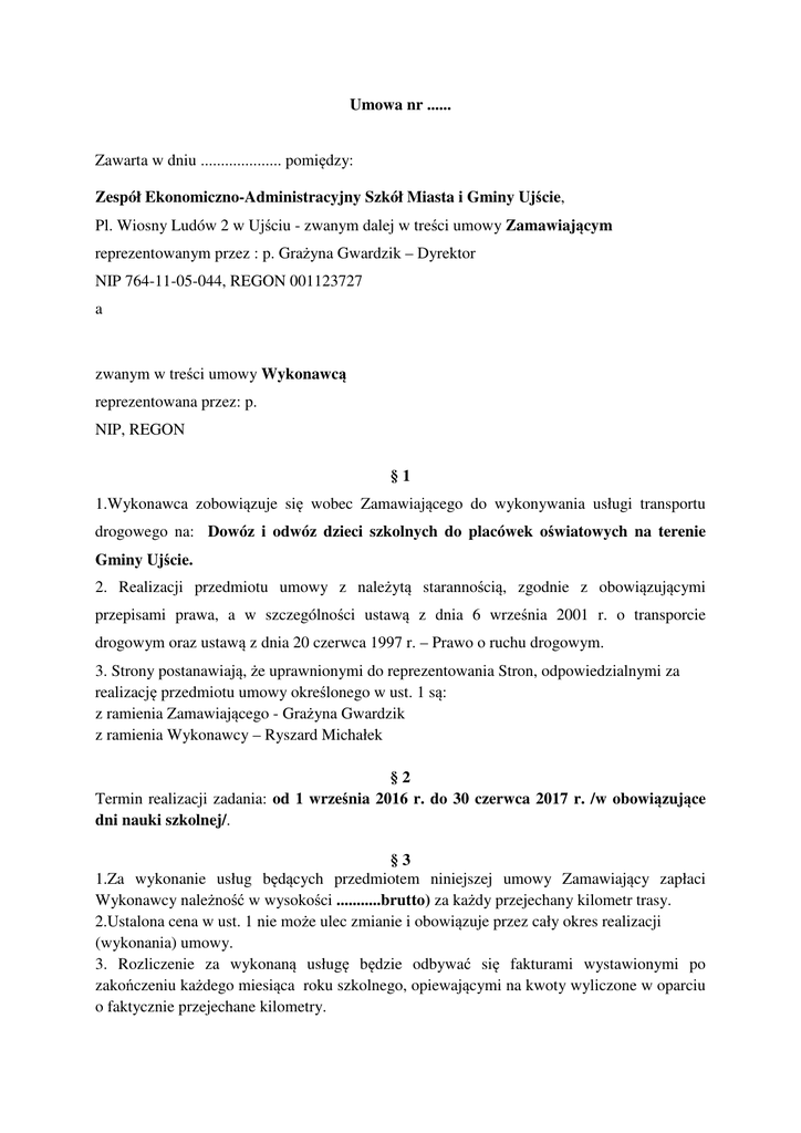 Umowa nr ...... Zawarta w dniu .................... pomiędzy: Zespół Ekonomiczno-Administracyjny Szkół Miasta i Gminy Ujście, Pl. Wiosny Ludów 2 w Ujściu - zwanym dalej w treści umowy Zamawiającym reprezentowanym przez : p. Grażyna Gwardzik – Dyrektor NIP 764-11-05-044, REGON 001123727 a zwanym w treści umowy Wykonawcą reprezentowana przez: p. NIP, REGON §1 1.Wykonawca zobowiązuje się wobec Zamawiającego do wykonywania usługi transportu drogowego na: Dowóz i odwóz dzieci szkolnych do placówek oświatowych na terenie Gminy Ujście. 2. Realizacji przedmiotu umowy z należytą starannością, zgodnie z obowiązującymi przepisami prawa, a w szczególności ustawą z dnia 6 września 2001 r. o transporcie drogowym oraz ustawą z dnia 20 czerwca 1997 r. – Prawo o ruchu drogowym. 3. Strony postanawiają, że uprawnionymi do reprezentowania Stron, odpowiedzialnymi za realizację przedmiotu umowy określonego w ust. 1 są: z ramienia Zamawiającego - Grażyna Gwardzik z ramienia Wykonawcy – Ryszard Michałek §2 Termin realizacji zadania: od 1 września 2016 r. do 30 czerwca 2017 r. /w obowiązujące dni nauki szkolnej/. §3 1.Za wykonanie usług będących przedmiotem niniejszej umowy Zamawiający zapłaci Wykonawcy należność w wysokości ...........brutto) za każdy przejechany kilometr trasy. 2.Ustalona cena w ust. 1 nie może ulec zmianie i obowiązuje przez cały okres realizacji (wykonania) umowy. 3. Rozliczenie za wykonaną usługę będzie odbywać się fakturami wystawionymi po zakończeniu każdego miesiąca roku szkolnego, opiewającymi na kwoty wyliczone w oparciu o faktycznie przejechane kilometry. 4. W zakresie wymienionych tras Zamawiający może zwiększyć lub zmniejszyć liczbę kilometrów o maksymalną wielkość nieprzekraczającą 10 kilometrów (przewozy wahadłowe) dla danej trasy w przypadku zaistnienia uzasadnionych okoliczności. 5.Wynagrodzenie za przedmiot umowy obejmuje wszystkie składniki związane z jej realizacją oraz należne narzuty, zyski, podatki, składniki oraz opłaty związane z wykonywaniem postanowień niniejszej umowy. 6.Należność płatna będzie przelewem na konto Wykonawcy wskazane na fakturze. 7.Termin zapłaty do 30 dni od daty dostarczenia prawidłowo wystawionej faktury VAT do siedziby Zamawiającego. §4 W ramach nadzoru nad wykonywaniem umowy Zamawiający może w szczególności: 1) żądać do wglądu dokumentów potwierdzających sprawność pojazdów samochodowych oraz dowodów rejestracyjnych tych pojazdów, a także stosownych uprawnień i licencji koniecznych do realizacji umowy, 2) żądać do wglądu dokumentów kierowców i opiekunów, potwierdzających kwalifikacje do wykonywania niniejszej umowy, 3) kontrolować terminowość i punktualność wykonywanej usługi. §5 1.Zakazuje się zmian postanowień zawartej umowy w stosunku do treści oferty, na podstawie której dokonano wyboru Wykonawcy chyba, że konieczność wprowadzenia takich zmian wynika z okoliczności, których nie można było przewidzieć w chwili zawarcia umowy lub zmiany te są korzystne dla Zamawiającego. 2.Wszelkie zmiany niniejszej umowy wymagają formy pisemnej pod rygorem nieważności. §6 1.Wykonawca zapłaci Zamawiającemu karę umowną w razie: 1) niewłaściwego wykonania umowy / częste awarie autobusu, opóźnienia w dowozach lub niewykonanie dowozu wynikające z winy Wykonawcy, w wysokości 1,0% wynagrodzenia miesięcznego brutto, 2) odstąpienia od umowy przez Wykonawcę, w wysokości 5,0% wynagrodzenia miesięcznego brutto. §7 1. Zamawiający ma prawo odstąpić od umowy z winy Wykonawcy, bez wyznaczania dodatkowego terminu, w przypadku: 1) Stwierdzenia minimum trzech przypadków nieterminowego lub niezgodnego z umową świadczenia usług będących przedmiotem niniejszej umowy. W takim przypadku odstąpienie od umowy winno nastąpić w ciągu 10 dni od dnia zaistnienia trzeciego przypadku nieterminowego lub niezgodnego z umową świadczenia usługi. Okoliczność wystąpienia nieterminowego lub niezgodnego z umową świadczenia usługi winna być stwierdzona pisemnie przez przedstawiciela Zamawiającego. 2) zaprzestania przez Wykonawcę wykonywania obowiązków określonych w niniejszej umowie, a) W przypadku zaprzestania wykonywania czynności Wykonawca zostanie obciążony kosztami poniesionymi przez Zamawiającego w celu zapewnienia ciągłości wykonywania usługi przez inny podmiot. 2. Odstąpienie od umowy pod rygorem nieważności powinno nastąpić w formie pisemnej i zawierać uzasadnienie takiego oświadczenia. §8 W razie wystąpienia istotnej zmiany okoliczności powodującej, że wykonanie umowy nie leży w interesie publicznym, czego nie można było przewidzieć w chwili zawarcia umowy, Zamawiający może odstąpić od umowy w terminie 30 dni od powzięcia wiadomości o powyższych okolicznościach. W takim wypadku Wykonawca może żądać jedynie wynagrodzenia należnego mu z tytułu wykonania części umowy. §9 1. W sprawach nieuregulowanych niniejszą umową zastosowanie mają przepisy Kodeksu Cywilnego. 2. Strony poddają spory wynikłe na tle niniejszej Umowy rozstrzygnięciu sądu powszechnego właściwego dla Zamawiającego. 3. Integralną częścią niniejszej umowy są następujące załączniki: a. zapytanie ofertowe b. oferta Wykonawcy. c. umowę sporządzono w trzech jednobrzmiących egzemplarzach, z czego dwa egzemplarze otrzymuje Zamawiający i jeden egzemplarz Wykonawca. ZAMAWIAJĄCY: WYKONAWCA: