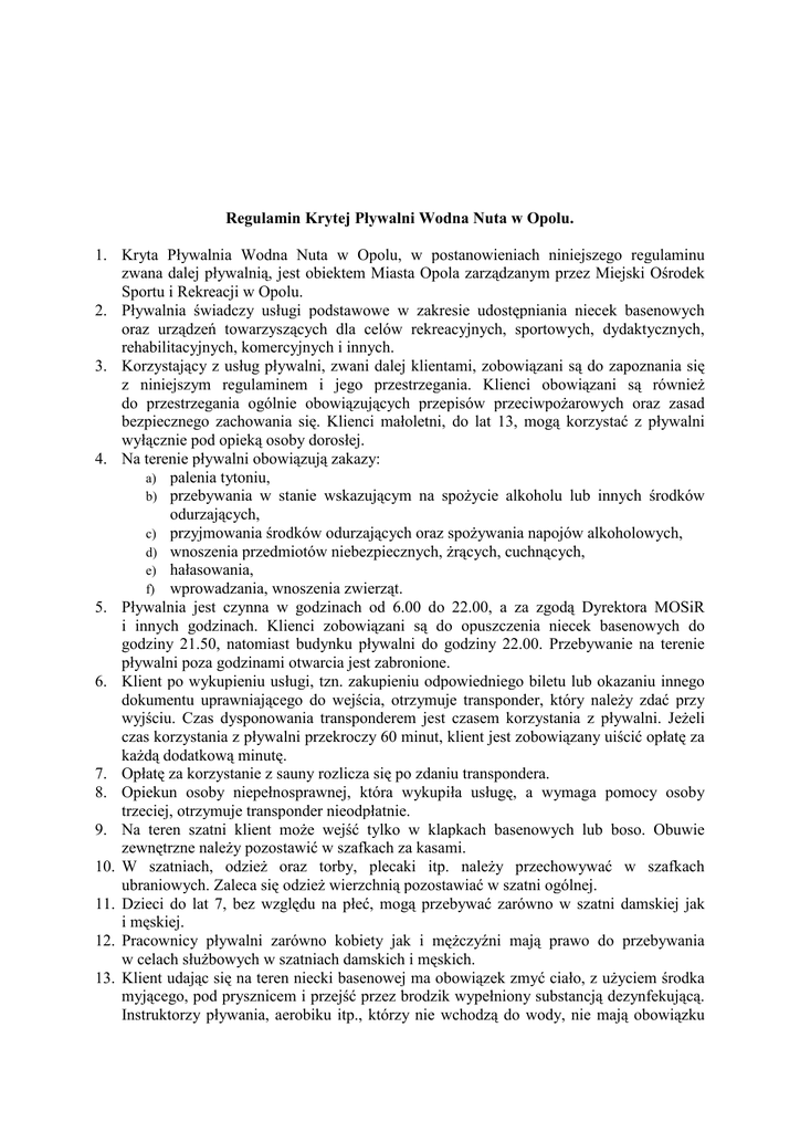 Regulamin Krytej Pływalni Wodna Nuta w Opolu. 1. Kryta Pływalnia Wodna Nuta w Opolu, w postanowieniach niniejszego regulaminu zwana dalej pływalnią, jest obiektem Miasta Opola zarządzanym przez Miejski Ośrodek Sportu i Rekreacji w Opolu. 2. Pływalnia świadczy usługi podstawowe w zakresie udostępniania niecek basenowych oraz urządzeń towarzyszących dla celów rekreacyjnych, sportowych, dydaktycznych, rehabilitacyjnych, komercyjnych i innych. 3. Korzystający z usług pływalni, zwani dalej klientami, zobowiązani są do zapoznania się z niniejszym regulaminem i jego przestrzegania. Klienci obowiązani są również do przestrzegania ogólnie obowiązujących przepisów przeciwpożarowych oraz zasad bezpiecznego zachowania się. Klienci małoletni, do lat 13, mogą korzystać z pływalni wyłącznie pod opieką osoby dorosłej. 4. Na terenie pływalni obowiązują zakazy: a) palenia tytoniu, b) przebywania w stanie wskazującym na spożycie alkoholu lub innych środków odurzających, c) przyjmowania środków odurzających oraz spożywania napojów alkoholowych, d) wnoszenia przedmiotów niebezpiecznych, żrących, cuchnących, e) hałasowania, f) wprowadzania, wnoszenia zwierząt. 5. Pływalnia jest czynna w godzinach od 6.00 do 22.00, a za zgodą Dyrektora MOSiR i innych godzinach. Klienci zobowiązani są do opuszczenia niecek basenowych do godziny 21.50, natomiast budynku pływalni do godziny 22.00. Przebywanie na terenie pływalni poza godzinami otwarcia jest zabronione. 6. Klient po wykupieniu usługi, tzn. zakupieniu odpowiedniego biletu lub okazaniu innego dokumentu uprawniającego do wejścia, otrzymuje transponder, który należy zdać przy wyjściu. Czas dysponowania transponderem jest czasem korzystania z pływalni. Jeżeli czas korzystania z pływalni przekroczy 60 minut, klient jest zobowiązany uiścić opłatę za każdą dodatkową minutę. 7. Opłatę za korzystanie z sauny rozlicza się po zdaniu transpondera. 8. Opiekun osoby niepełnosprawnej, która wykupiła usługę, a wymaga pomocy osoby trzeciej, otrzymuje transponder nieodpłatnie. 9. Na teren szatni klient może wejść tylko w klapkach basenowych lub boso. Obuwie zewnętrzne należy pozostawić w szafkach za kasami. 10. W szatniach, odzież oraz torby, plecaki itp. należy przechowywać w szafkach ubraniowych. Zaleca się odzież wierzchnią pozostawiać w szatni ogólnej. 11. Dzieci do lat 7, bez względu na płeć, mogą przebywać zarówno w szatni damskiej jak i męskiej. 12. Pracownicy pływalni zarówno kobiety jak i mężczyźni mają prawo do przebywania w celach służbowych w szatniach damskich i męskich. 13. Klient udając się na teren niecki basenowej ma obowiązek zmyć ciało, z użyciem środka myjącego, pod prysznicem i przejść przez brodzik wypełniony substancją dezynfekującą. Instruktorzy pływania, aerobiku itp., którzy nie wchodzą do wody, nie mają obowiązku 14. 15. 16. 17. 18. 19. 20. 21. 22. 23. 24. 25. 26. 27. 28. zmywania ciała pod prysznicem. Mogą przebywać na plaży basenowej w szortach i koszulkach, w klapkach lub boso oraz w innym obuwiu za zgodą zarządzającego obiektem. Na obszarze niecki basenowej obowiązuje noszenie czystego stroju kąpielowego przylegającego do ciała, nie posiadającego elementów zagrażających bezpieczeństwu użytkowników. Osoby niekontrolujące potrzeb fizjologicznych mogą przebywać w niecce tylko w szczelnych pieluchomajtkach. Tor niecki basenowej zarezerwowany (wykupiony na wyłączność) oznacza się tablicą informacyjną o wymiarach maksymalnych: 70,00 x 50,00 cm z napisem: „Tor zarezerwowany”. Grupy zorganizowane odbywają swoje zajęcia na pływalni w oparciu o Regulamin korzystania z Krytej Pływalni Wodna Nuta przez grupy zorganizowane. Zasady korzystania z wanny do hydromasażu, basenu solankowego, wyciągu dla niepełnosprawnych i saun określają odrębne instrukcje. Korzystanie z niecek pływalni może odbywać się tylko w obecności ratownika. Ratownicy sprawują nadzór nad przestrzeganiem niniejszego regulaminu w zakresie korzystania z niecek basenowych i w tym zakresie są upoważnieni do jego interpretacji. Ratownicy mają obowiązek wezwać osoby naruszające przepisy niniejszego regulaminu do natychmiastowego opuszczenia niecki basenowej. W przypadku niepodporządkowania się wezwaniu, ratownicy zawiadamiają Policję z prośbą o podjęcie interwencji. Osoby opuszczające w tym trybie pływalnię nie mają prawa do zwrotu wniesionej opłaty. Na wezwanie ratownika, bez względu na okoliczności, klienci obowiązani są niezwłocznie opuścić niecki basenowe oraz urządzenia towarzyszące. Klient, który źle się poczuł, zranił się, doznał kontuzji, uczestniczył w kolizji z innym użytkownikiem itp. ma obowiązek zgłosić ten fakt ratownikowi. Ratownicy dysponują apteczkami wyposażonymi zgodnie z obowiązującymi przepisami. Leki znajdujące się w apteczce mogą zostać udostępnione jedynie osobie dorosłej na wyraźne jej żądanie. Imię i nazwisko osoby pobierającej lek winno być wpisane do Dziennika pracy ratowników. Pracę ratowników nadzoruje bezpośrednio Kierownik Placówki Specjalistycznej. Temperatura wody w nieckach nie powinna być niższa niż 26 st. C. Osoby korzystające z niecek basenowych i urządzeń towarzyszących nie mogą powodować sytuacji zagrażających bezpieczeństwu osób tam przebywających, a w szczególności zabrania się: a) przebywania osób o nieodpowiednim stanie higienicznym, b) przebywania osób z chorobowymi zmianami skóry, nie zabliźnionymi ranami, w tym opatrzonymi, c) w stanie zdrowia nieodpowiednim dla panujących warunków, d) biegania po plaży basenowej i po schodach, e) skakania do wody bez asekuracji i nadzoru instruktora, f) nurkowania bez asekuracji i nadzoru instruktora, g) pływania w poprzek wyznaczonych torów. W trakcie pływania na torze obowiązuje ruch prawostronny, h) wnoszenia i spożywania produktów żywnościowych