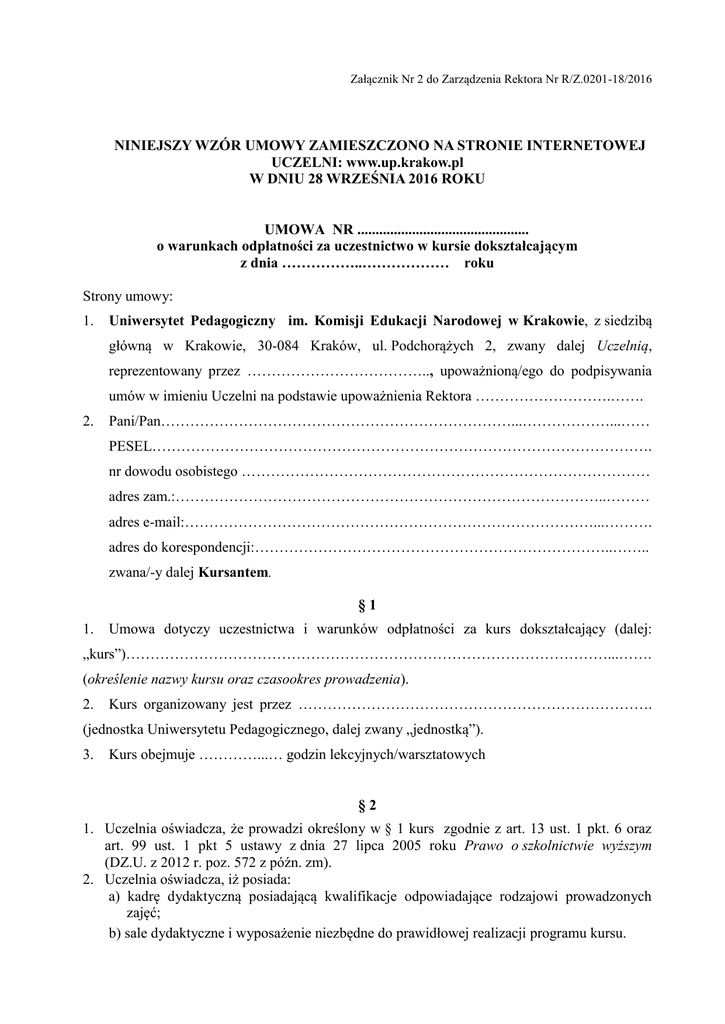 Załącznik Nr 2 do Zarządzenia Rektora Nr R/Z.0201-18/2016 NINIEJSZY WZÓR UMOWY ZAMIESZCZONO NA STRONIE INTERNETOWEJ UCZELNI: www.up.krakow.pl W DNIU 28 WRZEŚNIA 2016 ROKU UMOWA NR ............................................... o warunkach odpłatności za uczestnictwo w kursie dokształcającym z dnia ……………..……………… roku Strony umowy: 1. Uniwersytet Pedagogiczny im. Komisji Edukacji Narodowej w Krakowie, z siedzibą główną w Krakowie, 30-084 Kraków, ul. Podchorążych 2, zwany dalej Uczelnią, reprezentowany przez ……………………………….., upoważnioną/ego do podpisywania umów w imieniu Uczelni na podstawie upoważnienia Rektora ……………………….……. 2. Pani/Pan………………………………………………………………...………………...…… PESEL…………………………………………………………………………………………. nr dowodu osobistego ………………………………………………………………………… adres zam.:……………………………………………………………………………..……… adres e-mail:…………………………………………………………………………...………. adres do korespondencji:………………………………………………………………..…….. zwana/-y dalej Kursantem. §1 1. Umowa dotyczy uczestnictwa i warunków odpłatności za kurs dokształcający (dalej: „kurs”)………………………………………………………………………………………...……. (określenie nazwy kursu oraz czasookres prowadzenia). 2. Kurs organizowany jest przez ………………………………………………………………. (jednostka Uniwersytetu Pedagogicznego, dalej zwany „jednostką”). 3. Kurs obejmuje …………...… godzin lekcyjnych/warsztatowych §2 1. Uczelnia oświadcza, że prowadzi określony w § 1 kurs zgodnie z art. 13 ust. 1 pkt. 6 oraz art. 99 ust. 1 pkt 5 ustawy z dnia 27 lipca 2005 roku Prawo o szkolnictwie wyższym (DZ.U. z 2012 r. poz. 572 z późn. zm). 2. Uczelnia oświadcza, iż posiada: a) kadrę dydaktyczną posiadającą kwalifikacje odpowiadające rodzajowi prowadzonych zajęć; b) sale dydaktyczne i wyposażenie niezbędne do prawidłowej realizacji programu kursu. §3 1. Do podstawowych obowiązków uczestnika kursu należy: a) uczestnictwo w zajęciach dydaktycznych; b) uzyskiwanie wymaganych zaliczeń i złożenia egzaminów (jeśli zakłada je program kursu); c) przestrzeganie obowiązującego w Uczelni Statutu oraz innych wewnętrznych aktów prawnych dotyczących dydaktyki. 2. Kursant zobowiązuje się do dokonania opłaty za naukę na konto bankowe wskazane przez Uczelnię w wysokości……………………………… brutto. 3. Regulowanie odpłatności za naukę następuje w ustalonym przez jednostkę terminie, który podany jest do wiadomości Kursanta na wskazany przez Niego adres e-mail. Decyzją jednostki opłata może być rozłożona na raty. 4. Od nieterminowo wnoszonych wpłat mogą być naliczane odsetki za zwłokę w wysokości odsetek ustawowych. 5. Kursant oświadcza, że przed podpisaniem niniejszej umowy zapoznał się z jej treścią oraz zapoznał się z terminami i wysokością należnej opłaty, nie wnosi z tego tytułu żadnych zastrzeżeń, a same postanowienia umowne są dla Niego zrozumiałe. 6. W przypadku nieterminowej zapłaty przez Kursanta opłaty za kurs w terminie wskazanym w ust. 3 niniejszego paragrafu, Kursant może zostać skreślony z listy uczestników kursu, zgodnie z § 4 ust. 2 Umowy. §4 1.Umowa zostaje rozwiązana w przypadku: a) ukończenia kursu przez Kursanta; b) złożenia przez Kursanta rezygnacji z Kursu w formie pisemnej pod rygorem braku skutków prawnych; w przypadku złożenia przez Kursanta pisemnej rezygnacji z Kursu, zobowiązany jest On ponosić pełne koszty kształcenia określone Umową za okres obowiązywania Umowy. 2. Uczelnia może rozwiązać Umowę z zachowaniem jednomiesięcznego okresu wypowiedzenia, w przypadku, gdy Kursant nienależycie wykonuje Umowę, w szczególności opóźnia się w zapłacie opłaty, o której mowa w § 3 ust. 2 (w całości lub w części, także w zakresie raty, jeśli płatność została rozłożona na raty) o jeden miesiąc. Do czasu upływu okresu wypowiedzenia, Kursant zobowiązuje się ponosić pełne koszty kształcenia określone Umową za okres obowiązywania Umowy oraz ewentualne koszty poniesione przez Uczelnię związane z przygotowaniem materiałów dydaktycznych. §5 W sprawach nie uregulowanych niniejszą umową mają zastosowanie przepisy kodeksu cywilnego oraz ustawy- Prawo o szkolnictwie wyższym. Wszelkie spory wynikające z umowy podlegają rozstrzygnięciu przez sąd właściwy dla siedziby Uczelni. §6 Umowę sporządzono w dwóch jednobrzmiących egzemplarzach, po jednym dla każdej ze Stron. Uczelnia Kursant ................................................................... ...................................................................