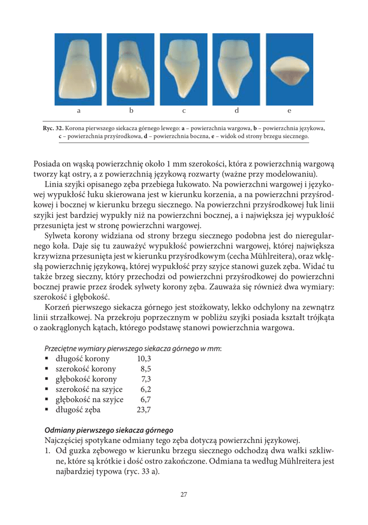 a b c d e Ryc. 32. Korona pierwszego siekacza górnego lewego: a – powierzchnia wargowa, b – powierzchnia językowa, c – powierzchnia przyśrodkowa, d – powierzchnia boczna, e – widok od strony brzegu siecznego. Posiada on wąską powierzchnię około 1 mm szerokości, która z powierzchnią wargową tworzy kąt ostry, a z powierzchnią językową rozwarty (ważne przy modelowaniu). Linia szyjki opisanego zęba przebiega łukowato. Na powierzchni wargowej i językowej wypukłość łuku skierowana jest w kierunku korzenia, a na powierzchni przyśrodkowej i bocznej w kierunku brzegu siecznego. Na powierzchni przyśrodkowej łuk linii szyjki jest bardziej wypukły niż na powierzchni bocznej, a i największa jej wypukłość przesunięta jest w stronę powierzchni wargowej. Sylweta korony widziana od strony brzegu siecznego podobna jest do nieregularnego koła. Daje się tu zauważyć wypukłość powierzchni wargowej, której największa krzywizna przesunięta jest w kierunku przyśrodkowym (cecha Mühlreitera), oraz wklęsłą powierzchnię językową, której wypukłość przy szyjce stanowi guzek zęba. Widać tu także brzeg sieczny, który przechodzi od powierzchni przyśrodkowej do powierzchni bocznej prawie przez środek sylwety korony zęba. Zauważa się również dwa wymiary: szerokość i głębokość. Korzeń pierwszego siekacza górnego jest stożkowaty, lekko odchylony na zewnątrz linii strzałkowej. Na przekroju poprzecznym w pobliżu szyjki posiada kształt trójkąta o zaokrąglonych kątach, którego podstawę stanowi powierzchnia wargowa. Przeciętne wymiary pierwszego siekacza górnego w mm: długość korony szerokość korony głębokość korony szerokość na szyjce głębokość na szyjce długość zęba 10,3 8,5 7,3 6,2 6,7 23,7 Odmiany pierwszego siekacza górnego Najczęściej spotykane odmiany tego zęba dotyczą powierzchni językowej. 1. Od guzka zębowego w kierunku brzegu siecznego odchodzą dwa wałki szkliwne, które są krótkie i dość ostro zakończone. Odmiana ta według Mühlreitera jest najbardziej typowa (ryc. 33 a). 27 Ryc. 33. Odmiany powierzchni językowej pierwszego siekacza górnego (wg Mühlreitera). 2. Odmiana druga jest podobna do poprzedniej, z tą różnicą, że wałki są wyraźniej zaznaczone i bardziej tępo zakończone (ryc. 33 b). 3. Również ta odmiana jest podobna do dwóch poprzednich, przy czym bruzda oddzielająca dwa wałki szkliwne jest wyraźniej zaznaczona i biegnie w kierunku szyjki zęba, choć do niej nie dochodzi (ryc. 33 c). 4. Wałki szkliwne zlane są z listwami brzeżnymi, które dzięki temu są wyraźnie zaznaczone. Guzek zębowy językowy przedzielony jest bruzdą podłużną, która nie dochodzi do szyjki zęba (ryc. 33 d). 5. W odmianie tej występują niesymetrycznie ułożone dwa wałki różnej wielkości. Wałek większy znajduje się w środku powierzchni językowej, natomiast wałek mniejszy jest przesunięty w kierunku listwy bocznej (ryc. 33 e). 6. Zauważa się tu rozwinięcie poprzedniej odmiany. Boczna odnoga ginie, a wałek centralny staje się przez to szerszy. Jest on oddzielony od listew brzeżnych dwiema płytkimi bruzdami (ryc. 33 f). 7. Odmianę tę charakteryzują trzy, a nawet więcej wałków znajdujących się na powierzchni językowej. Odmiana ta jest rzadko spotykana (ryc. 33 g). Technika modelowania pierwszego siekacza górnego Etap I. Przystępując do modelowania korony pierwszego siekacza górnego, trzeba w przybliżeniu zaznaczyć na przygotowanej bryle woskowej proporcje pomiędzy szerokością – 1, głębokością – 0,8 i długością – 1,2. Naznaczony nadmiar materiału, w którym modelowany jest ząb, ścina się nożem do gipsu tak, aby otrzymać blok o pożądanych wymiarach (ryc. 34 b). Etap II. Na węższej ścianie bloku rysuje się boczne zarysy korony zęba (ryc. 35 a). Ważne jest tu uwzględnienie osi zęba. Nadmiar materiału ścina się również nożem do gipsu (ryc. 40). Otrzymany blok w dalszym ciągu zachowuje od strony wargowej i językowej kształt prostokąta. Te prostokątne powierzchnie są już lekko pochylone w kierunku osi zęba. Etap III. Na opisywanej prostokątnej i pochyłej powierzchni, która jest powierzchnią wargową, rysuje się licowy zarys korony zęba (ryc. 36 a). Jak wiadomo, korona zwęża się od brzegu siecznego w kierunku szyjki anatomicznej zęba, a brzeg sieczny tworzy różne kąty z powierzchniami stycznymi. W związku z tym występuje konieczność ścięcia nożem do gipsu zaznaczonej części wosku (ryc. 41). Przejścia pomiędzy poszczególnymi powierzchniami zęba modelowanego oraz wszelkie szczegóły korony modelowane są w następnych etapach. 28 Ryc. 34. Ryc. 35. Ryc. 36. Ryc. 34. Emw etap I: a – emw z częściami zaznaczonymi do odcięcia, b – emw po ścięciu zaznaczonych części (emw – etapowy model wzorcowy). Ryc. 35. Emw etap II: a – emw z częściami zaznaczonymi do odcięcia, b – emw po ścięciu zaznaczonych części. Ryc. 36. Emw etap III: a – emw z częściami zaznaczonymi do odcięcia, b – emw po ścięciu zaznaczonych części. Etap IV. Wykonując te czynności, należy ściąć krawędzie tak, aby utworzyć łagodne przejścia między poszczególnymi powierzchniami zęba (ryc. 42). Na powierzchni wargowej od strony bocznej ścina się więcej niż od strony przyśrodkowej. W ten sposób wyłania się krzywizna korony. Kształt powierzchni językowej powinien być zbliżony do trójkąta, którego podstawą Ryc. 37. Emw etap IV: a – emw z częściami zaznaczonymi do odcięcia, b – emw po ścięciu zaznaczonych części. 29