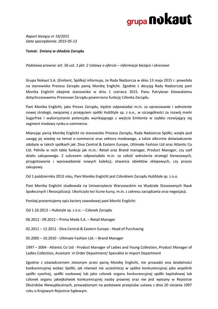 Raport bieżący nr 19/2015 Data sporządzenia: 2015-05-13 Temat: Zmiany w składzie Zarządu Podstawa prawna: art. 56 ust. 1 pkt. 2 Ustawy o ofercie – informacje bieżące i okresowe Grupa Nokaut S.A. (Emitent, Spółka) informuje, że Rada Nadzorcza w dniu 13 maja 2015 r. powołała na stanowisko Prezesa Zarządu panią Monikę Englicht. Zgodnie z decyzją Rady Nadzorczej pani Monika Englicht obejmie stanowisko w dniu 1 czerwca 2015. Panu Patrykowi Kitowskiemu dotychczasowemu Prezesowi Zarządu powierzono funkcję Członka Zarządu. Pani Monika Englicht, jako Prezes Zarządu, będzie odpowiadać m.in. za opracowanie i wdrożenie nowej strategii, związanej z przejęciem spółki HubStyle sp. z o.o., w szczególności za rozwój marki Sugarfree i wykorzystanie potencjału wynikającego z wejścia Emitenta w szybko rozwijający się segment modowy rynku e-commerce. Mianując panią Monikę Englicht na stanowisko Prezesa Zarządu, Rada Nadzorcza Spółki, wzięła pod uwagę jej wiedzę na temat e-commerce oraz sektora modowego, a także olbrzmie doświadczenie zdobyte w takich spółkach jak: Diva Central & Eastern Europe, Ultimate Fashion Ltd oraz Atlantic Co Ltd. Pełniła w nich takie funkcje jak m.in.: Retail oraz Brand manager, Product Manager, czy szef działu zakupowego. Z sukcesem odpowiadała m.in. za całość wdrożenia strategii biznesowych, przygotowanie i wprowadzenie nowych kolekcji, otwarcia obiektów sklepowych, czy proces zakupowy. Od 1 października 2013 roku, Pani Monika Englicht jest Członkiem Zarządu HubStyle sp. z o.o. Pani Monika Englicht studiowała na Uniwersytecie Warszawskim na Wydziale Stosowanych Nauk Społecznych i Resocjalizacji. Ukończyła też liczne kursy, m.in. z zakresu zarządzania oraz negocjacji. Poniżej prezentujemy opis kariery zawodowej pani Moniki Englicht: Od 1.10.2013 – Hubstyle sp. z o.o. – Członek Zarządu 06.2012 - 09.2012 – Prima Moda S.A. – Retail Manager 02.2011 – 12.2011 - Diva Central & Eastern Europe - Head of Purchasing 05.2005 – 10.2010 - Ultimate Fashion Ltd. – Brand Manager 1997 – 2004 - Atlantic Co Ltd - Product Manager of Ladies and Young Collection, Product Manager of Ladies Collection, Assistant in Order Department/ Specialist in Import Department Zgodnie z oświadczeniem złożonym przez panią Monikę Englicht, nie prowadzi ona działalności konkurencyjnej wobec Spółki, jak również nie uczestniczy w spółce konkurencyjnej jako wspólnik spółki cywilnej, spółki osobowej lub jako członek organu konkurencyjnej spółki kapitałowej lub członek organu jakiejkolwiek konkurencyjnej osoby prawnej oraz nie jest wpisany w Rejestrze Dłużników Niewypłacalnych, prowadzonym na podstawie przepisów ustawy z dnia 20 sierpnia 1997 roku o Krajowym Rejestrze Sądowym. Podstawa prawna: § 5 ust 1 pkt. 22 i § 28 Rozporządzenia Ministra Finansów z dnia 19 lutego 2009 r. w sprawie informacji bieżących i okresowych przekazywanych przez emitentów papierów wartościowych oraz warunków uznawania za równoważne informacji wymaganych przepisami prawa państwa niebędącego państwem członkowskim
