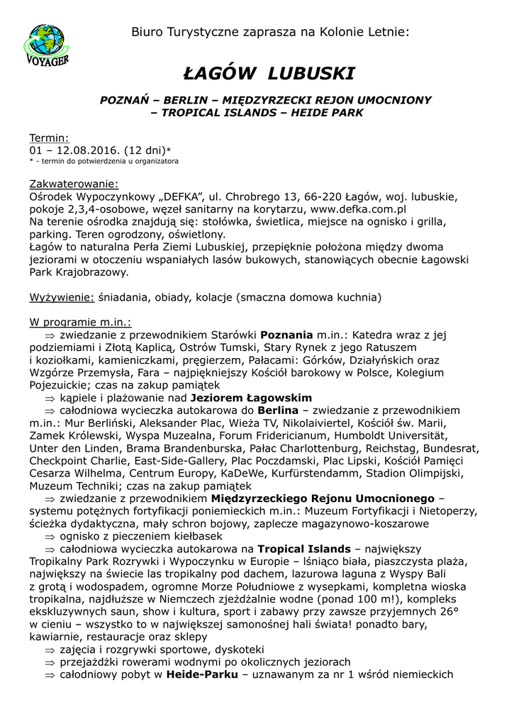 Biuro Turystyczne zaprasza na Kolonie Letnie: ŁAGÓW LUBUSKI POZNAŃ – BERLIN – MIĘDZYRZECKI REJON UMOCNIONY – TROPICAL ISLANDS – HEIDE PARK Termin: 01 – 12.08.2016. (12 dni)* * - termin do potwierdzenia u organizatora Zakwaterowanie: Ośrodek Wypoczynkowy „DEFKA”, ul. Chrobrego 13, 66-220 Łagów, woj. lubuskie, pokoje 2,3,4-osobowe, węzeł sanitarny na korytarzu, www.defka.com.pl Na terenie ośrodka znajdują się: stołówka, świetlica, miejsce na ognisko i grilla, parking. Teren ogrodzony, oświetlony. Łagów to naturalna Perła Ziemi Lubuskiej, przepięknie położona między dwoma jeziorami w otoczeniu wspaniałych lasów bukowych, stanowiących obecnie Łagowski Park Krajobrazowy. Wyżywienie: śniadania, obiady, kolacje (smaczna domowa kuchnia) W programie m.in.: ⇒ zwiedzanie z przewodnikiem Starówki Poznania m.in.: Katedra wraz z jej podziemiami i Złotą Kaplicą, Ostrów Tumski, Stary Rynek z jego Ratuszem i koziołkami, kamieniczkami, pręgierzem, Pałacami: Górków, Działyńskich oraz Wzgórze Przemysła, Fara – najpiękniejszy Kościół barokowy w Polsce, Kolegium Pojezuickie; czas na zakup pamiątek ⇒ kąpiele i plażowanie nad Jeziorem Łagowskim ⇒ całodniowa wycieczka autokarowa do Berlina – zwiedzanie z przewodnikiem m.in.: Mur Berliński, Aleksander Plac, Wieża TV, Nikolaiviertel, Kościół św. Marii, Zamek Królewski, Wyspa Muzealna, Forum Fridericianum, Humboldt Universität, Unter den Linden, Brama Brandenburska, Pałac Charlottenburg, Reichstag, Bundesrat, Checkpoint Charlie, East-Side-Gallery, Plac Poczdamski, Plac Lipski, Kościół Pamięci Cesarza Wilhelma, Centrum Europy, KaDeWe, Kurfürstendamm, Stadion Olimpijski, Muzeum Techniki; czas na zakup pamiątek ⇒ zwiedzanie z przewodnikiem Międzyrzeckiego Rejonu Umocnionego – systemu potężnych fortyfikacji poniemieckich m.in.: Muzeum Fortyfikacji i Nietoperzy, ścieżka dydaktyczna, mały schron bojowy, zaplecze magazynowo-koszarowe ⇒ ognisko z pieczeniem kiełbasek ⇒ całodniowa wycieczka autokarowa na Tropical Islands – największy Tropikalny Park Rozrywki i Wypoczynku w Europie – lśniąco biała, piaszczysta plaża, największy na świecie las tropikalny pod dachem, lazurowa laguna z Wyspy Bali z grotą i wodospadem, ogromne Morze Południowe z wysepkami, kompletna wioska tropikalna, najdłuższe w Niemczech zjeżdżalnie wodne (ponad 100 m!), kompleks ekskluzywnych saun, show i kultura, sport i zabawy przy zawsze przyjemnych 26° w cieniu – wszystko to w największej samonośnej hali świata! ponadto bary, kawiarnie, restauracje oraz sklepy ⇒ zajęcia i rozgrywki sportowe, dyskoteki ⇒ przejażdżki rowerami wodnymi po okolicznych jeziorach ⇒ całodniowy pobyt w Heide-Parku – uznawanym za nr 1 wśród niemieckich Parków Rozrywki, na powierzchni ponad 850.000 m² czekają liczne atrakcje m.in.: szwajcarski tor bobslejowy, zjeżdżalnie, łodzie i tratwy, kolejki górskie, kraina piratów, różnego typu rolby, karuzele obrotowo-młynowe, kolejki ziemne i powietrzne, wieże widokowe, huśtawki i wiele innych atrakcji, „Colossos” – największa na świecie drewniana kolejka górska, „Scream” – najwyższy na świecie Gyro-Drop-Tower (71m), pierwsza w Niemczech kolejka górska startująca z katapulty ⇒ konkursy i turnieje z nagrodami Koszt: 1590,00 zł/os. (przy zgłoszeniu i wpłacie zaliczki do 10 marca) 1790,00 zł/os. (po 10 marca) UWAGA: Cena zawiera: transport, noclegi, wyżywienie, wszystkie bilety wstępu, opiekę wychowawczą, ubezpieczenie, opłaty za przewodników, opłaty autostradowe, drogowe i parkingowe Uczestnik nie ponosi żadnych dodatkowych kosztów! Informacje dodatkowe: 1. BT „VOYAGER” zobowiązuje się do zabezpieczenia wszystkich świadczeń ujętych w przedstawionym programie wyjazdu. 2. Cena skierowania zawiera bilety wstępu do zwiedzanych obiektów ujętych w programie. 3. Organizator dysponuje własnymi środkami finansowymi, które zabezpieczają nieplanowane wydatki wynikłe z nieprzewidzianych zdarzeń podczas realizacji imprezy. 4. Biuro ubezpiecza uczestników wyjazdu od następstw nieszczęśliwych wypadków (NNW) na kwotę 2000,00 euro i kosztów leczenia (KL) zagranicą na kwotę 10000,00 euro oraz bagaż podróżny na kwotę 200,00 euro w TUiR AXA S.A. 5. Organizator zobowiązuje się do uzyskania wpisu do ewidencji kuratoryjnych placówek wypoczynku, na 14 dni przed rozpoczęciem wypoczynku. 6. Na placówce opiekę sprawować będzie wykwalifikowana kadra pedagogiczna (1 opiekun na 15 uczestników) oraz kierownik. 7. Organizator zapewnia transport autokarem klasy turystycznej wyposażonym w klimatyzację, regulowane fotele oraz DVD. 8. Rezerwacja miejsca następuje po podpisaniu umowy i wpłacie zaliczki w wys. 400,00 zł/os. Ilość miejsc ograniczona, decyduje kolejność zgłoszeń. 9. Wychodząc naprzeciw oczekiwaniom Rodziców proponujemy rozłożenie odpłatności na raty. Jednocześnie informujemy, że wystawiamy wnioski o dofinansowanie do zakładów pracy oraz faktury vat. 10. Biuro zastrzega sobie prawo do odwołania wyjazdu z powodu zbyt małej ilości uczestników. Zgłoszenia: Biuro Turystyczne „VOYAGER”, ul. Kosynierów Kościuszkowskich 11, 87-100 Toruń tel. 56 645 50 40 ; tel. kom.: 0603 628 785; fax 56 621 97 91, www.voyagertorun.pl; e-mail: [email protected], facebook.com/VoyagerTorun Odpłatność: Wpłat można dokonać bezpośrednio w siedzibie organizatora lub przelewem na konto: PKO BANK POLSKI S.A., ODDZIAŁ GRUDZIĄDZ 39 1020 5040 0000 6102 0143 5692 Podając na przelewie imię i nazwisko dziecka oraz nazwę i termin imprezy. Pełną odpłatność za kolonię należy uiścić do dnia 24.06.2016r.