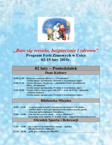 „Baw się wesoło, bezpiecznie i zdrowo” Program Ferii Zimowych w Ustce 02-15 luty 2015r. 02 luty – Poniedziałek Dom Kultury 10.00-11.30 12.00-13.30 14.00-18.00 Klasyczne animacje Disney’a – „Pocahontas” Liczba miejsc ograniczona. Prosimy o wcześniejsze zapisy. Feryjny Konkurs Plastyczny – „Indiański Świat” na podstawie filmu „Pocahontas” Liczba miejsc ograniczona. Prosimy o wcześniejsze zapisy. Feryjne Mistrzostwa w grze Fifa 2014 – wiek 10-19 lat – Bałtyckie Centrum Kultury Liczba miejsc ograniczona. Prosimy o wcześniejsze zapisy. Biblioteka Miejska 10.00 – 16.00 12.00 – 14.00 - wypożyczamy książki i czasopisma na miejscu i do domu, - bardzo duży wybór gier planszowych, edukacyjnych, puzzli, - Internet ogólnodostępny i bezpłatny. „Gdy nie ma dzieci w domu ... to są w Bibliotece” zaczynamy ferie zimowe W Krainie Lodu – zajęcia literacko-plastyczne. Ośrodek Sportu i Rekreacji 11.30 – 14.00 11:30 – 16:00 gry i zabawy na lodowisku i śniegu – ognisko BRAK ŚNIEGU i MROZU: grill, gry i zabawy na ORLIKU Miejski Klub Sportowy „Jantar” 10.00 – 12.00 zajęcia sportowo-piłkarskie dla dzieci z roczników 2001, 2002, 2003. Hala Sportowa Szkoły Podstawowej Nr 2. Trenerzy prowadzący Edmund Raniszewski, Piotr Maksyśko 12.00 – 14.00 zajęcia sportowo-piłkarskie dla dzieci z roczników 2007, 2008, Przedszkolaki. Hala Sportowa Szkoły Podstawowej Nr 2. Trener prowadzący Piotr Cejrowski. Zajęcia w formule otwartej. Bałtycka Galeria Sztuki Współczesnej Centrum Aktywności Twórczej 10.00 – 12.00 Warsztaty fotograficzne dla młodzieży. Obowiązują zapisy do dnia 30 stycznia ze względu na ograniczoną ilość miejsc. 03 luty – Wtorek Dom Kultury 10.00-12.00 12.00-13.30 16.00-17.00 17.30-20.00 Indiańska Wioska - cykl zajęć plastyczno - animacyjnych dla dzieci ze szkół podstawowych – „Budujemy wigwamy” Prosimy o wcześniejsze zapisy. „Sprawni jak Indianie” – zdobywanie sprawności, gry zabawy animacyjne Prosimy o wcześniejsze zapisy. Zajęcia plastyczne dla dzieci (5-8 lat) - Bałtyckie Centrum Kultury Liczba miejsc ograniczona. Prosimy o wcześniejsze zapisy. Feryjny Klub Filmowy – propozycja dla młodzieży i dorosłych - Bałtyckie Centrum Kultury Biblioteka Miejska 11.00 – 18.00 12.00 – 14.00 - wypożyczamy książki i czasopisma na miejscu i do domu, - bardzo duży wybór gier planszowych, edukacyjnych, puzzli, - Internet ogólnodostępny i bezpłatny. PING-PONG mieszkają stwory kolorowe i każdy z nich wygląda zupełniej inaczej... Jak? To zależy od Twojej fantazji!!! - zajęcia plastyczne. Ośrodek Sportu i Rekreacji 11:30 – 16:00 BRAK ŚNIEGU i MROZU: grill, gry i zabawy na ORLIKU Miejski Klub Sportowy „Jantar” 10.00 – 12.00 zajęcia sportowo-piłkarskie dla dzieci z roczników 2001, 2002, 2003. Hala Sportowa Szkoły Podstawowej Nr 2. Trenerzy prowadzący Edmund Raniszewski, Piotr Maksyśko 12.00 – 14.00 zajęcia sportowo-piłkarskie dla dzieci z roczników 2007, 2008, Przedszkolaki. Hala Sportowa Szkoły Podstawowej Nr 2. Trener prowadzący Piotr Cejrowski. Zajęcia w formule otwartej. Bałtycka Galeria Sztuki Współczesnej Centrum Aktywności Twórczej 10.00 – 12.00 Warsztaty fotograficzne dla młodzieży. Obowiązują zapisy do dnia 30 stycznia ze względu na ograniczoną ilość miejsc. 04 luty – Środa Dom Kultury 10.00-12.00 12.00-13.30 14.00-18.00 Indiańska Wioska - cykl zajęć plastyczno - animacyjnych dla dzieci ze szkół podstawowych – „Tworzymy stroje” Prosimy o wcześniejsze zapisy. Mistrzowie origami – magiczne formy z papieru – dzieci szkolne Liczba miejsc ograniczona. Prosimy o wcześniejsze zapisy. Feryjne Mistrzostwa w grze Fifa 2014 – wiek 10-19 lat - Bałtyckie Centrum Kultury Liczba miejsc ograniczona. Prosimy o wcześniejsze zapisy Biblioteka Miejska 11.00 – 18.00 12.00 – 14.00 - wypożyczamy książki i czasopisma na miejscu i do domu, - bardzo duży wybór gier planszowych, edukacyjnych, puzzli, - Internet ogólnodostępny i bezpłatny. Szaleństwo Kolekcjonera – dzieci przynoszą to co kolekcjonują np. lalki, samochody, koniki Pony i in. zrobimy chwilową wystawę i coś jeszcze... Ośrodek Sportu i Rekreacji 11.30 – 14.00 wycieczka piesza z ogniskiem „POSZUKIWANIE ŚLADÓW ZIMY” Miejski Klub Sportowy „Jantar” 10.00 – 12.00 zajęcia sportowo-piłkarskie dla dzieci z roczników 2001, 2002, 2003. Hala Sportowa Szkoły Podstawowej Nr 2. Trenerzy prowadzący Edmund Raniszewski, Piotr Maksyśko 12.00 – 14.00 zajęcia sportowo-piłkarskie dla dzieci z roczników 2007, 2008, Przedszkolaki. Hala Sportowa Szkoły Podstawowej Nr 2. Trener prowadzący Piotr Cejrowski. Zajęcia w formule otwartej. Bałtycka Galeria Sztuki Współczesnej Centrum Aktywności Twórczej 10.00 – 12.00 Warsztaty fotograficzne dla młodzieży. Obowiązują zapisy do dnia 30 stycznia ze względu na ograniczoną ilość miejsc. 05 luty – Czwartek Dom Kultury 10.00-11.30 12.00-14.00 14.00-18.00 16.00-17.00 Klasyczne animacje Disney’a – „Alladyn” Liczba miejsc ograniczona. Prosimy o wcześniejsze zapisy. Indiańska Wioska - cykl zajęć plastyczno - animacyjnych dla dzieci ze szkół podstawowych – „Świat dźwięków” Prosimy o wcześniejsze zapisy. Feryjne Mistrzostwa w grze Fifa 2014 – wiek 10-19 lat - Bałtyckie Centrum Kultury Liczba miejsc ograniczona. Prosimy o wcześniejsze zapisy. Zajęcia plastyczne dla dzieci (5-8 lat) - Bałtyckie Centrum Kultury Liczba miejsc ograniczona. Prosimy o wcześniejsze zapisy. Biblioteka Miejska 11.00 – 18.00 14.00 – 17.00 - wypożyczamy książki i czasopisma na miejscu i do domu, - bardzo duży wybór gier planszowych, edukacyjnych, puzzli, - Internet ogólnodostępny i bezpłatny. Warsztaty z robotyki - LEGO – zapraszamy dzieci w wieku od 7 lat do 12 lat, ze względu na ograniczoną liczbę miejsc obowiązują zapisy do 3.02 w Oddziale dla Dzieci i Młodzieży. Ośrodek Sportu i Rekreacj