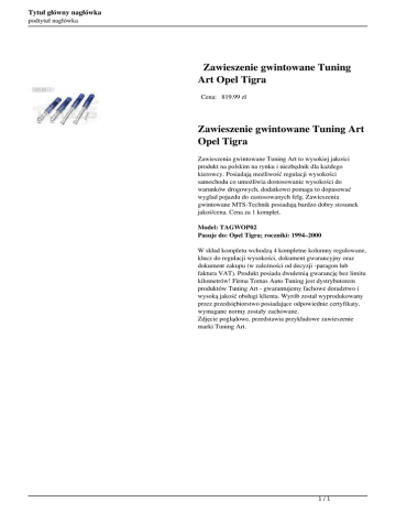 Tytuł główny nagłówka podtytuł nagłówka Zawieszenie gwintowane Tuning Art Opel Tigra Cena: 819.99 zł Zawieszenie gwintowane Tuning Art Opel Tigra Zawieszenia gwintowane Tuning Art to wysokiej jakości produkt na polskim na rynku i niezbędnik dla każdego kierowcy. Posiadają możliwość regulacji wysokości samochodu co umożliwia dostosowanie wysokości do warunków drogowych, dodatkowo pomaga to dopasować wyglad pojazdu do zastosowanych felg. Zawieszenia gwintowane MTS-Technik posiadają bardzo dobry stosunek jakoś/cena. Cena za 1 komplet. Model: TAGWOP02 Pasuje do: Opel Tigra; roczniki: 1994–2000 W skład kompletu wchodzą 4 kompletne kolumny regulowane, klucz do regulacji wysokości, dokument gwarancyjny oraz dokument zakupu (w zależności od decyzji -paragon lub faktura VAT). Produkt posiada dwuletnią gwarancję bez limitu kilometrów! Firma Tomas Auto Tuning jest dystrybutorem produktów Tuning Art - gwarantujemy fachowe doradztwo i wysoką jakość obsługi klienta. Wyrób został wyprodukowany przez przedsiębiorstwo posiadające odpowiednie certyfikaty, wymagane normy zostały zachowane. Zdjęcie poglądowe, przedstawia przykładowe zawieszenie marki Tuning Art. 1/1 Powered by TCPDF (www.tcpdf.org)