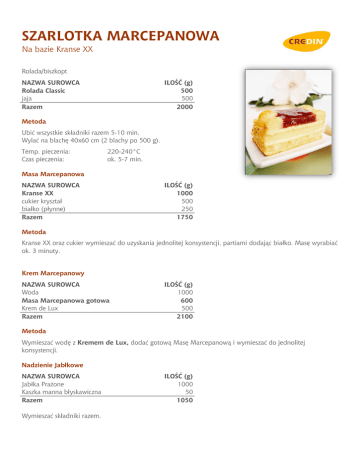 SZARLOTKA MARCEPANOWA Na bazie Kranse XX Rolada/biszkopt NAZWA SUROWCA Rolada Classic jaja Razem ILOŚĆ (g) 500 500 2000 Metoda Ubić wszystkie składniki razem 5-10 min. Wylać na blachę 40x60 cm (2 blachy po 500 g). Temp. pieczenia: Czas pieczenia: 220-240°C ok. 5-7 min. Masa Marcepanowa NAZWA SUROWCA Kranse XX cukier kryształ białko (płynne) Razem ILOŚĆ (g) 1000 500 250 1750 Metoda Kranse XX oraz cukier wymieszać do uzyskania jednolitej konsystencji, partiami dodając białko. Masę wyrabiać ok. 3 minuty. Krem Marcepanowy NAZWA SUROWCA Woda Masa Marcepanowa gotowa Krem de Lux Razem ILOŚĆ (g) 1000 600 500 2100 Metoda Wymieszać wodę z Kremem de Lux, dodać gotową Masę Marcepanową i wymieszać do jednolitej konsystencji. Nadzienie Jabłkowe NAZWA SUROWCA Jabłka Prażone Kaszka manna błyskawiczna Razem Wymieszać składniki razem. ILOŚĆ (g) 1000 50 1050 Metoda: Przestudzone blaty podzielić na 6 równych części wzdłuż dłuższej krawędzi (2 szarlotki). Pierwszą część biszkoptu posmarować cienko warstwą marmolady i wyszprycować Nadzienie Jabłkowe. Przykryć kolejną częścią biszkoptu, na który nakładamy Krem Marcepanowy o grubości podobnej do Nadzienia Jabłkowego. Ostatnią część biszkoptu udekorować Kremem Marcepanowym i dowolnym nadzieniem termostabilnym Credi Fruits! według wzoru. Temp. pieczenia: Czas pieczenia: 180°C ok. 20 min. na podwójnej blaszce Dekoracja: Credigel Instant, płatki migdałowe itp.