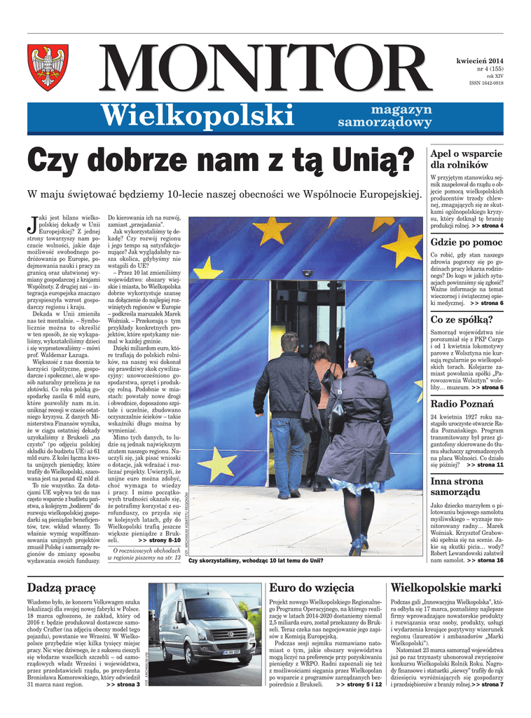 kwiecień 2014 nr 4 (155) rok XIV ISSN 1642-0918 Czy dobrze nam z tą Unią? W maju świętować będziemy 10-lecie naszej obecności we Wspólnocie Europejskiej. Do kierowania ich na rozwój, zamiast „przejadania”. Jak wykorzystaliśmy tę dekadę? Czy rozwój regionu i jego tempo są satysfakcjonujące? Jak wyglądałaby nasza okolica, gdybyśmy nie wstąpili do UE? – Przez 10 lat zmieniliśmy województwo: obszary wiejskie i miasta, bo Wielkopolska dobrze wykorzystuje szansę na dołączenie do najlepiej rozwiniętych regionów w Europie – podkreśla marszałek Marek Woźniak. – Przekonują o tym przykłady konkretnych projektów, które spotykamy niemal w każdej gminie. Dzięki miliardom euro, które trafiają do polskich rolników, na naszej wsi dokonał się prawdziwy skok cywilizacyjny: unowocześniono gospodarstwa, sprzęt i produkcję rolną. Podobnie w miastach: powstały nowe drogi i obwodnice, doposażono szpitale i uczelnie, zbudowano oczyszczalnie ścieków – takie wskaźniki długo można by wymieniać. Mimo tych danych, to ludzie są jednak największym atutem naszego regionu. Nauczyli się, jak pisać wnioski o dotacje, jak wdrażać i rozliczać projekty. Uwierzyli, że unijne euro można zdobyć, choć wymaga to wiedzy i pracy. I mimo początkowych trudności okazało się, że potrafimy korzystać z eurofunduszy, co przyda się w kolejnych latach, gdy do Wielkopolski trafią jeszcze większe pieniądze z Brukseli. >> strony 8-10 O rocznicowych obchodach w regionie piszemy na str. 13 W przyjętym stanowisku sejmik zaapelował do rządu o objęcie pomocą wielkopolskich producentów trzody chlewnej, zmagających się ze skutkami ogólnopolskiego kryzysu, który dotknął tę branżę produkcji rolnej. >> strona 4 Gdzie po pomoc Co robić, gdy stan naszego zdrowia pogorszy się po godzinach pracy lekarza rodzinnego? Do kogo w jakich sytuacjach powinniśmy się zgłosić? Ważne informacje na temat wieczornej i świątecznej opieki medycznej. >> strona 6 Co ze spółką? Samorząd województwa nie porozumiał się z PKP Cargo i od 1 kwietnia lokomotywy parowe z Wolsztyna nie kursują regularnie po wielkopolskich torach. Kolejarze zamiast powołania spółki „Parowozownia Wolsztyn” woleliby… muzeum. >> strona 6 Radio Poznań 24 kwietnia 1927 roku nastąpiło uroczyste otwarcie Radia Poznańskiego. Program transmitowany był przez gigantofony skierowane do tłumu słuchaczy zgromadzonych na placu Wolności. Co działo się później? >> strona 11 Inna strona samorządu FOT. ARCHIWUM KOMITETU REGIONÓW J aki jest bilans wielkopolskiej dekady w Unii Europejskiej? Z jednej strony towarzyszy nam poczucie wolności, jakie daje możliwość swobodnego podróżowania po Europie, podejmowania nauki i pracy za granicą oraz ułatwionej wymiany gospodarczej z krajami Wspólnoty. Z drugiej zaś – integracja europejska znacząco przyspieszyła wzrost gospodarczy regionu i kraju. Dekada w Unii zmieniła nas też mentalnie. – Symbolicznie można to określić w ten sposób, że się wykąpaliśmy, wykształciliśmy dzieci i się wyprostowaliśmy – mówi prof. Waldemar Łazuga. Większość z nas docenia te korzyści (polityczne, gospodarcze i społeczne), ale w sposób naturalny przelicza je na złotówki. Co roku polską gospodarkę zasila 6 mld euro, które pozwoliły nam m.in. uniknąć recesji w czasie ostatniego kryzysu. Z danych Ministerstwa Finansów wynika, że w ciągu ostatniej dekady uzyskaliśmy z Brukseli „na czysto” (po odjęciu polskiej składki do budżetu UE) aż 61 mld euro. Z kolei łączna kwota unijnych pieniędzy, które trafiły do Wielkopolski, szacowana jest na ponad 42 mld zł. To nie wszystko. Za dotacjami UE wpływa też do nas często wsparcie z budżetu państwa, a kolejnym „bodźcem” do rozwoju wielkopolskiej gospodarki są pieniądze beneficjentów, tzw. wkład własny. To właśnie wymóg współfinansowania unijnych projektów zmusił Polskę i samorządy regionów do zmiany sposobu wydawania swoich funduszy. Apel o wsparcie dla rolników Czy skorzystaliśmy, wchodząc 10 lat temu do Unii? Jako dziecko marzyłem o pilotowaniu bojowego samolotu myśliwskiego – wyznaje monitorowany radny… Marek Woźniak. Krzysztof Grabowski spełnia się na scenie. Jakie są skutki picia… wody? Robert Lewandowski załatwił nam samolot. >> storna 16 Euro do wzięcia Wielkopolskie marki Wiadomo było, że koncern Volkswagen szuka lokalizacji dla swojej nowej fabryki w Polsce. 18 marca ogłoszono, że zakład, który od 2016 r. będzie produkował dostawcze samochody Crafter (na zdjęciu obecny model tego pojazdu), powstanie we Wrześni. W Wielkopolsce przybędzie więc kilka tysięcy miejsc pracy. Nic więc dziwnego, że z sukcesu cieszyli się włodarze wszelkich szczebli – od samorządowych władz Wrześni i województwa, przez przedstawicieli rządu, po prezydenta Bronisława Komorowskiego, który odwiedził 31 marca nasz region. >> strona 3 Projekt nowego Wielkopolskiego Regionalnego Programu Operacyjnego, na którego realizację w latach 2014-2020 dostaniemy niemal 2,5 miliarda euro, został przekazany do Brukseli. Teraz czeka nas negocjowanie jego zapisów z Komisją Europejską. Podczas sesji sejmiku rozmawiano natomiast o tym, jakie obszary województwa mogą liczyć na preferencje przy pozyskiwaniu pieniędzy z WRPO. Radni zapoznali się też z możliwościami sięgania przez Wielkopolan po wsparcie z programów zarządzanych bezpośrednio z Brukseli. >> strony 5 i 12 Podczas gali „Innowacyjna Wielkopolska”, która odbyła się 17 marca, poznaliśmy najlepsze firmy wprowadzające nowatorskie produkty i rozwiązania oraz osoby, produkty, usługi i wydarzenia kreujące pozytywny wizerunek regionu (laureatów i ambasadorów „Marki Wielkopolski”). Natomiast 23 marca samorząd województwa już po raz trzynasty uhonorował zwycięzców konkursu Wielkopolski Rolnik Roku. Nagrody finansowe i statuetki „siewcy” trafiły 