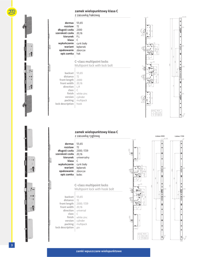 zamek wielopunktowy klasa C z zasuwką hakową dormas rozstaw długość czoła szerokość czoła kierunek klasa wykończenie wariant opakowanie opis zamka 55;65 72 2300 20;16 P;L C cynk biały bębenek zbiorcze hak C-class multipoint locks Multipoint lock with lock bolt backset distance front length front width direction class finish version packing lock description 55;65 72 2300 20;16 L;R C white zinc cylinder multipack hook zamek wielopunktowy klasa C z zasuwką ryglową dormas rozstaw długość czoła szerokość czoła kierunek klasa wykończenie wariant opakowanie opis zamka 55;65 72 2300; 1729 20;16 uniwersalny C cynk biały bębenek zbiorcze bolec C-class multipoint locks Multipoint lock with hook bolt backset distance front length front width direction class finish version packing lock description 55;65 72 2300; 1729 20;16 universal C white zinc cylinder multipack pin 3 zamki wpuszczane wielopunktowe zamek wielopunktowy MULTISTRONG klasa C dormas rozstaw długość czoła szerokość czoła kierunek klasa wykończenie wariant opakowanie opis zamka 65 72 2300 20 uniwersalny C cynk biały bębenek zbiorcze bolec ø12 C-class MULTISTRONG multipoint locks backset distance front length front width direction class finish version packing lock description 65 72 2300 20 universal C white zinc cylinder multipack pin ø12 zamek wielopunktowy MULTISOFT z zasuwką bolcową 3-pkt dormas 50; 55; 60; 65 rozstaw długość czoła szerokość czoła kierunek wykończenie wariant opakowanie opis zamka 25; 30; 35; 40; 45; 50; 55; 60; 65 70; 72 85; 88; 90; 92 1800(U); 2040; 2300 16; 18; 20; 22; 24; 24U uniwersalny cynk biały bębenek zbiorcze zamek bolcowy, 3 punktowy MULTISOFT multipoint locks Multipoint lock with 3-point pin bolt backset 50; 55; 60; 65 distance front length front width direction finish version packing lock description 25; 30; 35; 40; 45; 50; 55; 60; 65 70; 72 85; 88; 90; 92 1800(U); 2040; 2300 16; 18; 20; 22; 24; 24U universal white zinc cylinder multipack pin lock, 3-point 4 zamki wpuszczane wielopunktowe zamek wielopunktowy MULTISOFT z zasuwką hakową 3-pkt dormas 50; 55; 60; 65 rozstaw długość czoła szerokość czoła kierunek wykończenie wariant opakowanie opis zamka 25; 30; 35; 40; 45; 50; 55; 60; 65 70; 72; 85; 88; 90; 92 1800(U); 2040; 2300 16; 18; 20; 22; 24; 24U uniwersalny cynk biały bębenek zbiorcze zamek hakowy, 3 punktowy MULTISOFT multipoint locks Multipoint lock with 3-point hook bolt backset 50; 55; 60; 65 distance front length front width direction finish version packing lock description 25; 30; 35; 40; 45; 50; 55; 60; 65 70; 72; 85; 88; 90; 92 1800(U); 2040; 2300 16; 18; 20; 22; 24; 24U universal white zinc cylinder multipack hook lock, 3-point zamek wielopunktowy MULTISOFT z zasuwką rolkową 3-pkt dormas 50; 55; 60; 65 rozstaw długość czoła szerokość czoła kierunek wykończenie wariant opakowanie opis zamka 25; 30; 35; 40; 45; 50; 55; 60; 65 70; 72 85; 88; 90; 92 1800(U); 2040; 2300 16; 18; 20; 22; 24; 24U uniwersalny cynk biały bębenek zbiorcze zamek rolkowy, 3 punktowy MULTISOFT multipoint locks Multipoint lock with 3-point roller bolt backset 50; 55; 60; 65 distance front length front width direction finish version packing lock description 25; 30; 35; 40; 45; 50; 55; 60; 65 70; 72 85; 88; 90; 92 1800(U); 2040; 2300 16; 18; 20; 22; 24; 24U universal white zinc cylinder multipack roller lock, 3-point 5 zamki wpuszczane wielopunktowe zamek wielopunktowy MULTISOFT z zasuwką bolcową 4-pkt dormas rozstaw długość czoła szerokość czoła kierunek wykończenie wariant opakowanie opis zamka 55; 65 72; 70; 85; 88; 90; 92 2040; 2300 16; 18; 20; 22; 24 uniwersalny cynk biały bębenek zbiorcze zamek bolcowy, 4 punktowy zamek dodatkowy MULTISOFT multipoint locks Multipoint lock with 4-point pin bolt backset distance front length front width direction finish version packing lock description 55; 65 72; 70; 85; 88; 90; 92 2040; 2300 16; 18; 20; 22; 24 universal white zinc cylinder multipack pin lock; 4 point; additional lock zamek wielopunktowy MULTISOFT z zasuwką hakową 4-pkt dormas rozstaw długość czoła szerokość czoła kierunek wykończenie wariant opakowanie opis zamka 55; 65 70; 72; 85; 88; 90; 92 2040; 2300 16; 18; 20; 22; 24 uniwersalny cynk biały bębenek zbiorcze zamek hakowy, 4 punktowy zamek dodatkowy MULTISOFT multipoint locks Multipoint lock with 4-point hook bolt backset distance front length front width direction finish version packing lock description 55; 65 72; 70; 85; 88; 90; 92 2040; 2300 16; 18; 20; 22; 24 universal white zinc cylinder multipack hook lock; 4 point; additional lock 6 zamki wpuszczane wielopunktowe