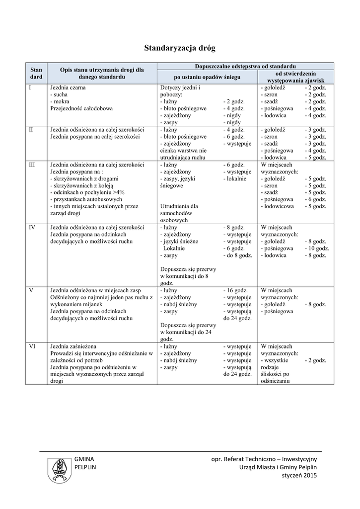 Standaryzacja dróg Stan dard Opis stanu utrzymania drogi dla danego standardu I Jezdnia czarna - sucha - mokra Przejezdność całodobowa II Jezdnia odśnieżona na całej szerokości Jezdnia posypana na całej szerokości III Jezdnia odśnieżona na całej szerokości Jezdnia posypana na : - skrzyżowaniach z drogami - skrzyżowaniach z koleją - odcinkach o pochyleniu >4% - przystankach autobusowych - innych miejscach ustalonych przez zarząd drogi IV Jezdnia odśnieżona na całej szerokości Jezdnia posypana na odcinkach decydujących o możliwości ruchu V VI Jezdnia odśnieżona w miejscach zasp Odśnieżony co najmniej jeden pas ruchu z wykonaniem mijanek Jezdnia posypana na odcinkach decydujących o możliwości ruchu Jezdnia zaśnieżona Prowadzi się interwencyjne odśnieżanie w zależności od potrzeb Jezdnia posypana po odśnieżeniu w miejscach wyznaczonych przez zarząd drogi GMINA PELPLIN Dopuszczalne odstępstwa od standardu od stwierdzenia po ustaniu opadów śniegu występowania zjawisk Dotyczy jezdni i - gołoledź - 2 godz. poboczy: - szron - 2 godz. - luźny - 2 godz. - szadź - 2 godz. - błoto pośniegowe - 4 godz. - pośniegowa - 4 godz. - zajeżdżony - nigdy - lodowica - 4 godz. - zaspy - nigdy - luźny - 4 godz. - gołoledź - 3 godz. - błoto pośniegowe - 6 godz. - szron - 3 godz. - zajeżdżony - występuje - szadź - 3 godz. cienka warstwa nie - pośniegowa - 4 godz. utrudniająca ruchu - lodowica - 5 godz. - luźny - 6 godz. W miejscach - zajeżdżony - występuje wyznaczonych: - zaspy, języki - lokalnie - gołoledź - 5 godz. śniegowe - szron - 5 godz. - szadź - 5 godz. - pośniegowa - 6 godz. Utrudnienia dla - lodowicowa - 5 godz. samochodów osobowych - luźny - 8 godz. W miejscach - zajeżdżony - występuje wyznaczonych: - języki śnieżne - występuje - gołoledź - 8 godz. Lokalnie - 6 godz. - pośniegowa - 10 godz. - zaspy - do 8 godz. - lodowica - 8 godz. Dopuszcza się przerwy w komunikacji do 8 godz. - luźny - zajeżdżony - nabój śnieżny - zaspy Dopuszcza się przerwy w komunikacji do 24 godz. - luźny - zajeżdżony - nabój śnieżny - zaspy - 16 godz. - występuje - występuje - występują do 24 godz. W miejscach wyznaczonych: - gołoledź - pośniegowa - występuje - występuje - występuje - występują do 24 godz. W miejscach wyznaczonych: - wszystkie rodzaje śliskości po odśnieżaniu - 8 godz. - 2 godz. opr. Referat Techniczno – Inwestycyjny Urząd Miasta i Gminy Pelplin styczeń 2015