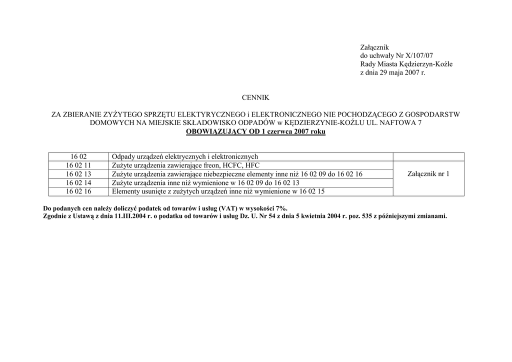 Załącznik do uchwały Nr X/107/07 Rady Miasta Kędzierzyn-Koźle z dnia 29 maja 2007 r. CENNIK ZA ZBIERANIE ZYśYTEGO SPRZĘTU ELEKTYRYCZNEGO i ELEKTRONICZNEGO NIE POCHODZĄCEGO Z GOSPODARSTW DOMOWYCH NA MIEJSKIE SKŁADOWISKO ODPADÓW w KĘDZIERZYNIE-KOŹLU UL. NAFTOWA 7 OBOWIĄZUJĄCY OD 1 czerwca 2007 roku 16 02 16 02 11 16 02 13 16 02 14 16 02 16 Odpady urządzeń elektrycznych i elektronicznych ZuŜyte urządzenia zawierające freon, HCFC, HFC ZuŜyte urządzenia zawierające niebezpieczne elementy inne niŜ 16 02 09 do 16 02 16 ZuŜyte urządzenia inne niŜ wymienione w 16 02 09 do 16 02 13 Elementy usunięte z zuŜytych urządzeń inne niŜ wymienione w 16 02 15 Załącznik nr 1 Do podanych cen naleŜy doliczyć podatek od towarów i usług (VAT) w wysokości 7%. Zgodnie z Ustawą z dnia 11.III.2004 r. o podatku od towarów i usług Dz. U. Nr 54 z dnia 5 kwietnia 2004 r. poz. 535 z późniejszymi zmianami. Załącznik nr 1 odpady z kodu 16xxxx do cennika zuŜytego sprzętu elektrycznego i elektronicznego Odpady KOMPUTERY NOTEBOOKI DRUKARKI KSEROKOPIARKI SPRZĘT AGD [ np. LODÓWKI, PRALKI, KUCHENKI GAZOWE i MIKROFALOWE] TELEFONY, FAXY, DALEKOPISY, TELEFAXY CENTRALE TELEFONICZNE SZAFY KROSOWE i STEROWNICZE SPRZĘT RTV KLAWIATURY MYSZKI KOMPUTEROWE INNE URZĄDZENIA PERYFERYJNE PŁYTKI ELEKTRONICZNE KABLE, TWARDE DYSKI PŁYTY CD NOŚNIKI MAGNETYCZNE SPRZĘT TELEKOMUNIKACYJNY SYSTEMY RADIOWĘZŁOWE KAMERY ZASILACZE ZASILACZE UPS KASY FISKALNE CZYTNIKI KODÓW PASKOWYCH ANTENY KOMUNIKACYJNE MONITORY TELEWIZORY URZĄDZENIA ZAWIERAJĄCE KINESKOPY KABLE ŚWIATŁOWODOWE LODÓWKI i inne urządzenia zawierające freon ŚWIETLÓWKI CARTRIDGE I TONERY Z DRUKAREK LASEROWYCH ATRAMENTOWYCH I KSERO ORAZ KASETY BARWIĄCE [WSZYSTKIE RODZAJE] SPRZĘT ENERGETYCZNY, TRANSFORMATORY PRZEMYSŁOWE, KONDENSATORY PRZEMYSŁOWE, RÓWNIEś ZAWIERAJĄCE PCB Ceny netto 1,00 zł/kg 0,20 zł/szt. 4,00 zł/szt. 14 zł/kg Nietypowe i nie ujęte w tabeli urządzenia i podzespoły elektroniczne oraz usługi mogą wymagać konsultacji i ekspertyzy technicznej, którą zleceniodawca moŜe zlecić firmie „MEGA SERVICE RECYCLING” S.C. w celu ustalenia ceny usługi. Firma „MEGA SERVICE RECYKLING” S.C. odbiera sprzęt bezpłatnie własnym transportem niezaleŜnie od ilości na terenie całego kraju. Załadunek oraz waŜenie wagą elektroniczną są wliczone w cenę usługi.
