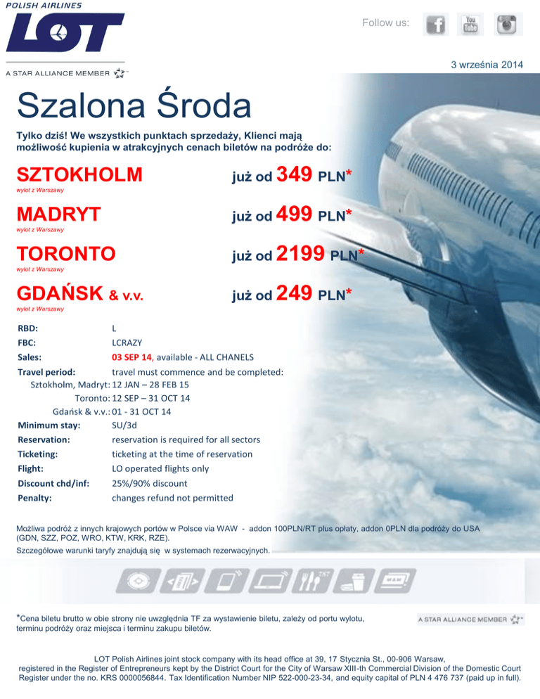 Follow us: 3 września 2014 Szalona Środa Tylko dziś! We wszystkich punktach sprzedaży, Klienci mają możliwość kupienia w atrakcyjnych cenach biletów na podróże do: SZTOKHOLM już od 349 PLN* wylot z Warszawy już od 499 PLN* MADRYT wylot z Warszawy TORONTO już od 2199 PLN* wylot z Warszawy GDAŃSK & v.v. już od 249 PLN* wylot z Warszawy RBD: L FBC: LCRAZY Sales: 03 SEP 14, available - ALL CHANELS Travel period: travel must commence and be completed: Sztokholm, Madryt: 12 JAN – 28 FEB 15 Toronto: 12 SEP – 31 OCT 14 Gdańsk & v.v.: 01 - 31 OCT 14 Minimum stay: SU/3d Reservation: reservation is required for all sectors Ticketing: ticketing at the time of reservation Flight: LO operated flights only Discount chd/inf: 25%/90% discount Penalty: changes refund not permitted Możliwa podróż z innych krajowych portów w Polsce via WAW - addon 100PLN/RT plus opłaty, addon 0PLN dla podróży do USA (GDN, SZZ, POZ, WRO, KTW, KRK, RZE). Szczegółowe warunki taryfy znajdują się w systemach rezerwacyjnych. *Cena biletu brutto w obie strony nie uwzględnia TF za wystawienie biletu, zależy od portu wylotu, terminu podróży oraz miejsca i terminu zakupu biletów. LOT Polish Airlines joint stock company with its head office at 39, 17 Stycznia St., 00-906 Warsaw, registered in the Register of Entrepreneurs kept by the District Court for the City of Warsaw XIII-th Commercial Division of the Domestic Court Register under the no. KRS 0000056844. Tax Identification Number NIP 522-000-23-34, and equity capital of PLN 4 476 737 (paid up in full).